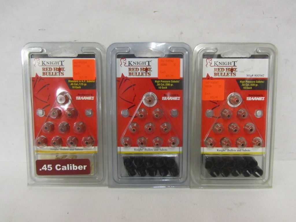 ONE PACKAGE OF 10 KNIGHT 45CAL HOLLOW POINT SABOTS, TWO PACKAGES OF 10 KNIGHT 50CAL HOLLOW POINT SABOTS.
