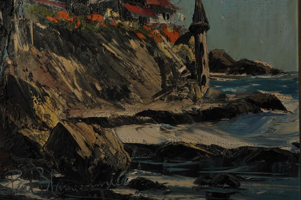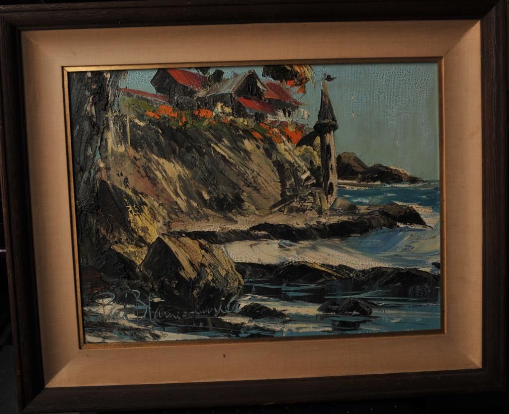 Paul Blaine Henry original painting. The painting is in good overall condition depicting a seaside house overlooking the ocean. The painting demonstrates vivid colors and movement. The painting is wellframed in wood measuring approximately 31” x 25”. Est.: $300-$600.
