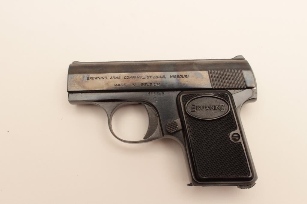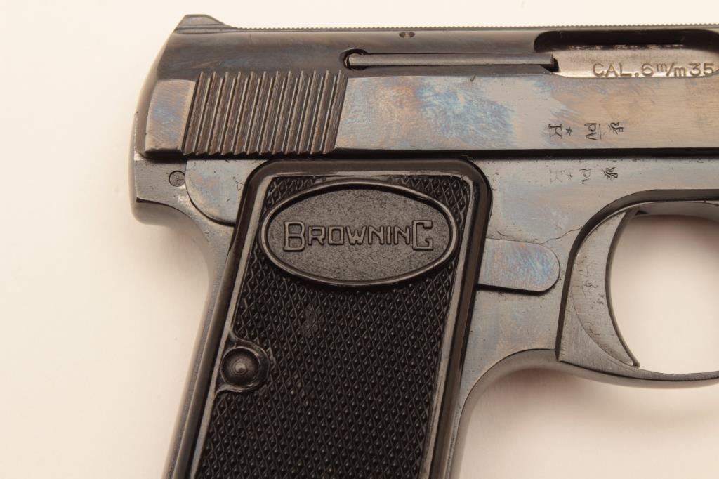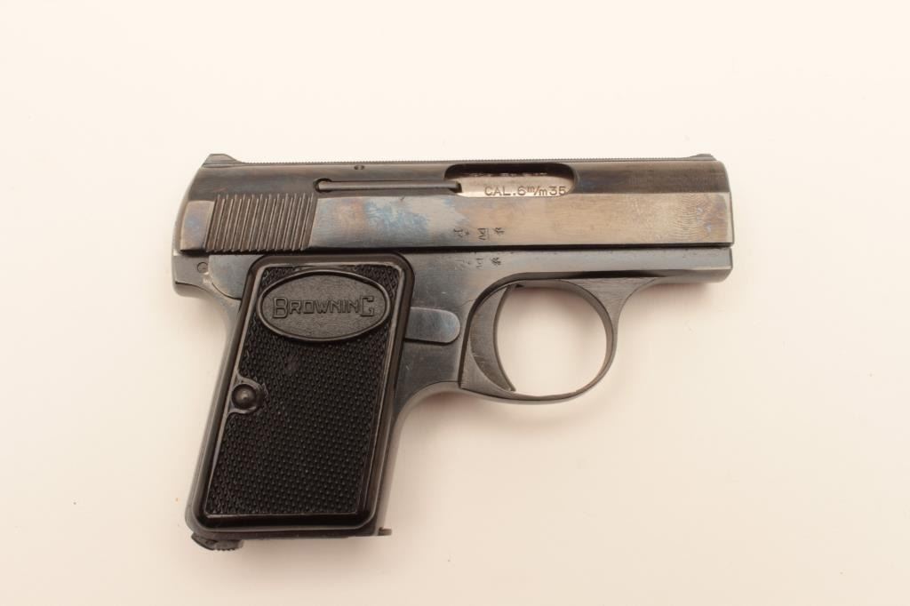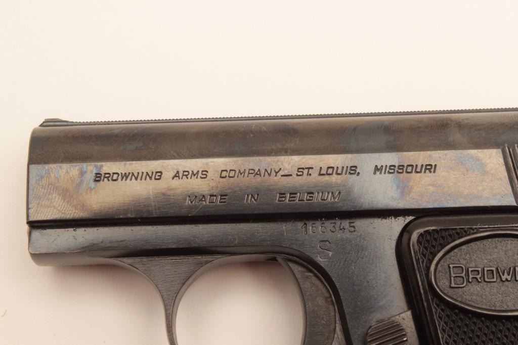 Baby Browning Pocket .25 semi-automatic pistol, .25 caliber, Serial #466345. The pistol is in excellent overall condition with a 2” barrel. The pistol retains approximately 99% of its blue finishappearing nearly new. The checkered plastic Browning marked grips are in excellent condition. The bore is excellent, the action crisp and markings are sharp on this mint specimen. The lot includes one correctmagazine. Est.: $350-$700. (Modern).