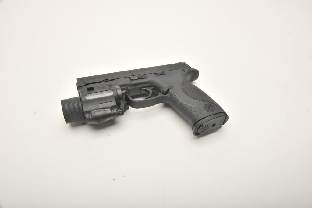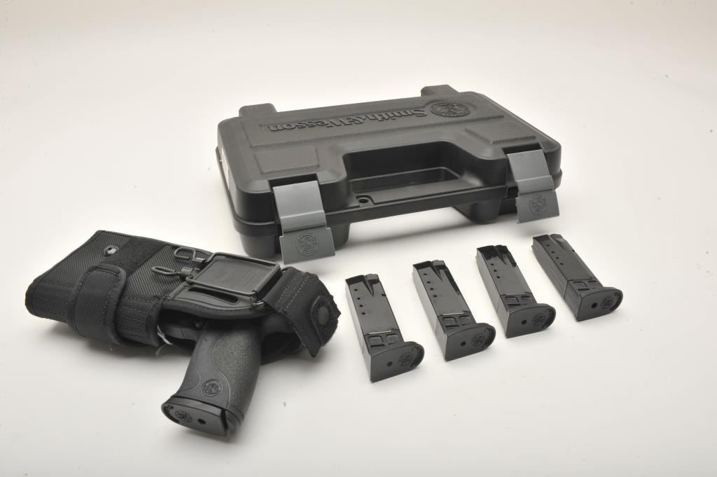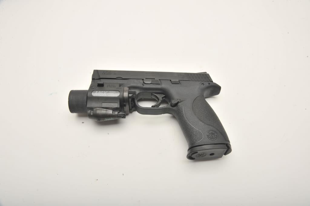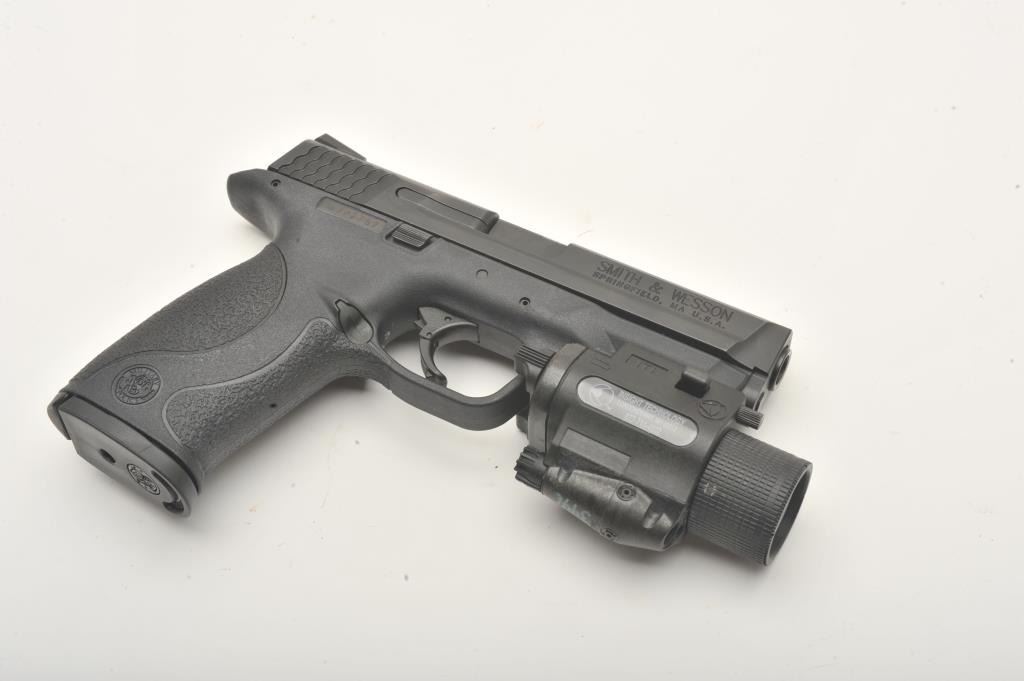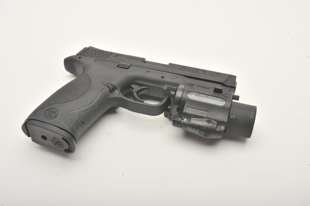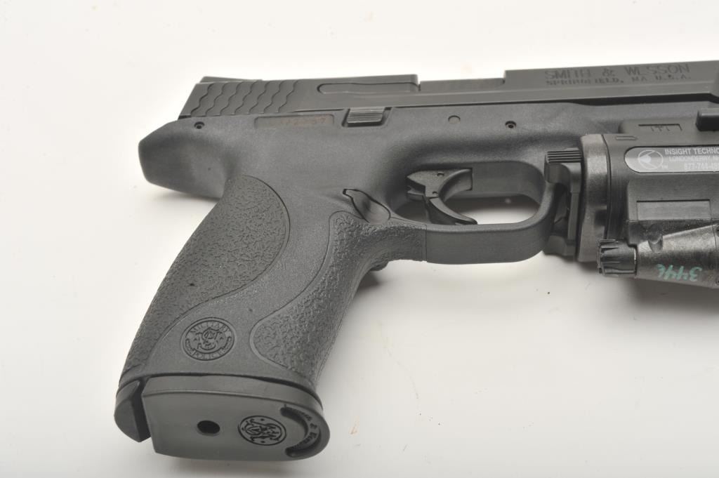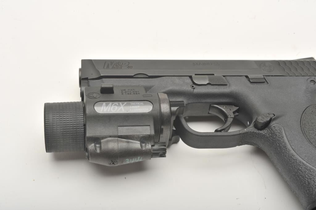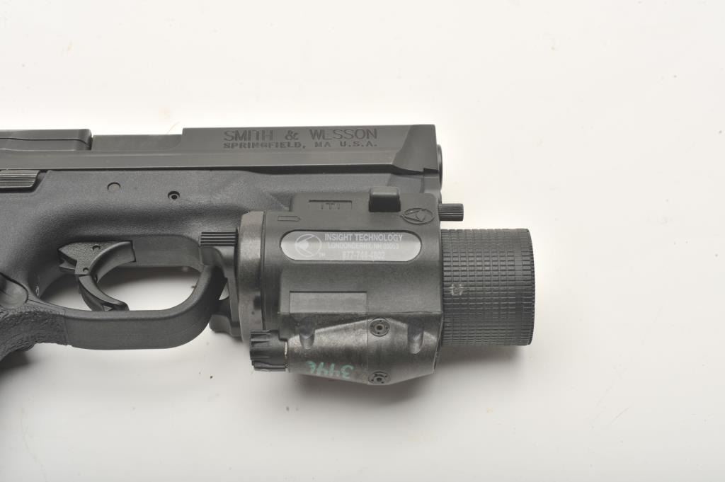 Smith & Wesson Model M&P 40 semi-automatic pistol, .40 caliber, 4.25” barrel, mat black finish, polymer grips, Insight Tech. under barrel combination flashlight and laser attachment, four extra magazines, wovenblack tactical holster, instructions and hard carry case, S/N MPP2757, in overall fine condition displaying minimal use or handling. (Modern/PPT). Est.: $325-$650.