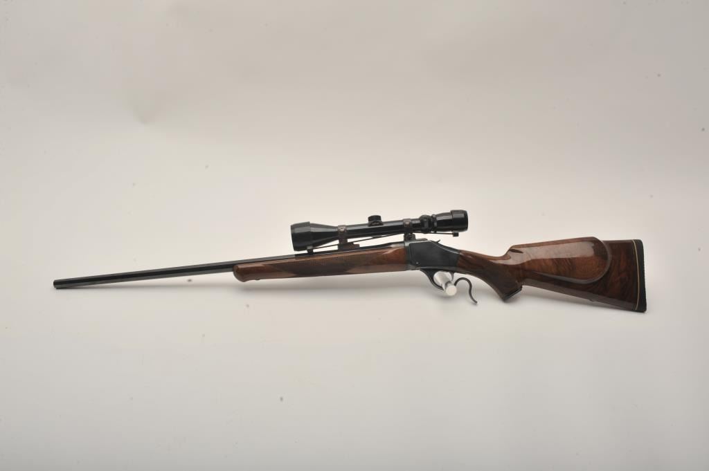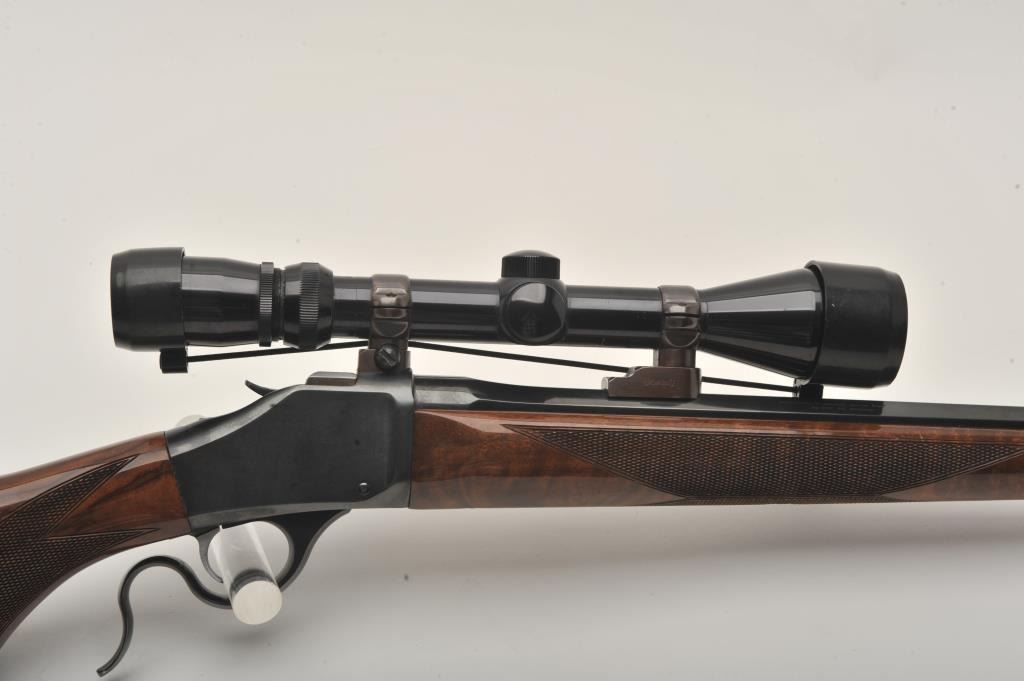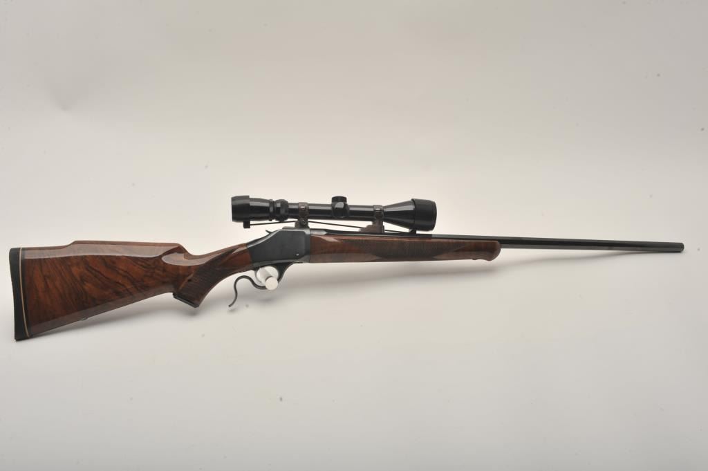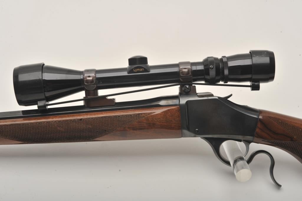Browning High Wall single shot rifle, .30-06 caliber, 26” octagon barrel, blued finish, checkered deluxe grain wood stocks, S/N W4710289, mounted with a Lyman scope displaying crisp optics; gun is in overallfine condition with majority of original finish, fine bore, crisp action, sharp markings and fine wood stock. (Modern): Est.: $500-$1,000.