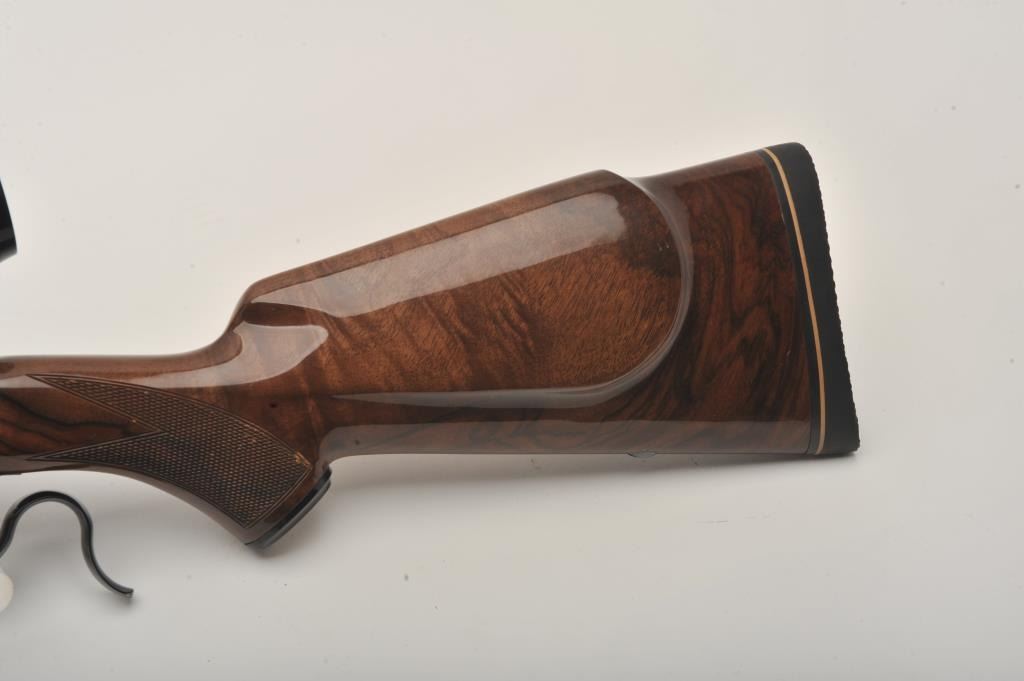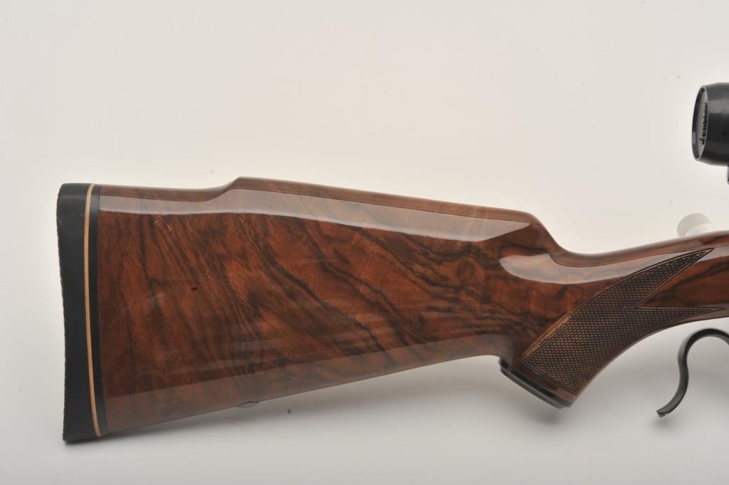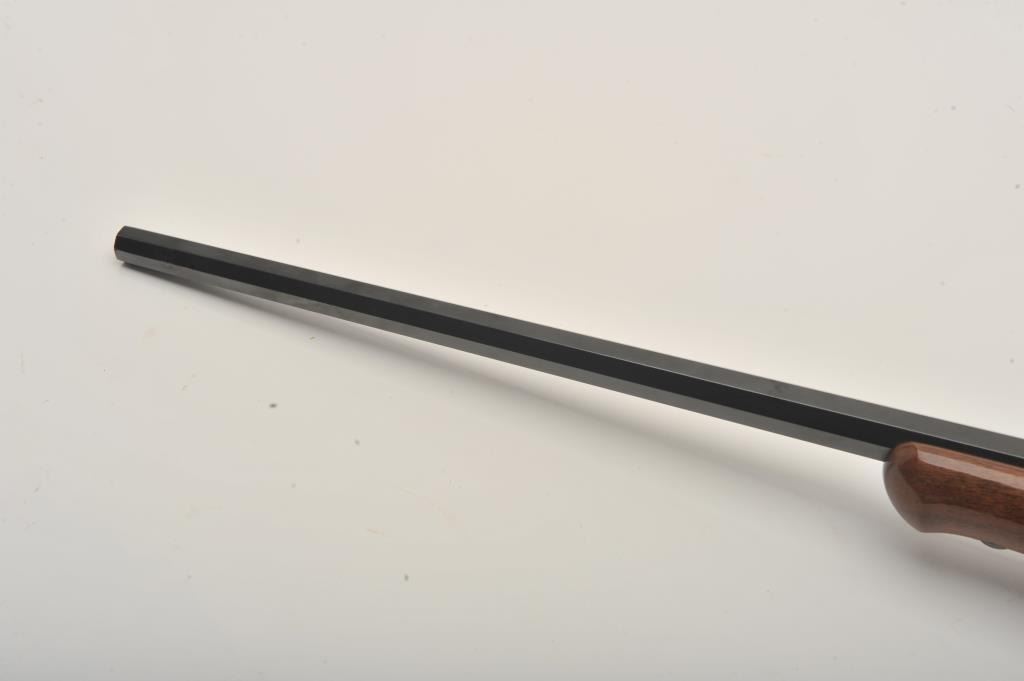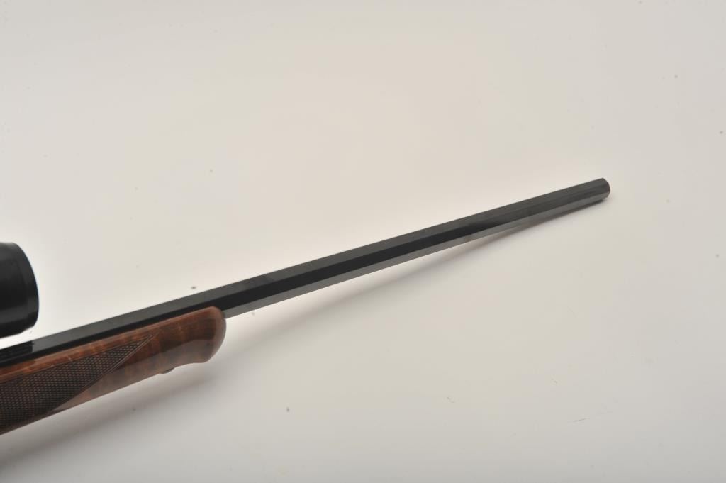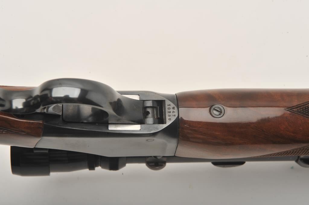 Browning High Wall single shot rifle, .30-06 caliber, 26” octagon barrel, blued finish, checkered deluxe grain wood stocks, S/N W4710289, mounted with a Lyman scope displaying crisp optics; gun is in overallfine condition with majority of original finish, fine bore, crisp action, sharp markings and fine wood stock. (Modern): Est.: $500-$1,000.