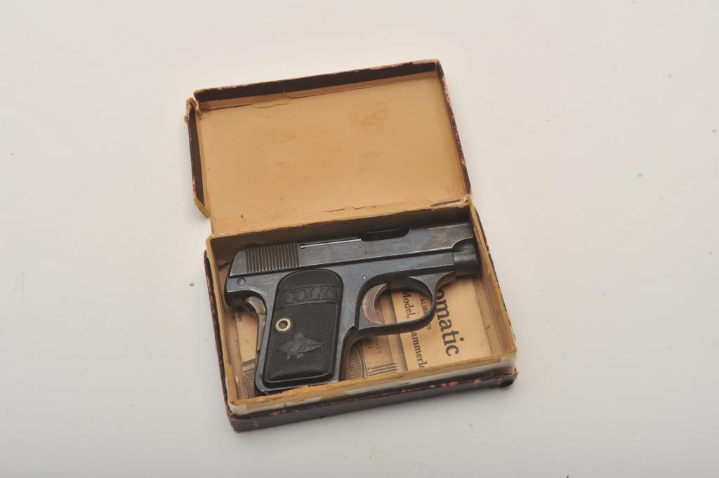 Colt 1908 semi-automatic pistol, .25 auto caliber, Serial #7125. The pistol is in very good overall condition in the original factory box. The pistol retains the majority of its blue finish with wear at the muzzleand muted case hardening visible on the trigger and grip safety. The checkered hard rubber Colt marked grips are in very good condition with only handling marks. The bore is good, the action is crisp and markingsare sharp. The lot includes one correct magazine and the original maroon cardboard factory box with owner’s manual. The box is in fair condition with obvious wear and broken corners. Est.: $500-$1,000. (C+R).