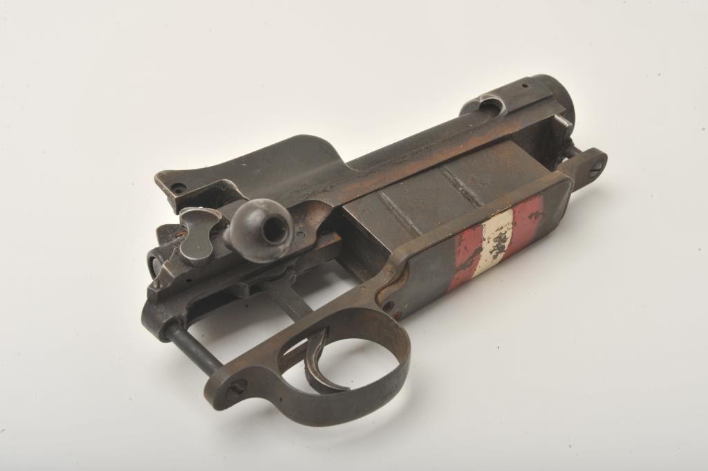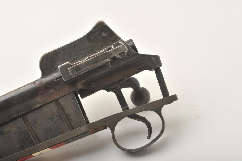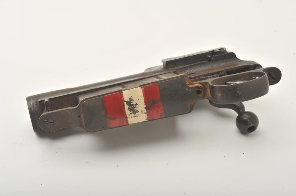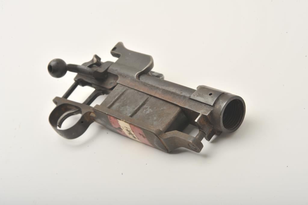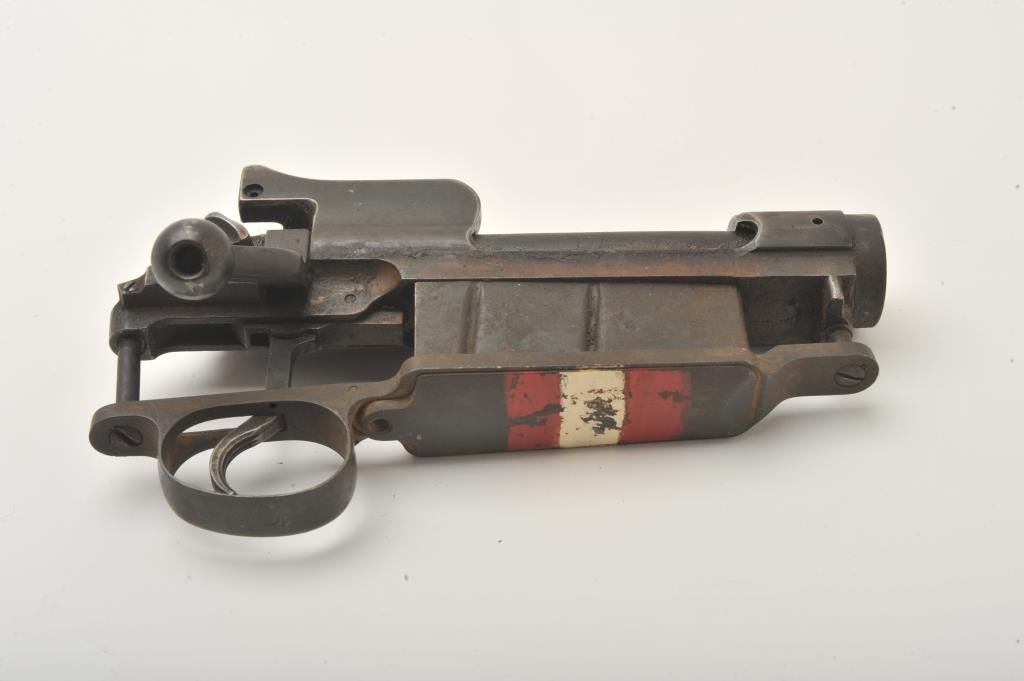 Eddystone Enfield Model 1917 bolt action receiver, Serial #291464. The receiver is in good overall condition with mars and scrapes consistent with use. The metal surfaces retain some original military finish with alight coat of storage grease and red and white paint on the magazine base and action. The front ring is marked, “RE” and the wings are retained at the rear of the action. Est.: $125-$250. (C+R).