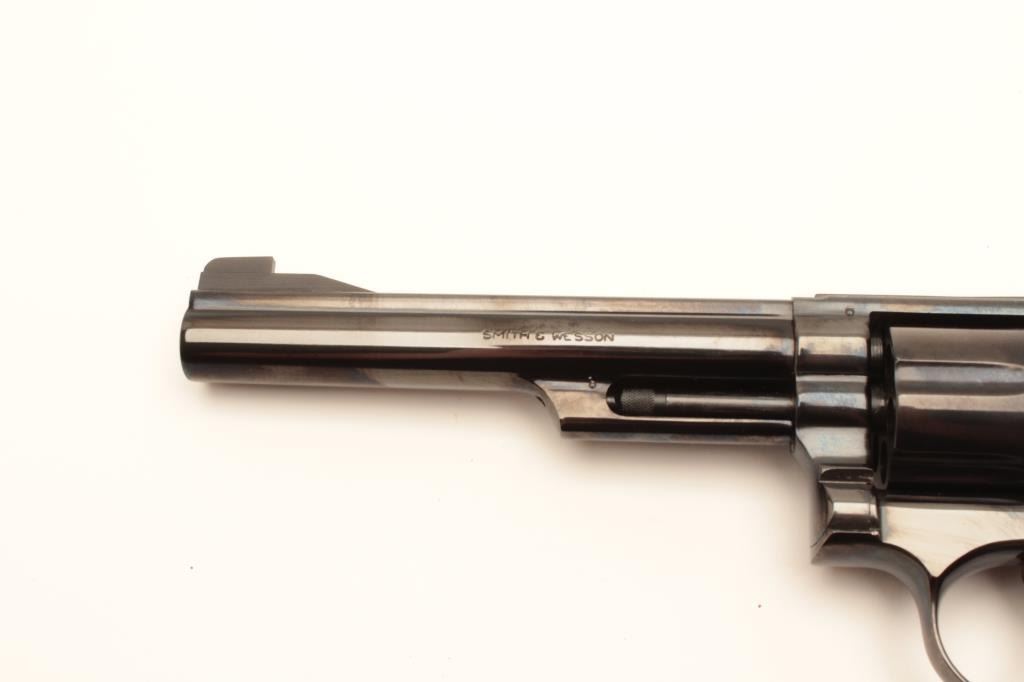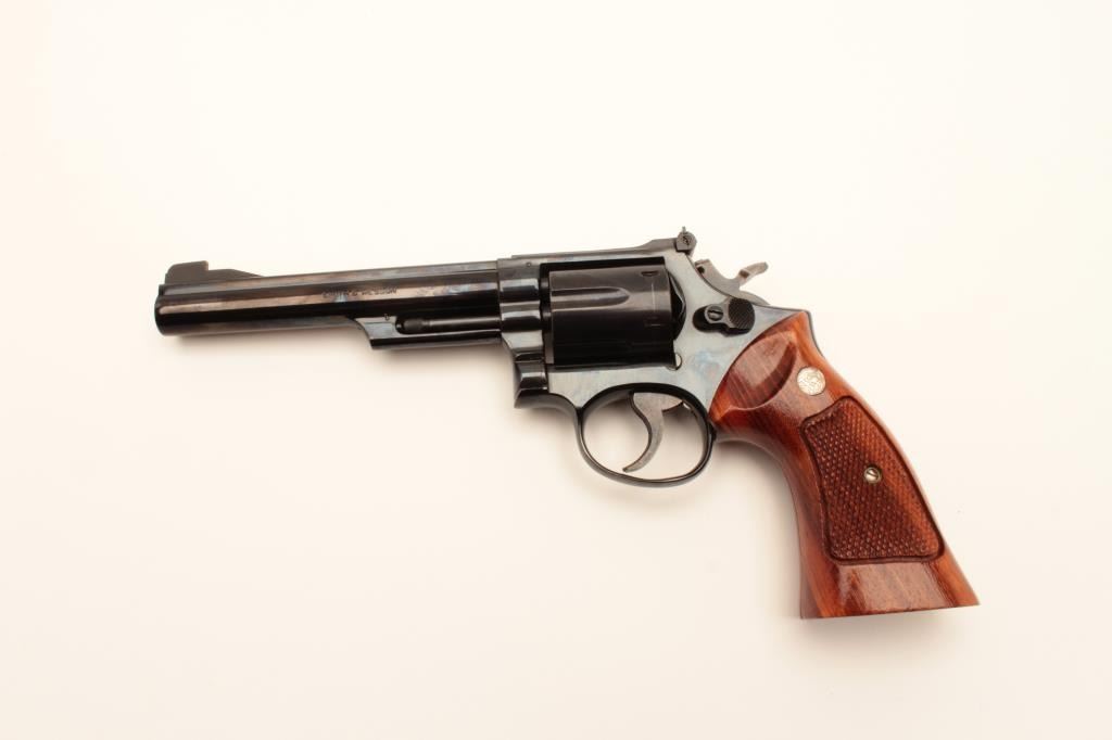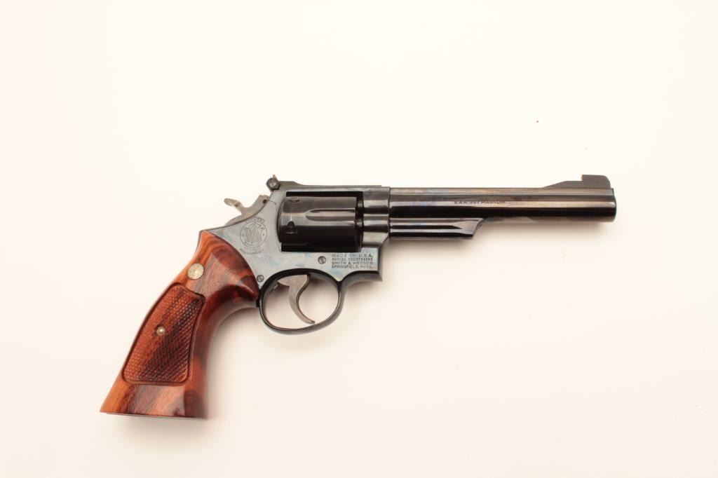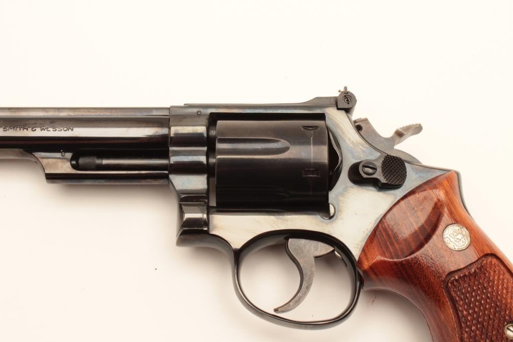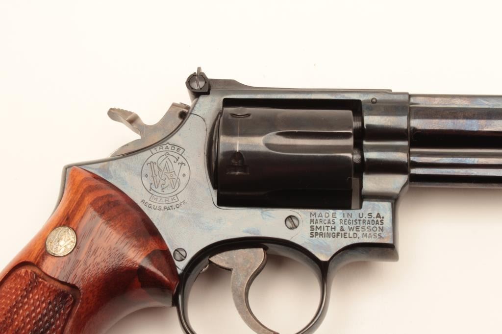 Smith and Wesson Model 19-3 revolver, .357 Magnum caliber, Serial #9K3784. The pistol is in excellent overall condition with a 6” barrel. The metal surfaces retain nearly all of their blue finish with vivid casehardening on the hammer and trigger and a slight index line on the cylinder. The checkered wood gold medallion grips are in excellent condition with sharp checkering noted. The bore is very good, the action iscrisp and markings are sharp on this desirable, high condition pistol which has seen little if any use. Est.: $500-$1,000. (Modern).