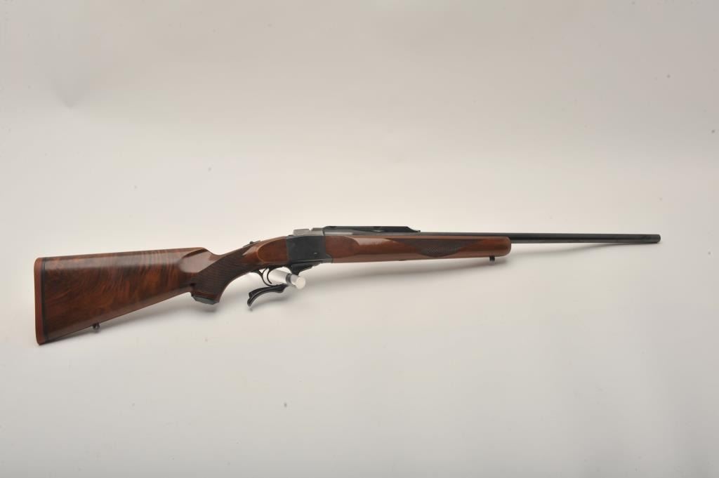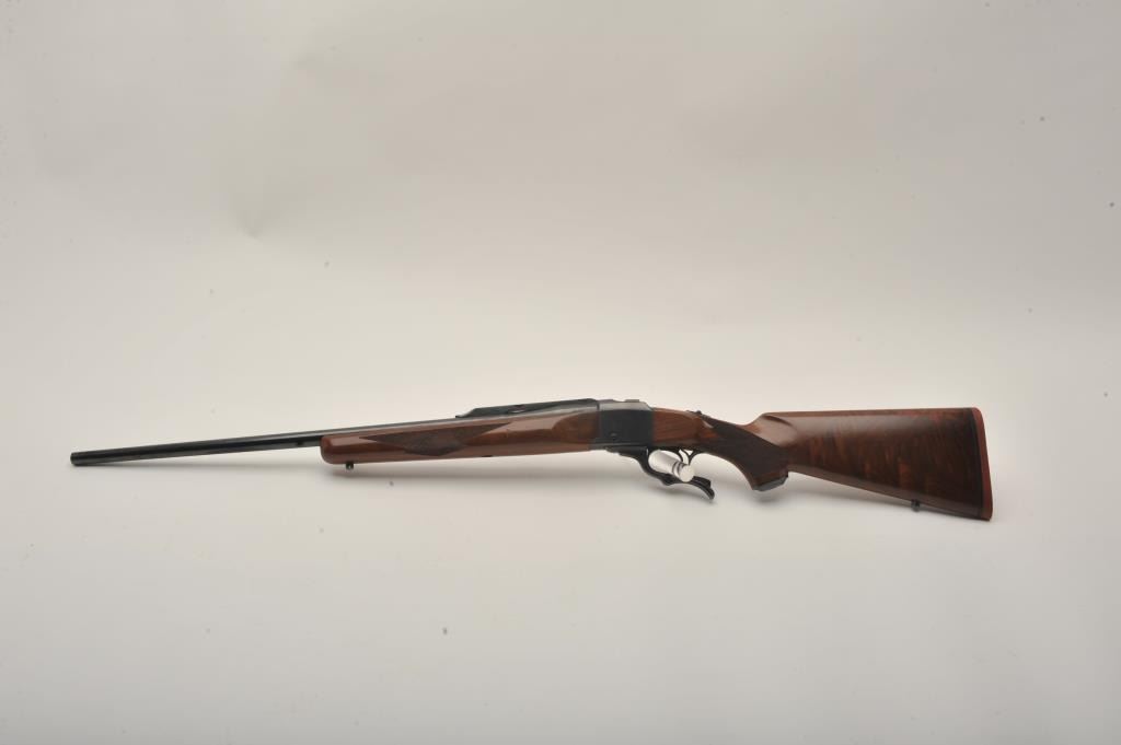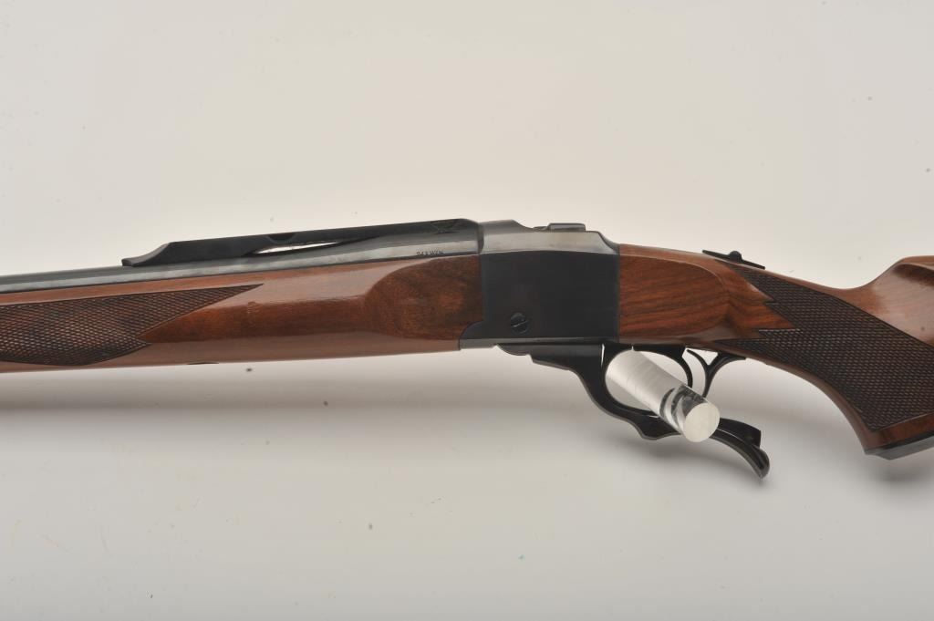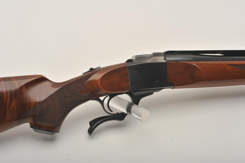 Ruger No. 1 single shot rifle, .243 Winchester caliber, Serial #131-24192. The rifle is in very good to nearly fine overall condition with a 26” barrel. The metal surfaces retain nearly all of their bluefinish with light wear at the muzzle and handling marks. The rifle features an integral rib for scope mounting and the desirable tang safety. The checkered wood stock shows beautiful figure in the buttstock and ends with a red, Ruger marked rubber recoil pad. The bore is good, the action is crisp and markings are sharp. Est.: $600-$1,200. (Modern).