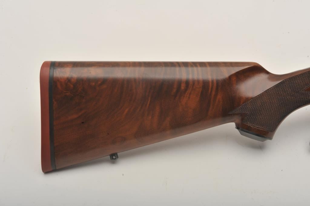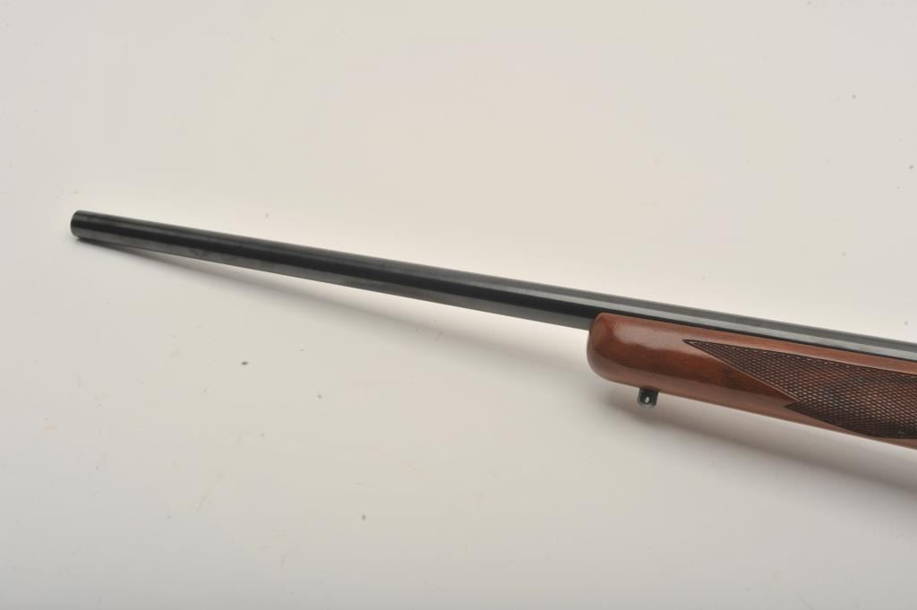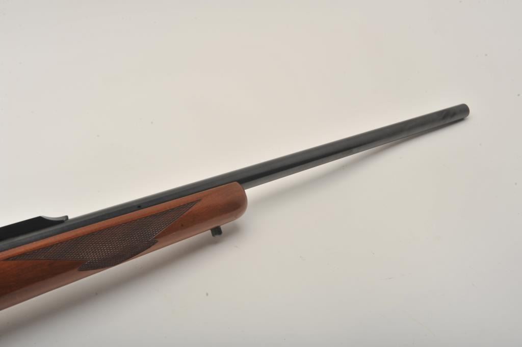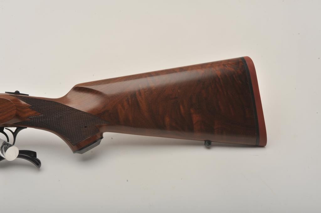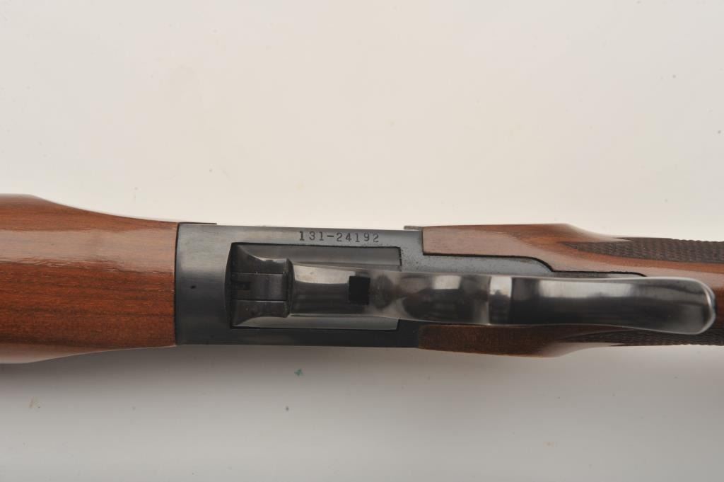 Ruger No. 1 single shot rifle, .243 Winchester caliber, Serial #131-24192. The rifle is in very good to nearly fine overall condition with a 26” barrel. The metal surfaces retain nearly all of their bluefinish with light wear at the muzzle and handling marks. The rifle features an integral rib for scope mounting and the desirable tang safety. The checkered wood stock shows beautiful figure in the buttstock and ends with a red, Ruger marked rubber recoil pad. The bore is good, the action is crisp and markings are sharp. Est.: $600-$1,200. (Modern).