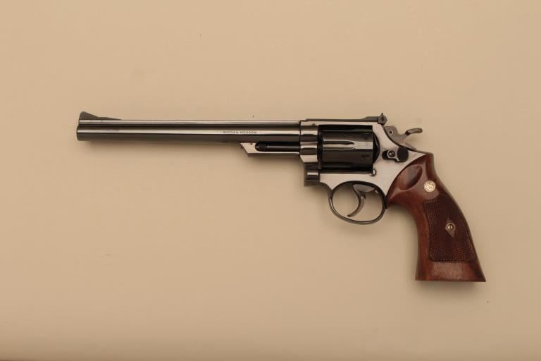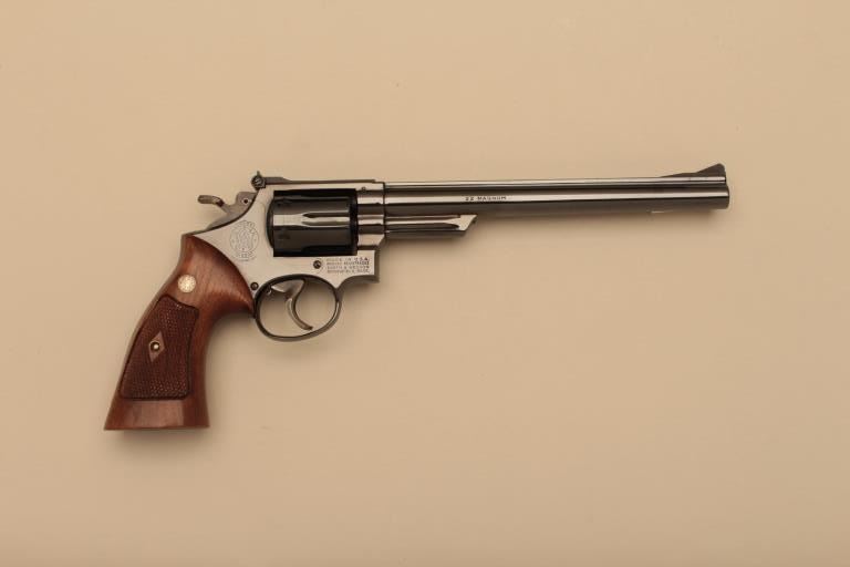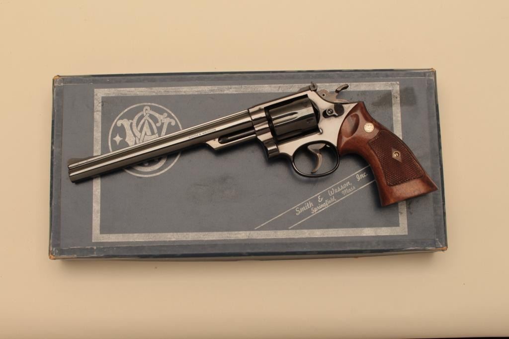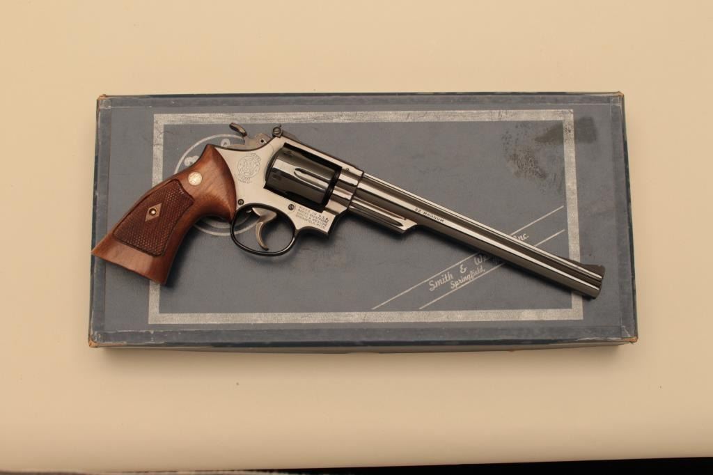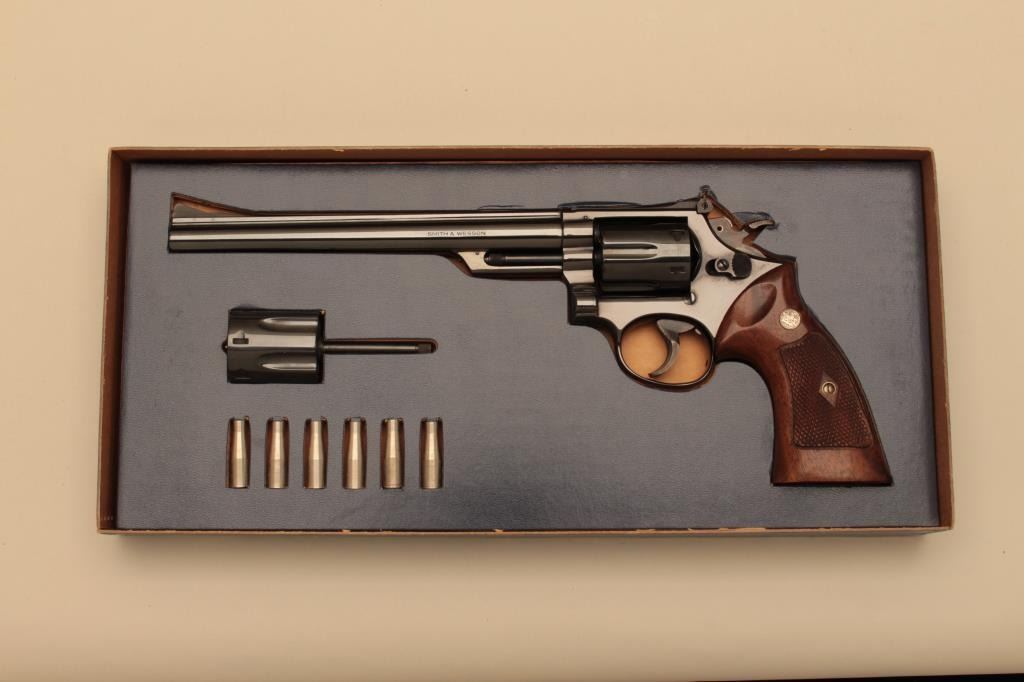 Smith & Wesson Model 53-2 DA revolver, .22 Magnum (Jet) caliber, 8-3/8” barrel, blued finish, checkered wood medallion combat grips with extra cylinder and inserts, S/N 2K93376; in like new condition with factorytwo piece cardboard box, end label numbered to this gun, instructions sheet and red tag special instructions for guns fitted with auxiliary cylinder. (Modern/NO CAL. SALE). Est.: $1,250-$2,500.