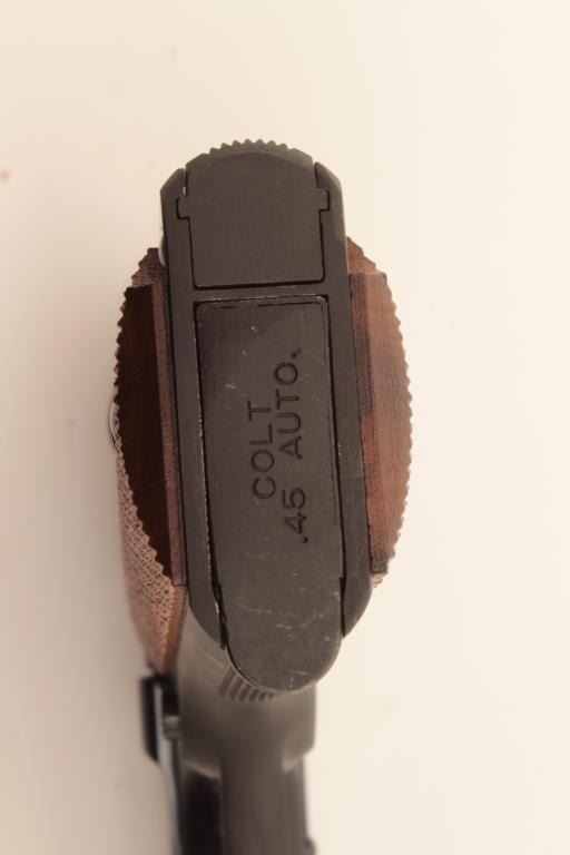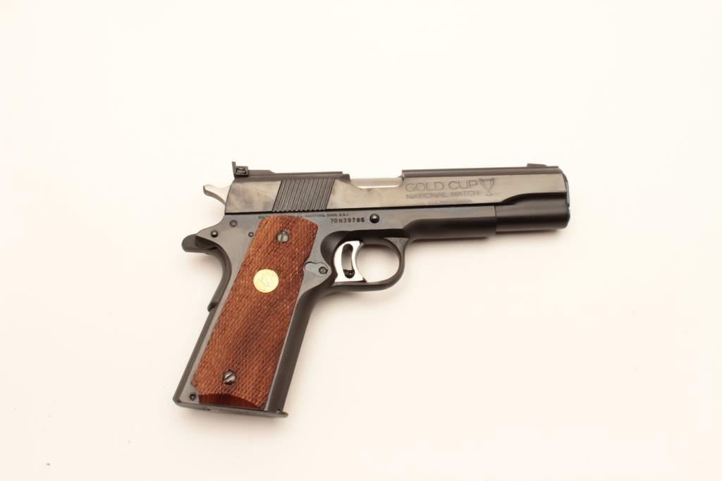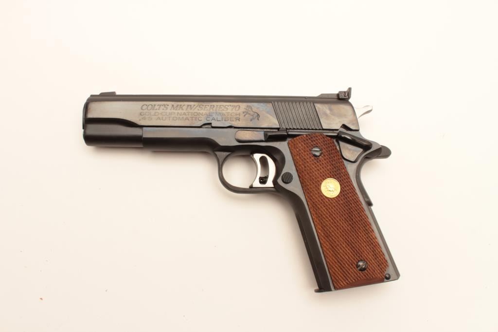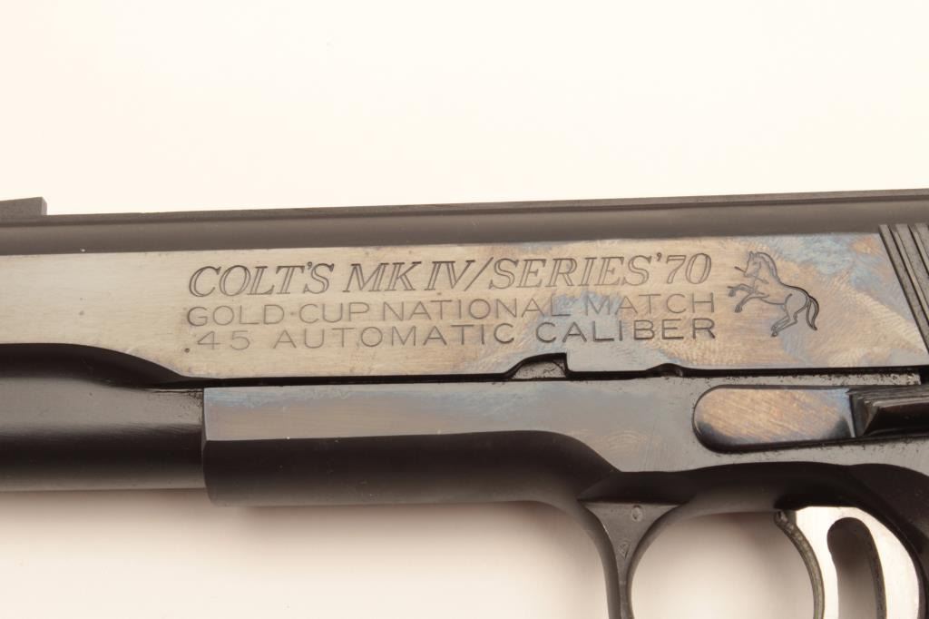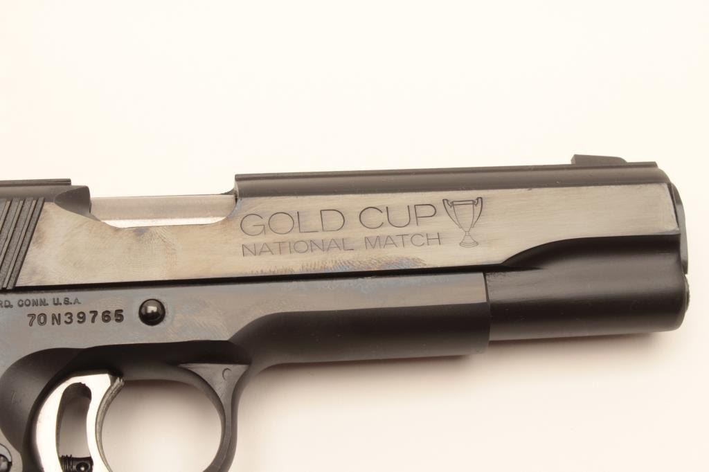 Colt Mk. IV Series 70 Gold Cup National Match semi-automatic pistol, .45 caliber, Serial #70N39765. The pistol is in excellent overall condition with a 5” barrel showing little to no use. The pistol retainsapproximately 99% of its blue finish with only light handling marks. The checkered wood gold medallion grips are in excellent conditioning with sharp checkering. The bore is excellent, the markings are sharp andaction is crisp. The lot includes one correct, Colt marked magazine. This Gold Cup appears nearly new with almost no use. Est.: $1,400-$2,800. (Modern).