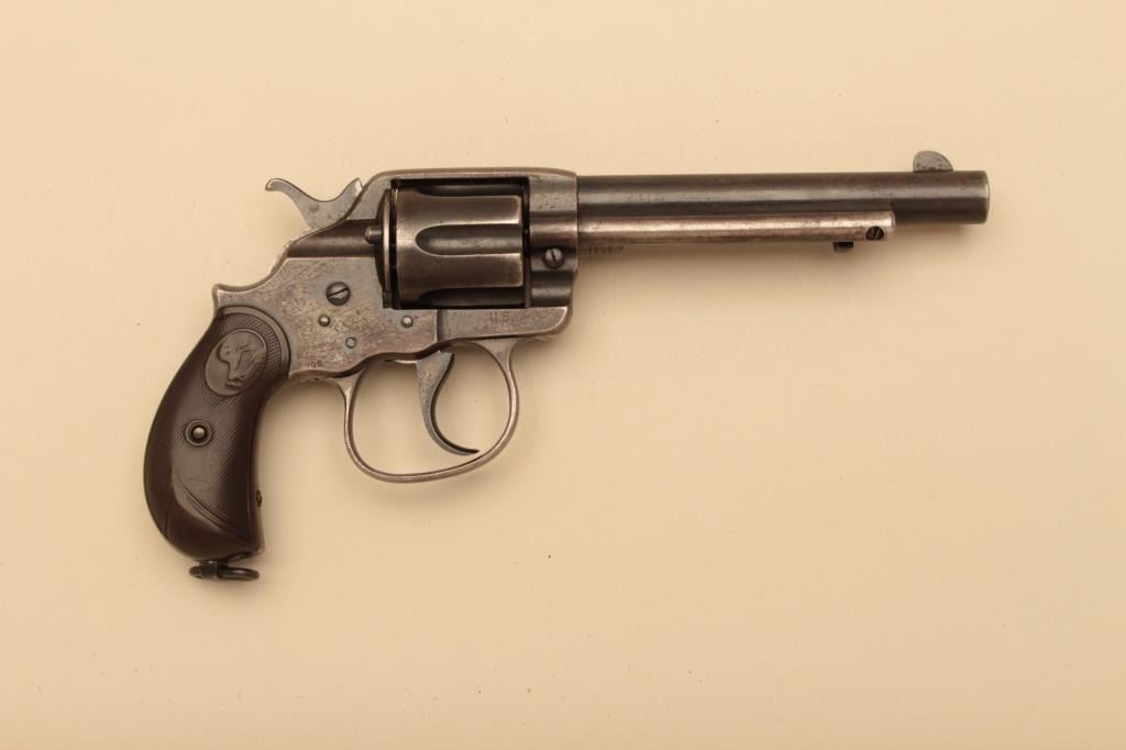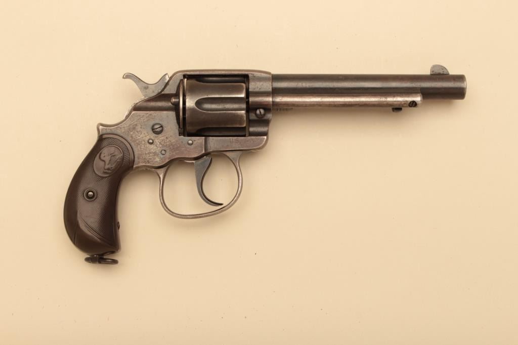 Colt Model 1902 Philippine Model .45 Colt caliber military issue revolver, S/N 46787. Inspected by R.A.C. and J.T.T. with a 5 ½” barrel and 50%-70% original toning blue with minor erosion and pinprick pitting. The grips are good with edge wear and smoothing to checkering. Good markings. Cylinder pin is an old replacement. 1 of approximately 5000 made when Moros were not stopped by .38 calibers. The large trigger was to increasefulcrum on the hammer in order to fire military ammo more surely. Good action and good bore. Erroneously identified as “Alaskan Model”. (C&R/No PPT) Est.: $1400-$2800