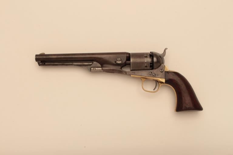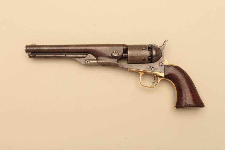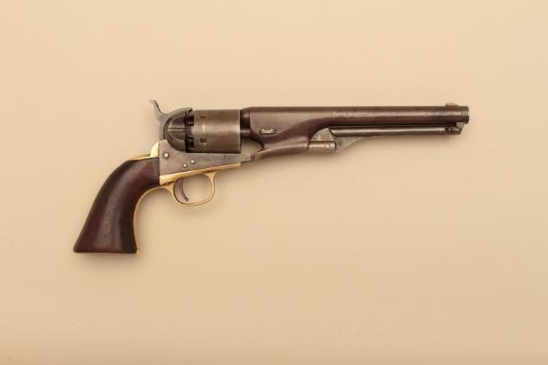 Colt 1861 Navy revolver in .36 caliber percussion, S/N 15760. Good to very good condition with strong traces of original blue and case colors mixed in a pleasing natural patina. Smooth metal surfaces with minorerosion and slight pin prick pitting. 15%-25% light cylinder scene. Good barrel address and Colt Patent. The grips are good plus to very good with small loss at the right toe. All matching visible numbers and workingaction. (Antique) Est.: $1750-$3500