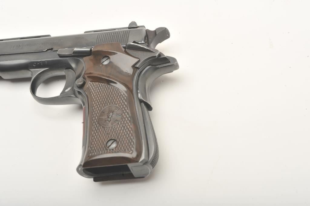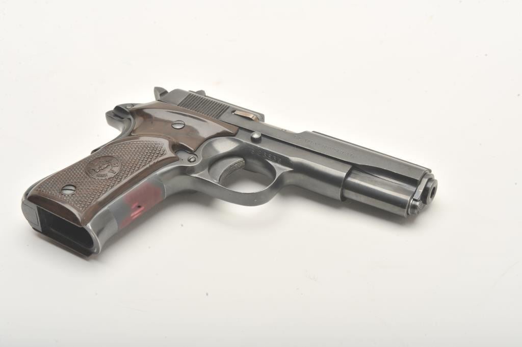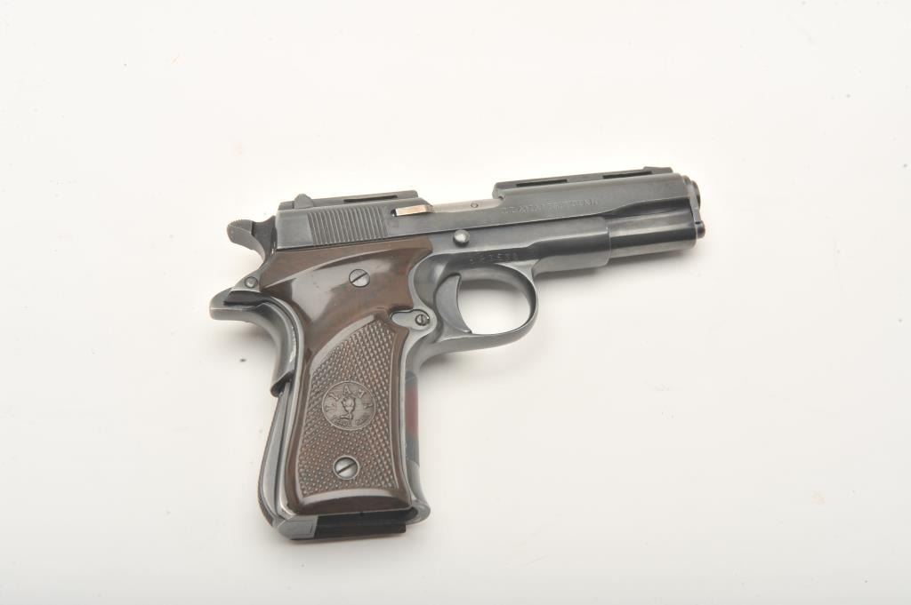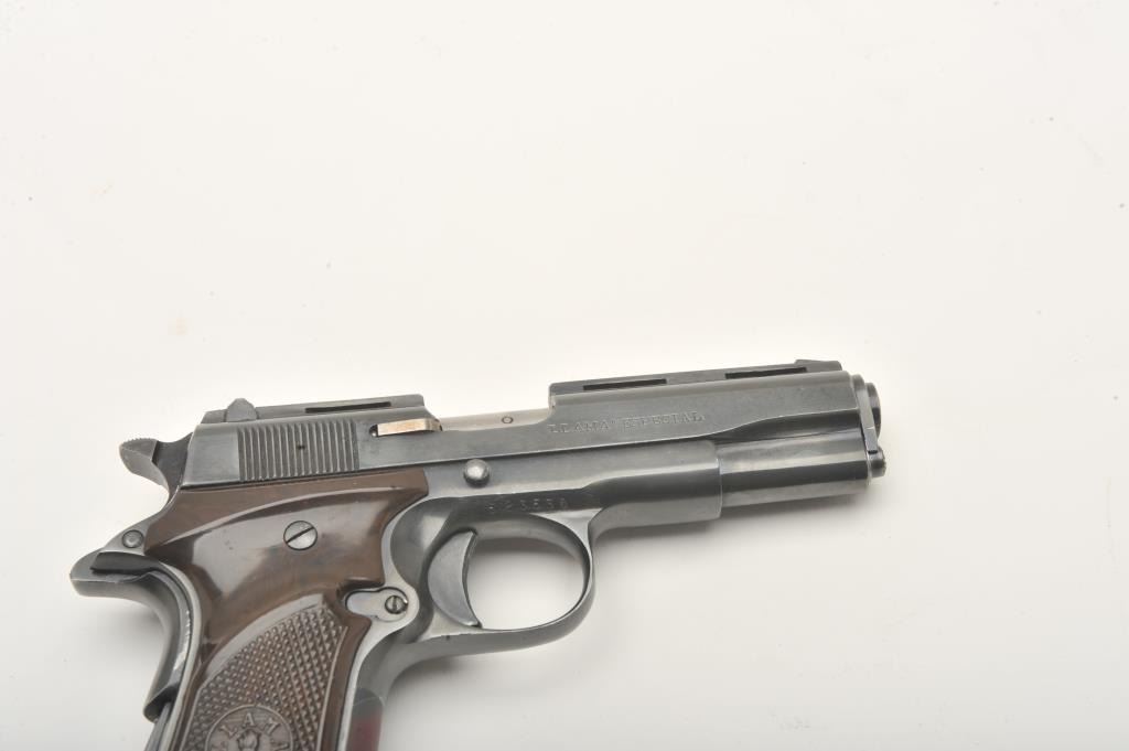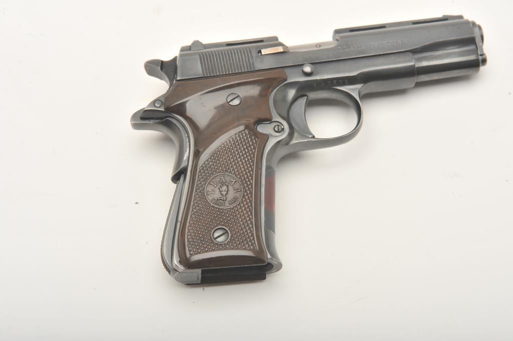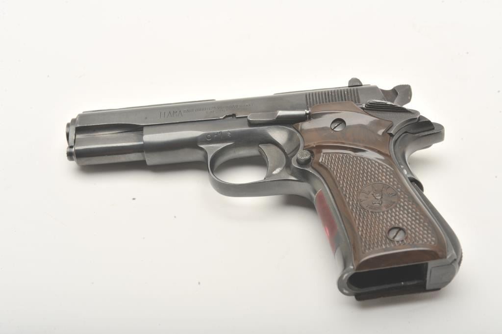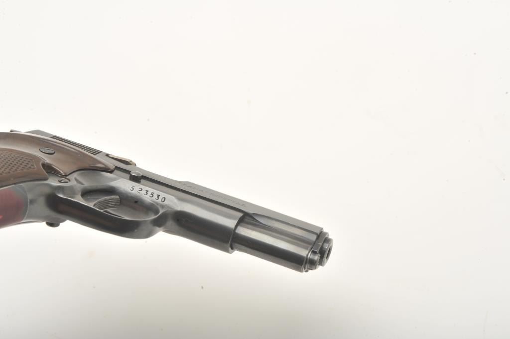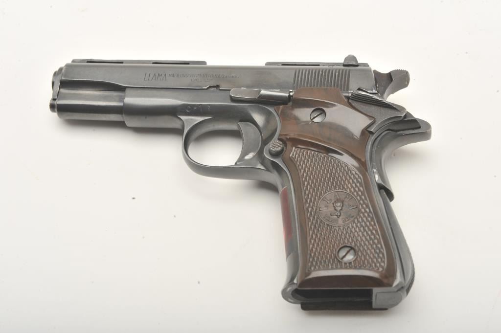 Llama Especial semi-automatic pistol, .22 caliber, Serial #523530. The pistol is in very good overall condition with a 3 ½” barrel. The pistol shows light wear at the muzzle with a full-length ventilated rib ontop of the slide. The checkered plastic grips are in very good condition showing primarily handling marks. The bore is good, the action is crisp and markings are sharp. The lot includes no magazine and a blackleather browning marked gun rug. Est.: $250-$500. (Modern).
