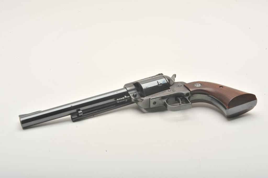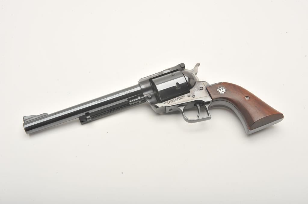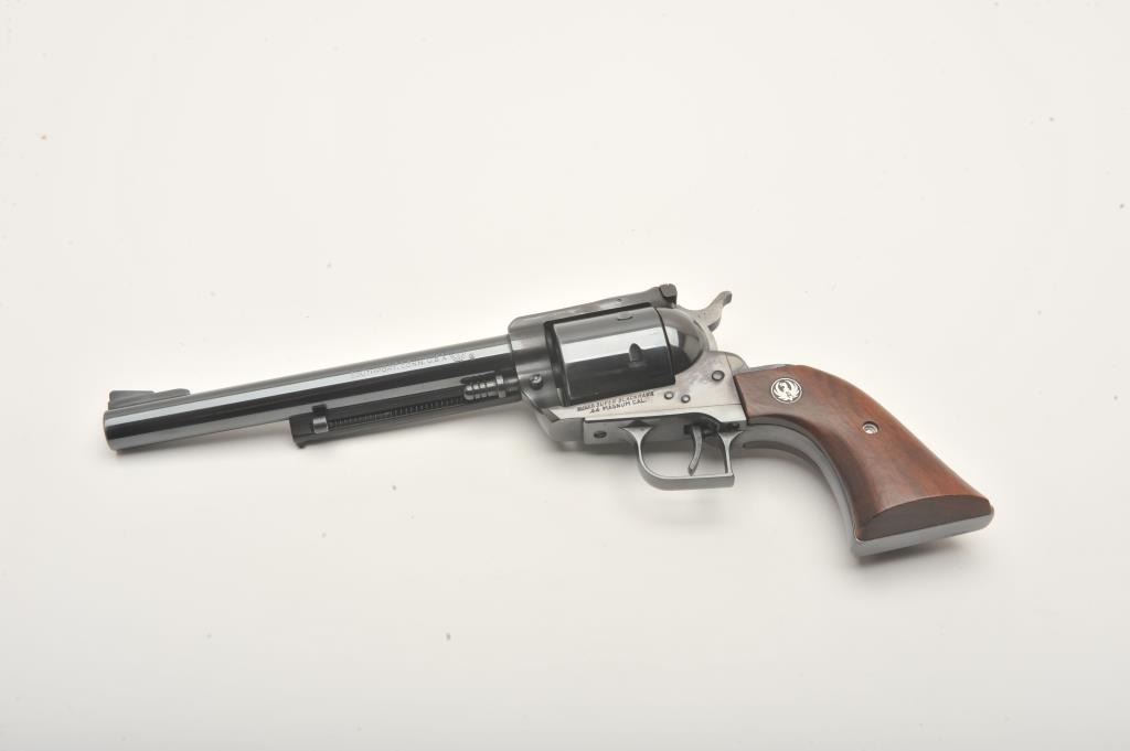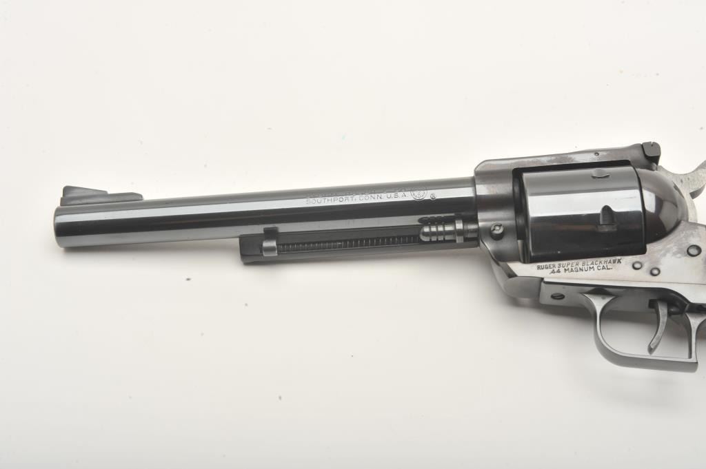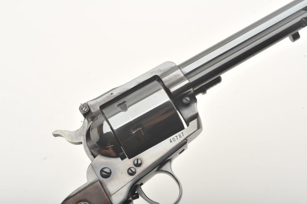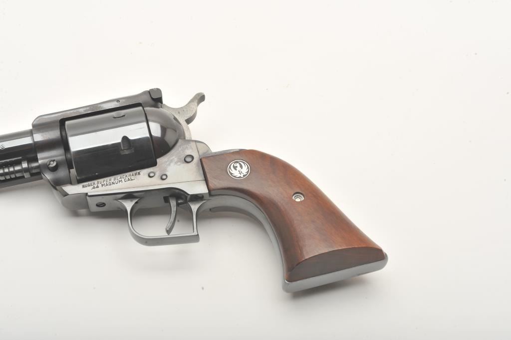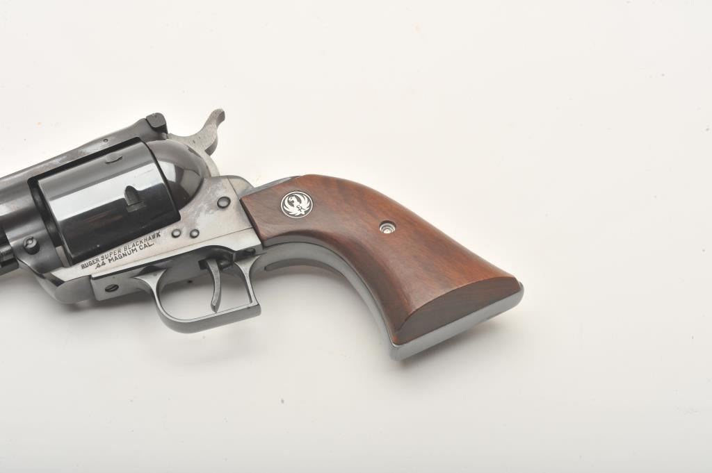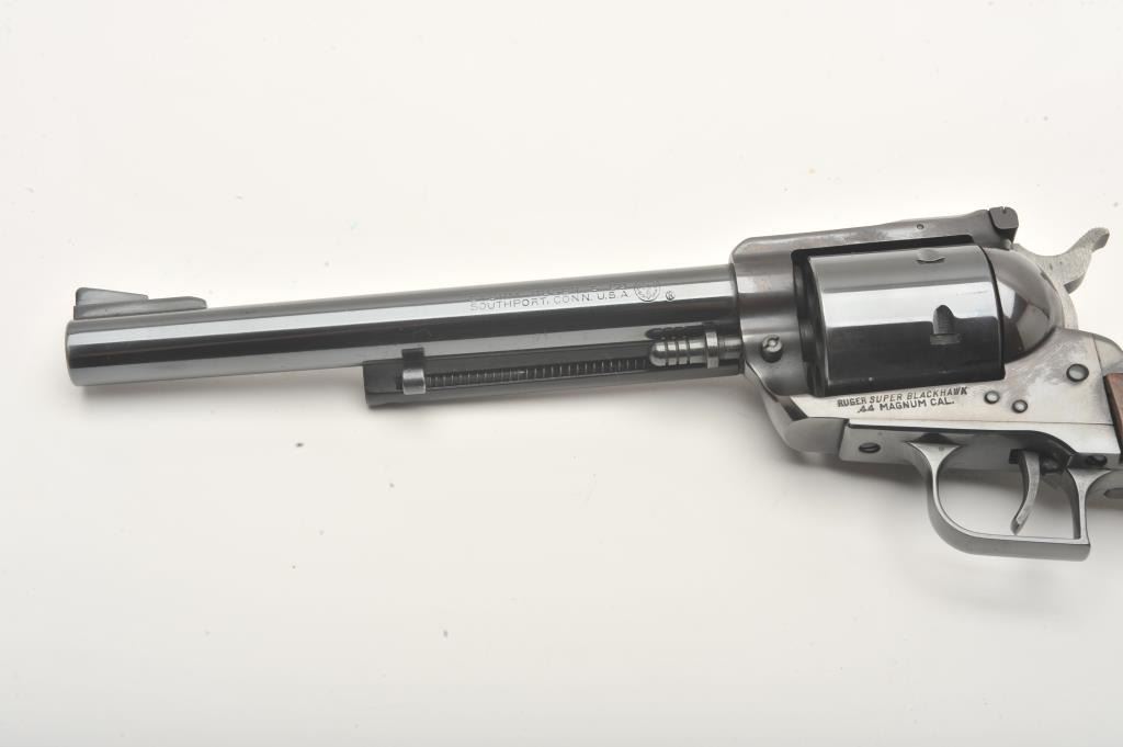 Ruger Super Blackhawk revolver, .44 Magnum caliber, Serial #40787. The pistol is in fine overall condition with a 7 ½” barrel. The pistol retains nearly all of its high polish blue finish with light wear at themuzzle and a faint drag line on the cylinder. The smooth wood medallion grips are in very good condition with only light storage marks. The bore is very good, the markings are sharp and action is crisp. Est.:$300-600. (Modern).