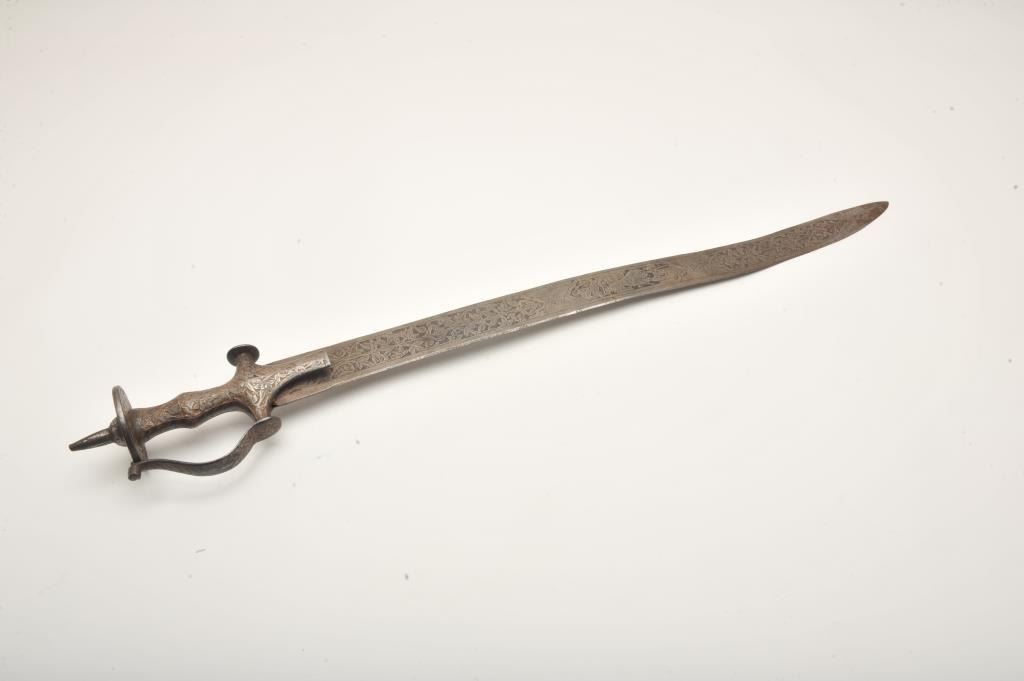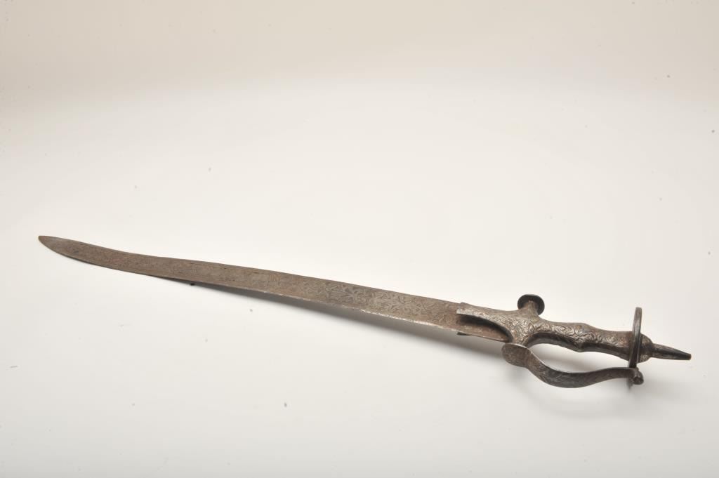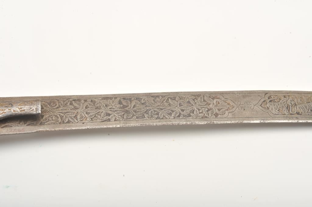 Finely engraved Tulwar sword, no sheath, approximately 33” overall with engraved coverage of the blade and grip; nice patina. Est.: $200-$400