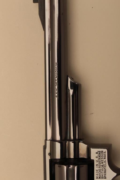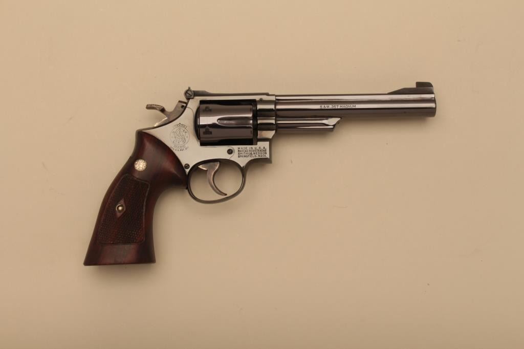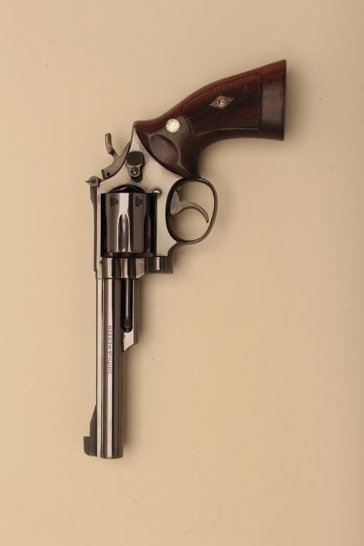 Smith & Wesson Model 19-2 revolver, .357 Magnum caliber, Serial #K628436. The pistol is in fine overall condition with a 6” barrel with a ramp front and adjustable rear sights. The pistol retains nearly all of its blue finish with light handling marks and a faint drag line on the cylinder. The hammer and trigger show beautiful muted case hardening. The checkered wood medallion grips are in very good condition with sharpcheckering and light storage marks. The bore is very good, the action crisp and markings are sharp on this desirable Smith & Wesson. Est.: $500-$1,000. (Modern).