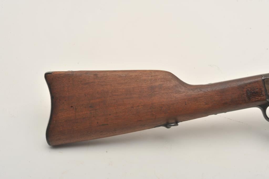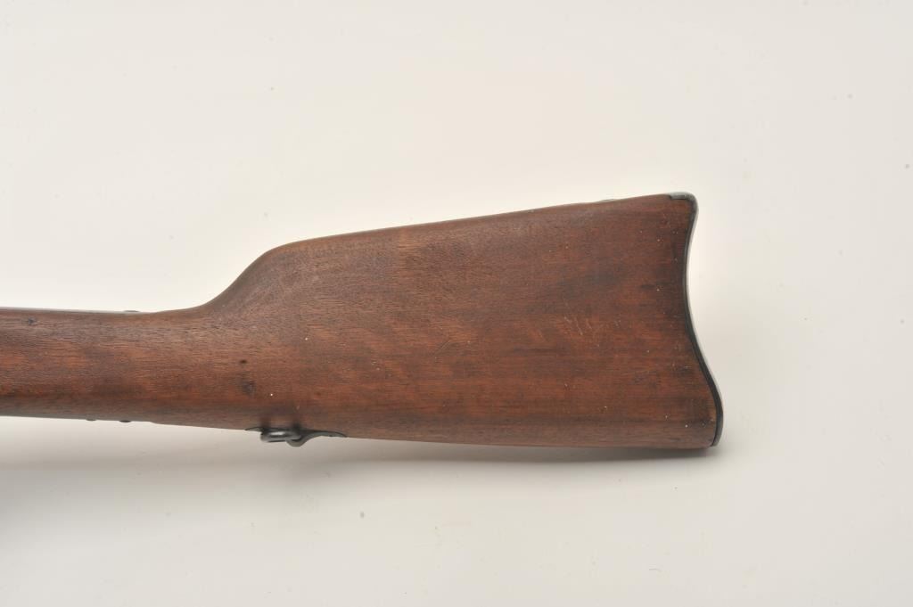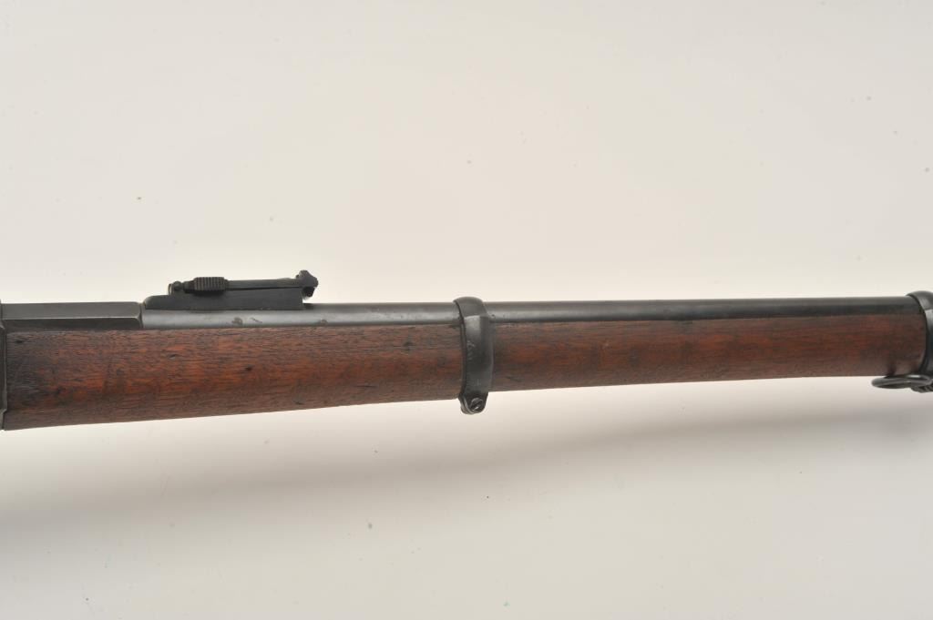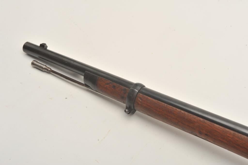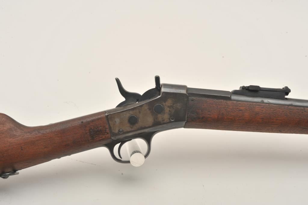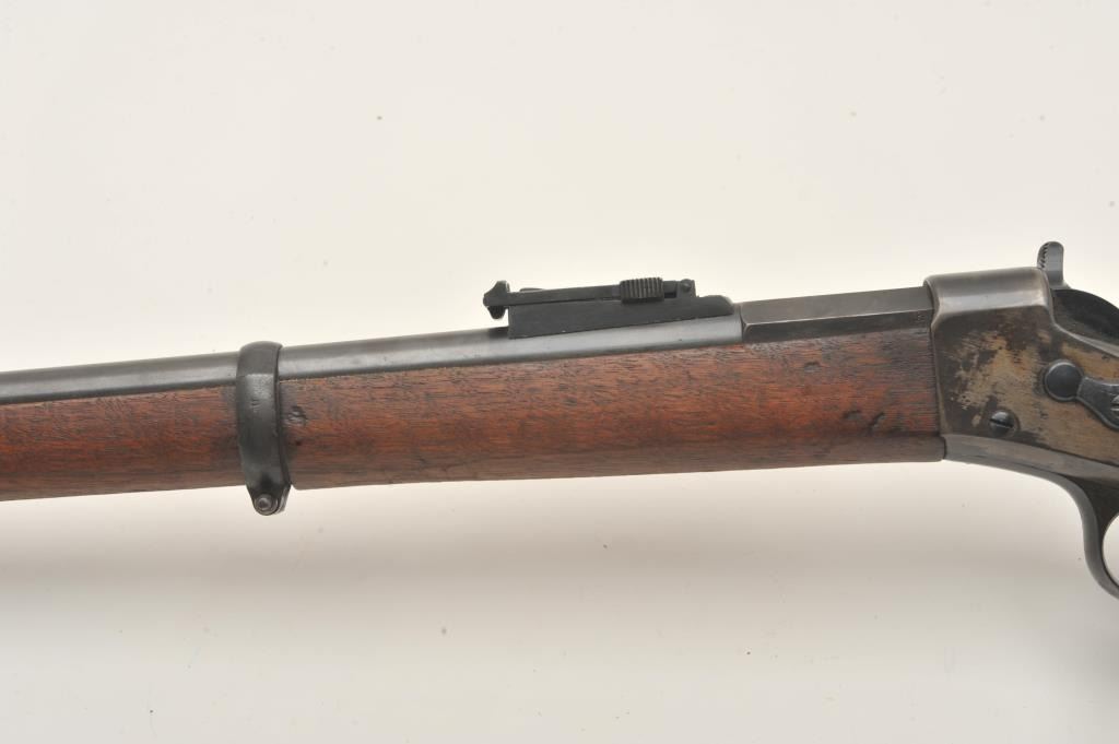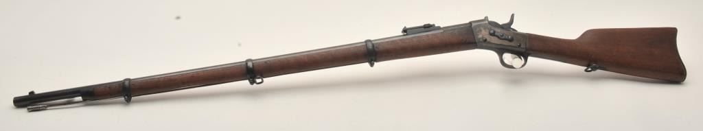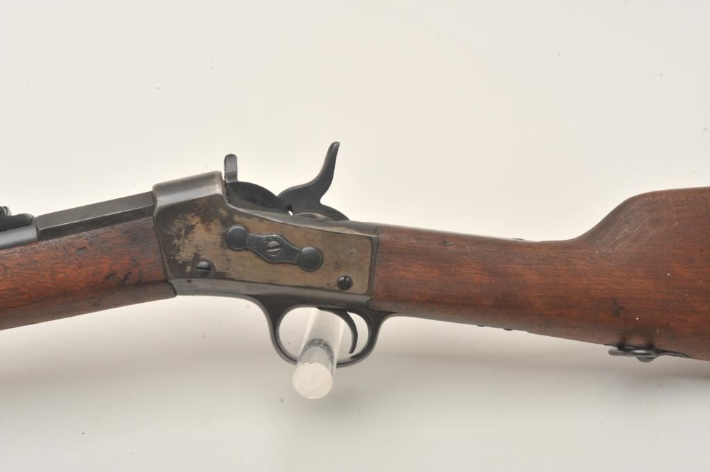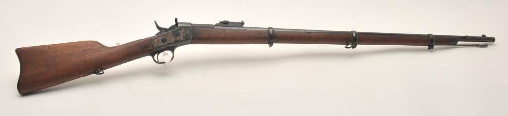 Remington Rolling block rifle, 11mm caliber, 36” barrel with integral bayonet lug, blued finish with areas of what appears to be nickel finish on the receiver, wood stocks, no visible S/N, in overall good + conditionwith crisp action, good markings, very good + bore and overall good wood stocks. (Antique). Est.: $250-$450.