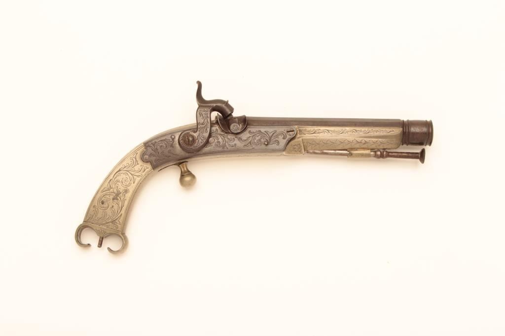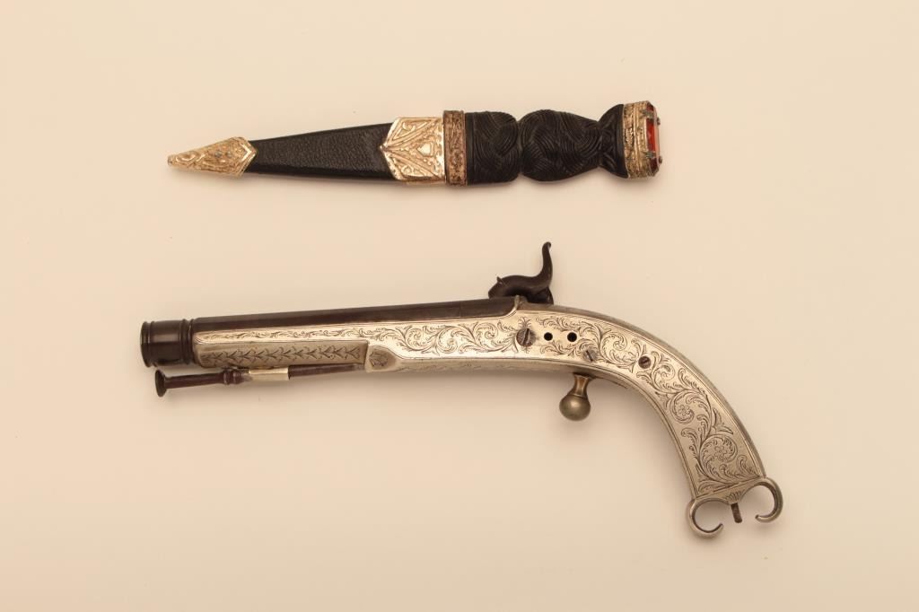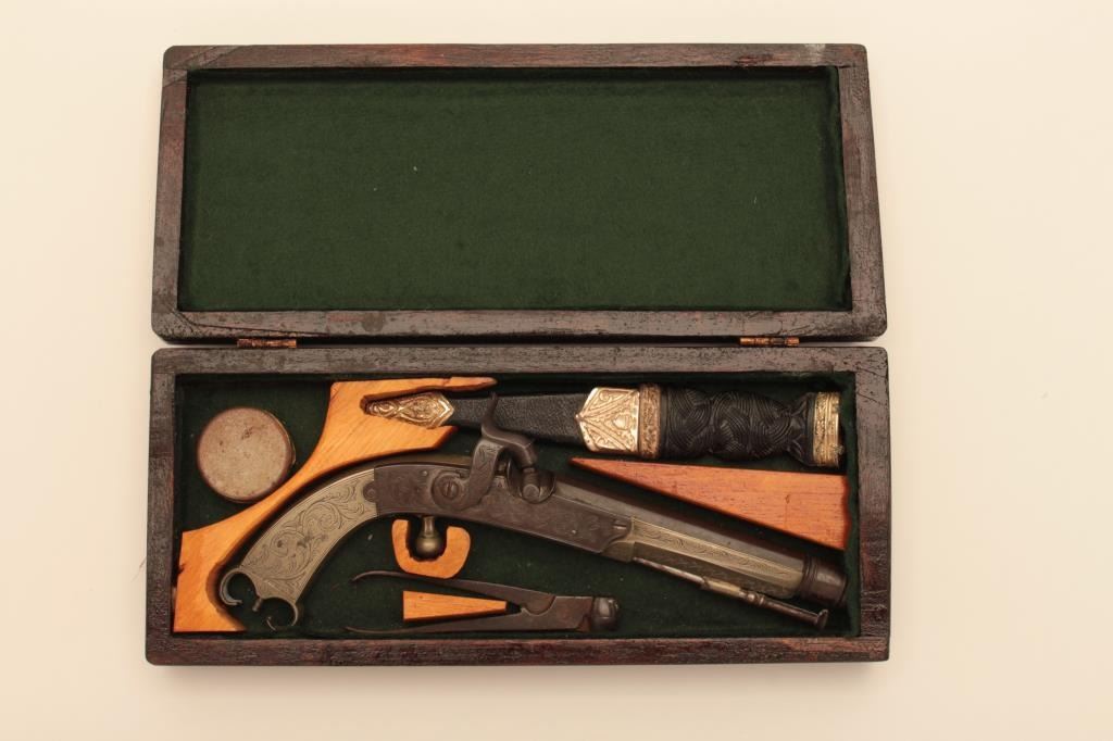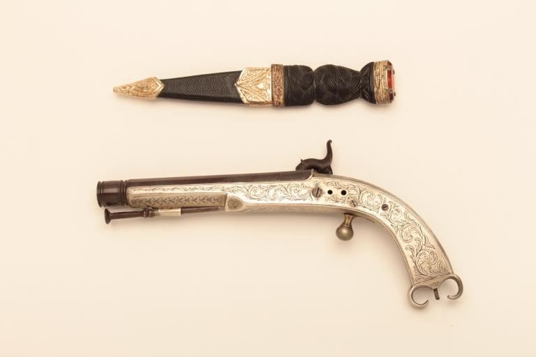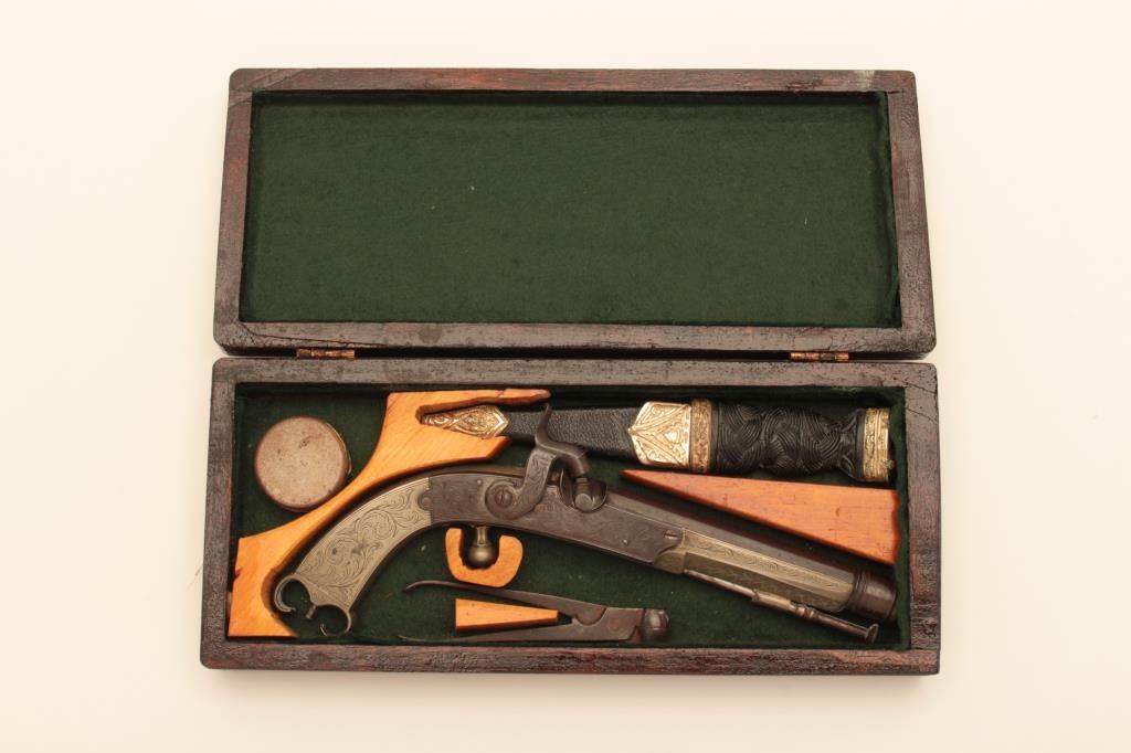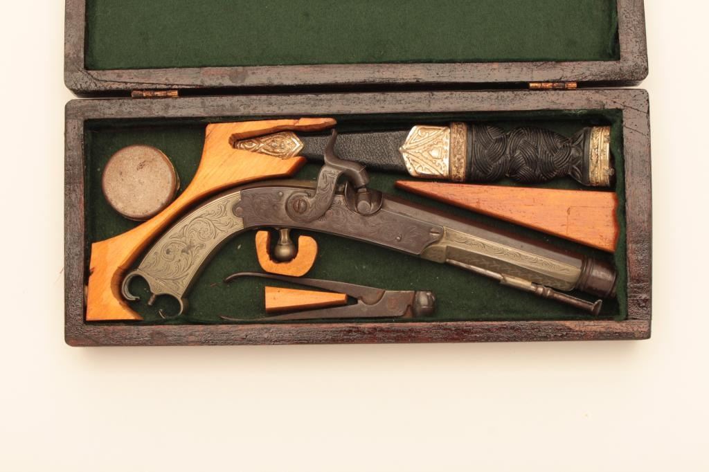Scottish style percussion pistol with Ramshorn shaped butt. Cased with stocking dirk and accessories. Mid-19th century and dirk etched “J. Nowell and Sons Sheffield” (Of a later era). The pistol is very nicelyengraved in scroll motifs. The condition of the pistol is very good plus to near fine with considerable original blue and toned cased colors. Measures approximately 10” overall. The storage case is made by owner.Contains mold and caps. (Antique) Est.: $2500-$5000