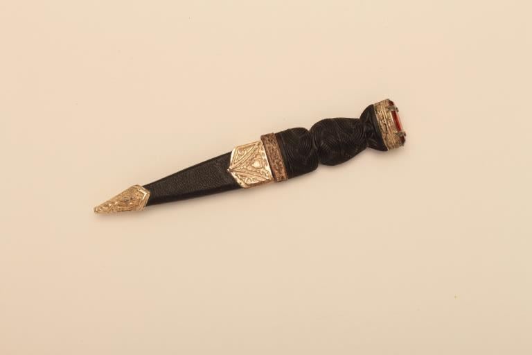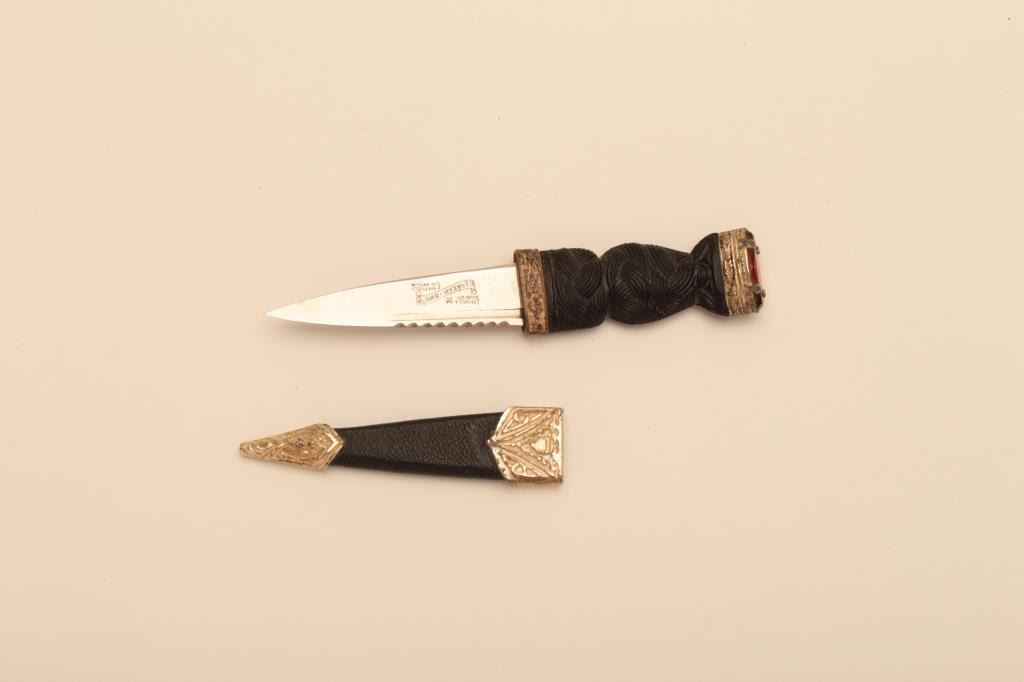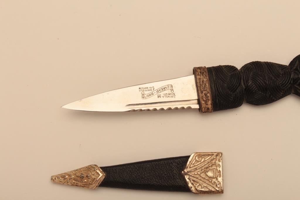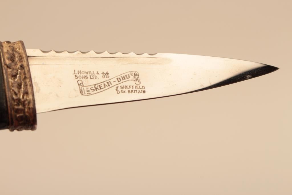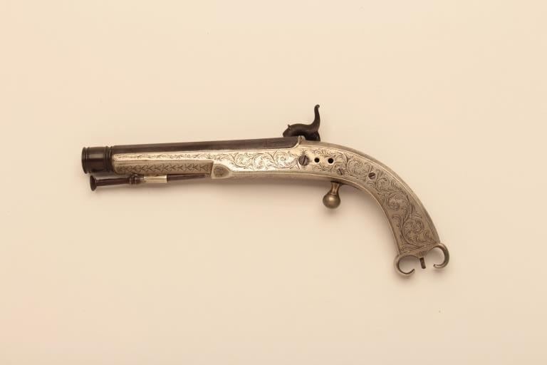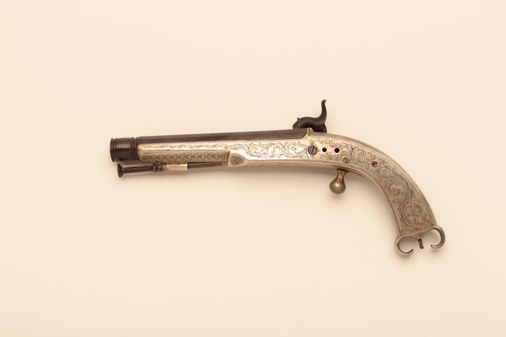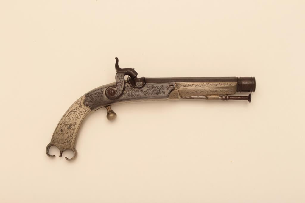 Scottish style percussion pistol with Ramshorn shaped butt. Cased with stocking dirk and accessories. Mid-19th century and dirk etched “J. Nowell and Sons Sheffield” (Of a later era). The pistol is very nicelyengraved in scroll motifs. The condition of the pistol is very good plus to near fine with considerable original blue and toned cased colors. Measures approximately 10” overall. The storage case is made by owner.Contains mold and caps. (Antique) Est.: $2500-$5000