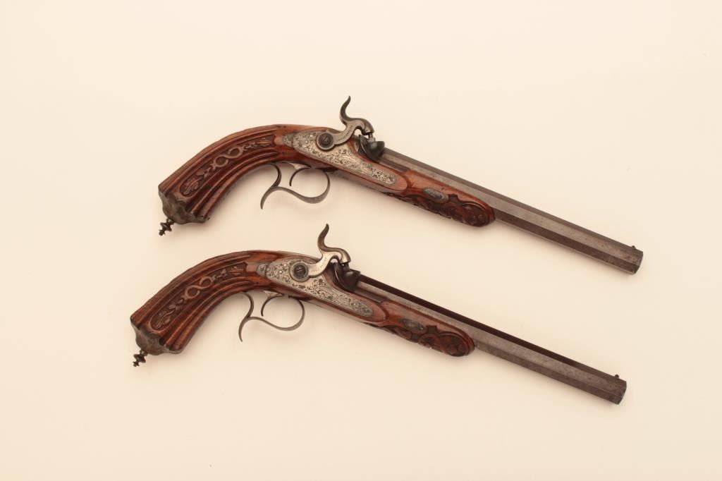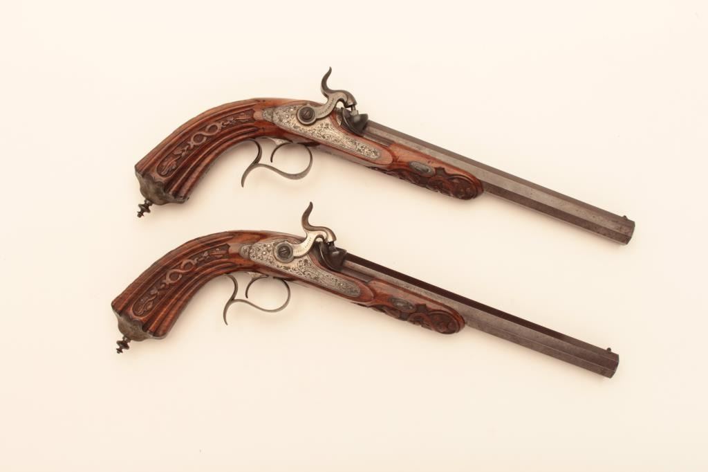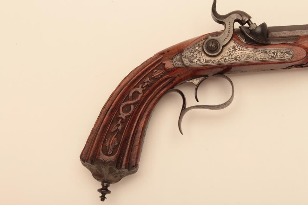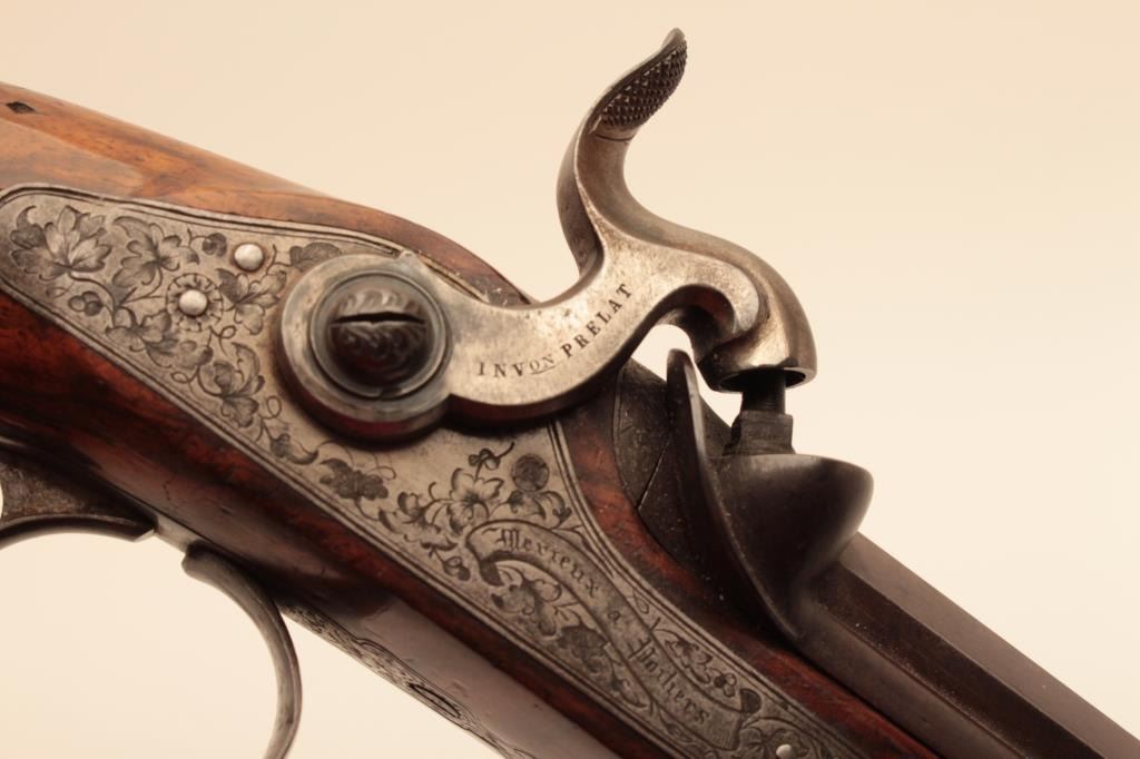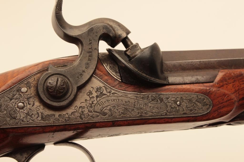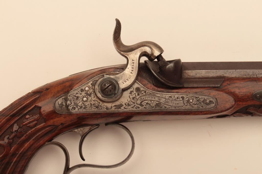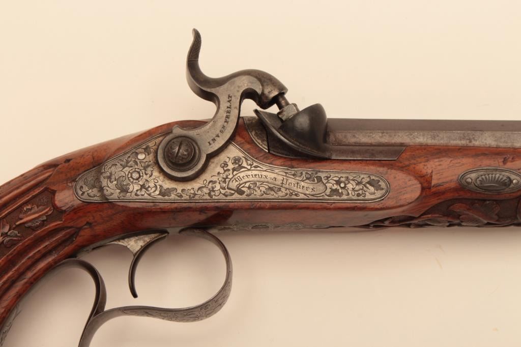 Pair of French dueling pistols circa approximately 1850 signed “Mexiuex a Poietiers” on locks and “Invon Prelat” on the hammers. Measures 17” overall with 10 1/8” barrels of .45 caliber rifled. Half stockedin quality walnut showing fancy raised carving and nice burled grain. The condition is very good plus with most original brown and French gray colors on locks. The stocks are also very good plus with crisp carving.Minor storage marks and slight aging. The actions work well and the bores are good. A very nice pair of above average quality. (Antique) Est.: $2000-$4000