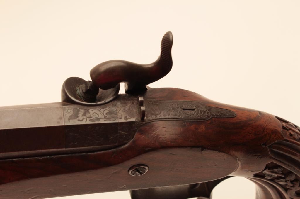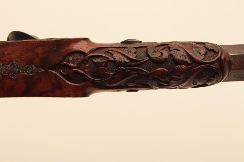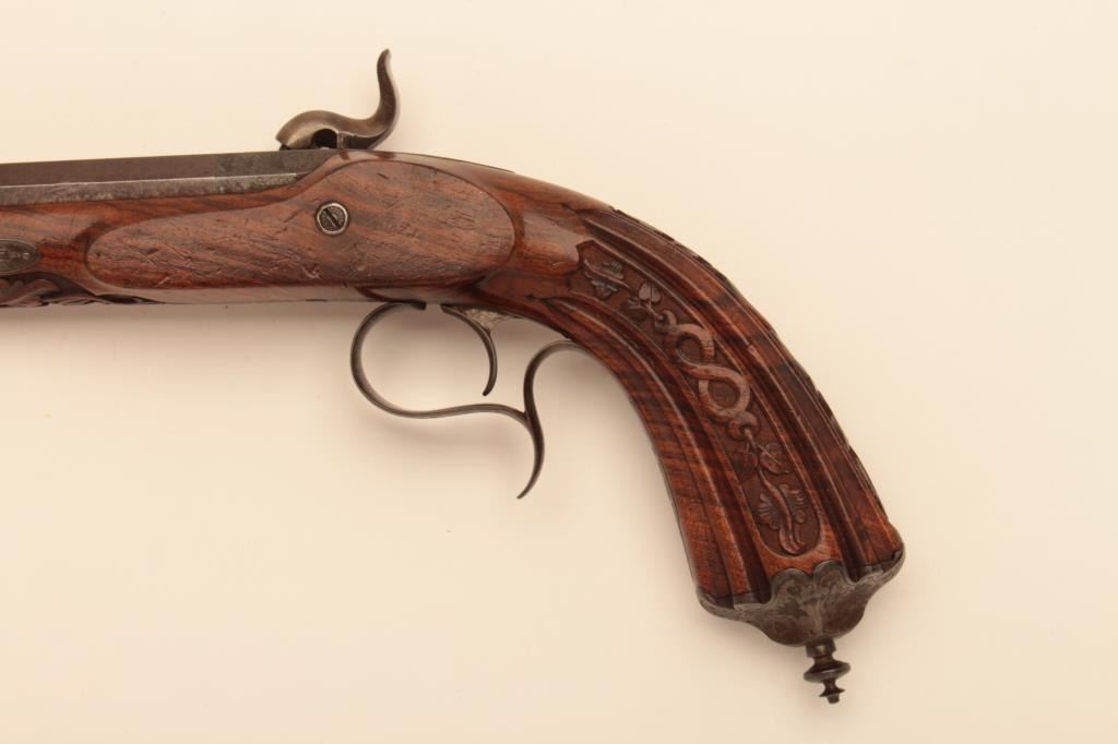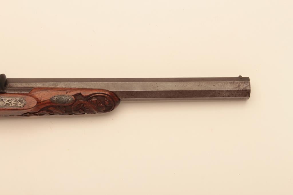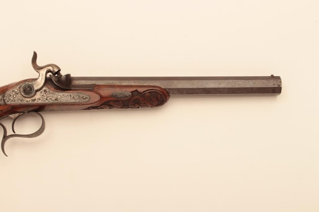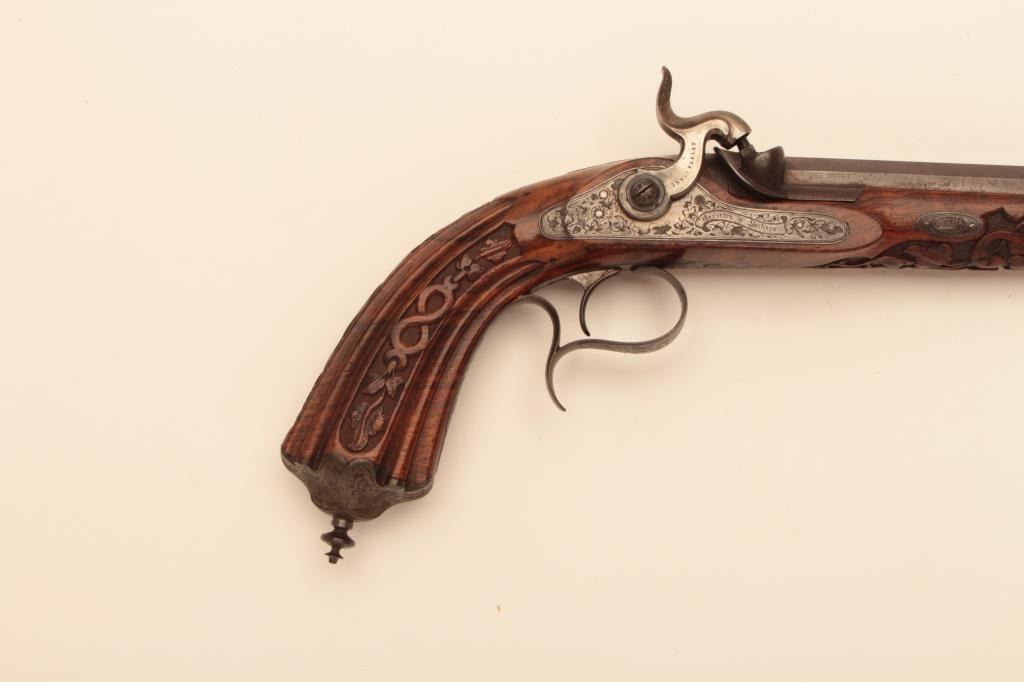 Pair of French dueling pistols circa approximately 1850 signed “Mexiuex a Poietiers” on locks and “Invon Prelat” on the hammers. Measures 17” overall with 10 1/8” barrels of .45 caliber rifled. Half stockedin quality walnut showing fancy raised carving and nice burled grain. The condition is very good plus with most original brown and French gray colors on locks. The stocks are also very good plus with crisp carving.Minor storage marks and slight aging. The actions work well and the bores are good. A very nice pair of above average quality. (Antique) Est.: $2000-$4000