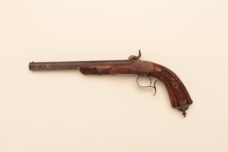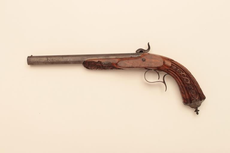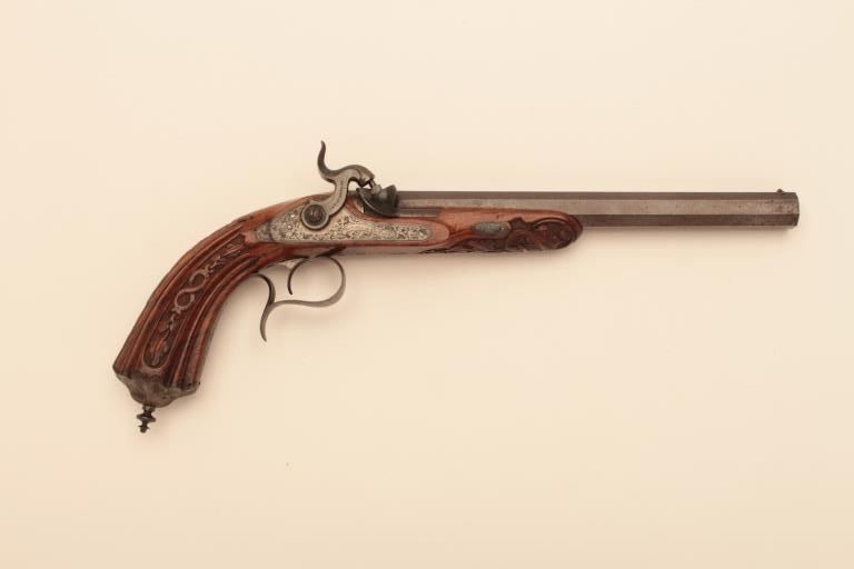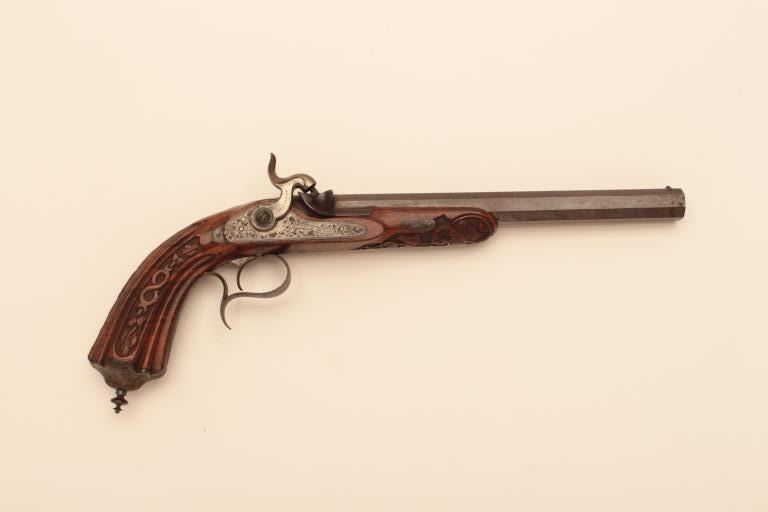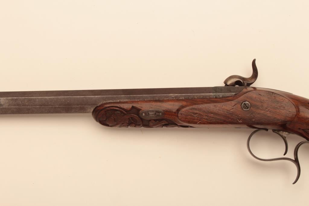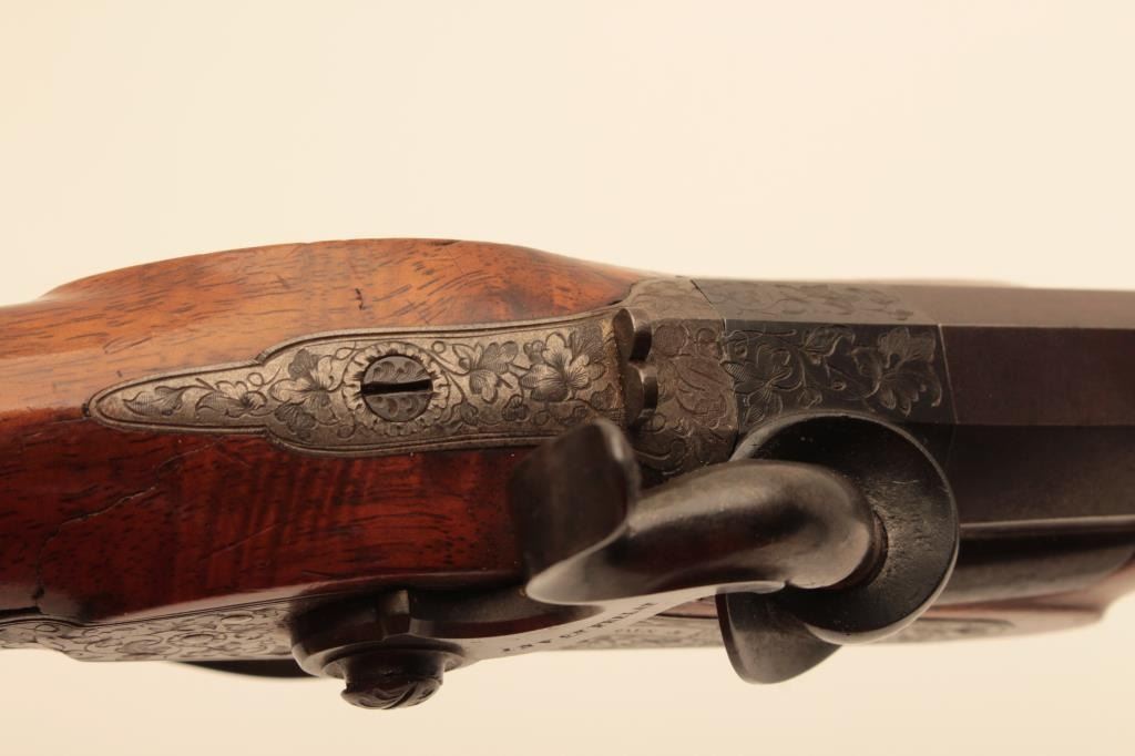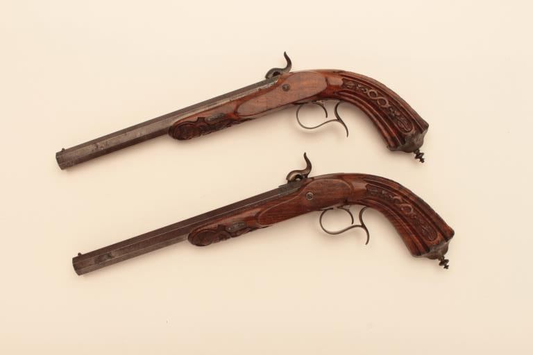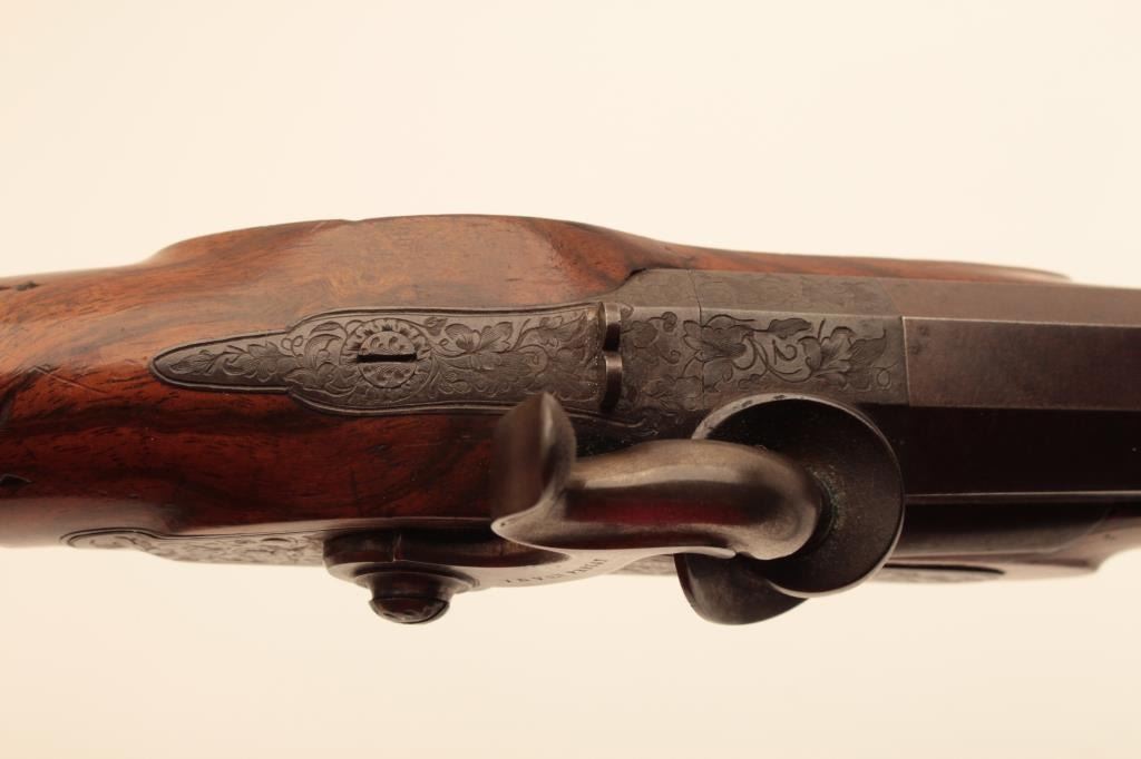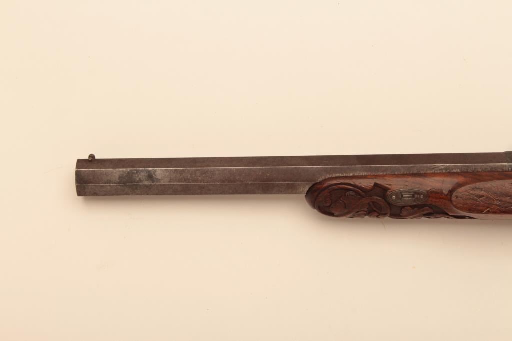 Pair of French dueling pistols circa approximately 1850 signed “Mexiuex a Poietiers” on locks and “Invon Prelat” on the hammers. Measures 17” overall with 10 1/8” barrels of .45 caliber rifled. Half stockedin quality walnut showing fancy raised carving and nice burled grain. The condition is very good plus with most original brown and French gray colors on locks. The stocks are also very good plus with crisp carving.Minor storage marks and slight aging. The actions work well and the bores are good. A very nice pair of above average quality. (Antique) Est.: $2000-$4000