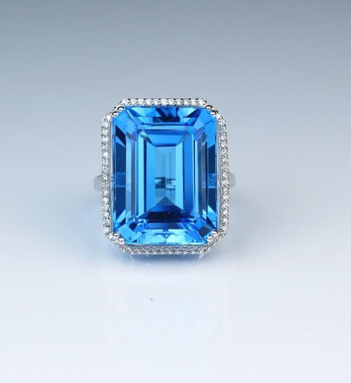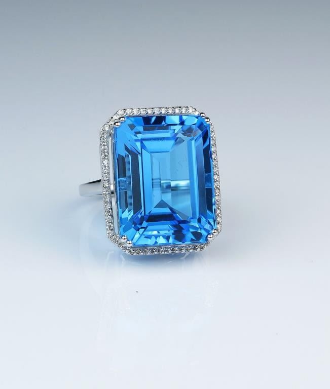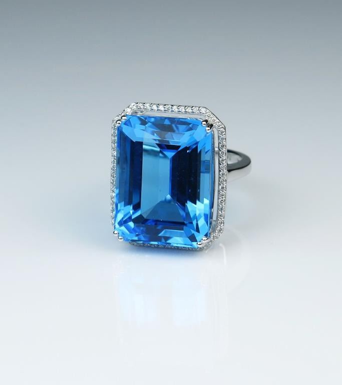 Magnificent emerald cut Swiss Blue Topaz and Diamond ring weighing approx. 30.00 carats framed by over 70 round cut Diamonds weighing approx. 0.50 carats with F-G colors and VS/SI clarity set in 14 karat white gold.Retail $4,000-$5,000 Estimates $2,000-$3,000
