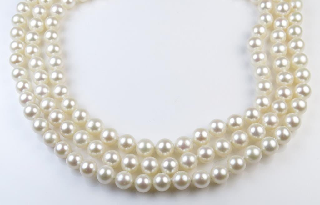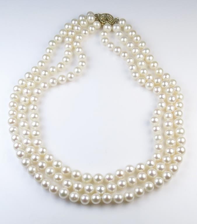 Elegant triple strand cultured Pearl necklace measuring over 7.00 mm in diameters. Pearls are well shaped with lovely luster and color accented with 14 karat gold filigree latch. Retail $2,000-$3,000 Estimates $1,200-$1,800