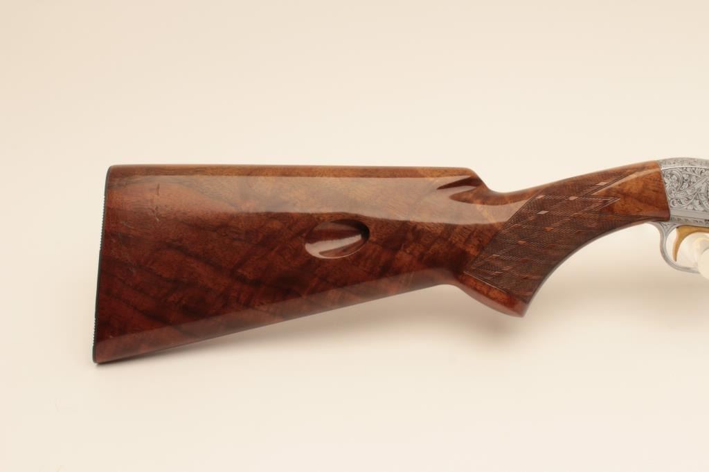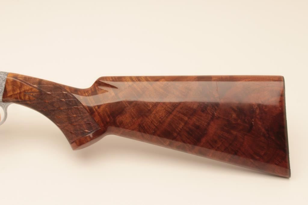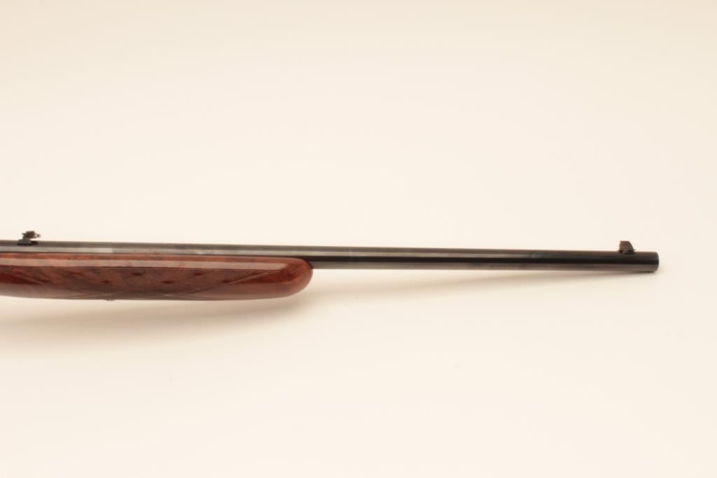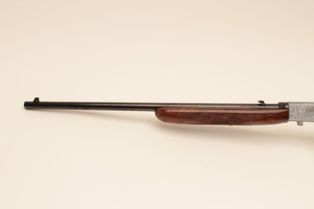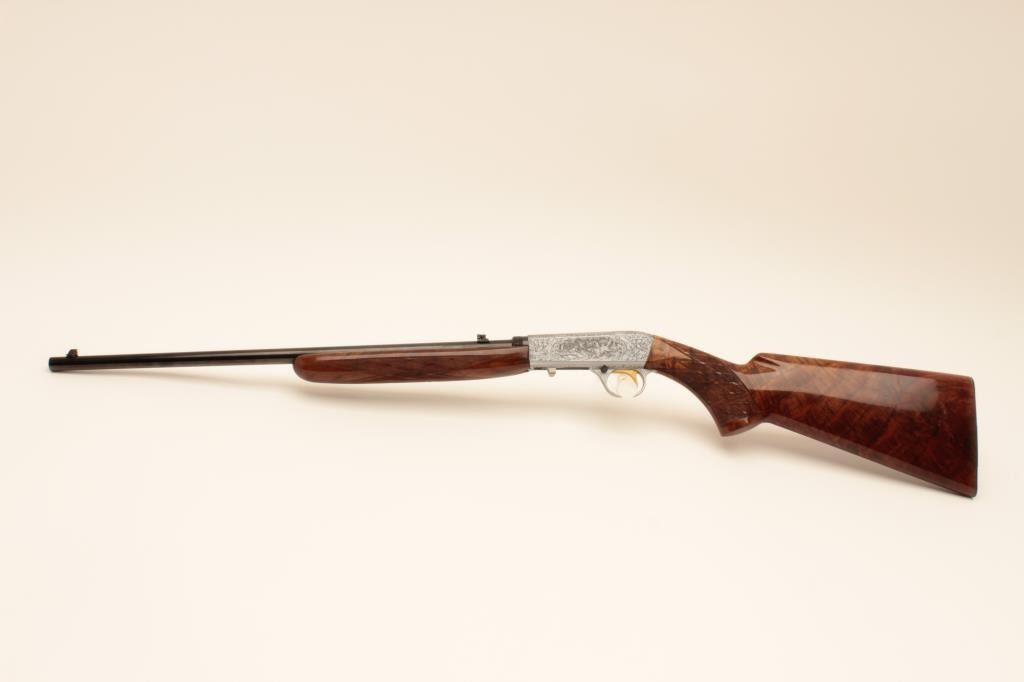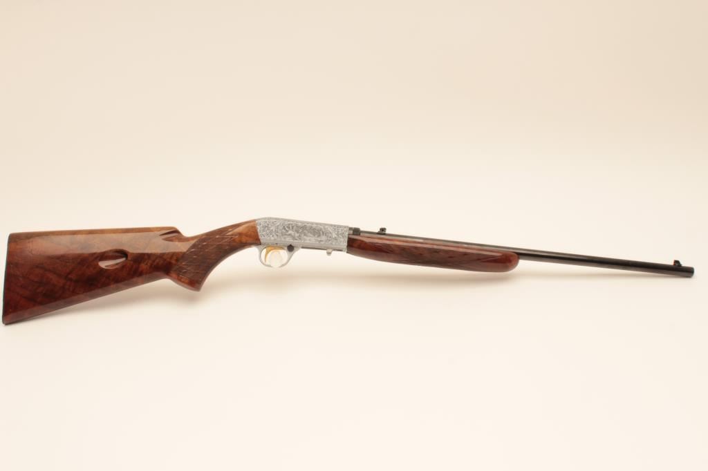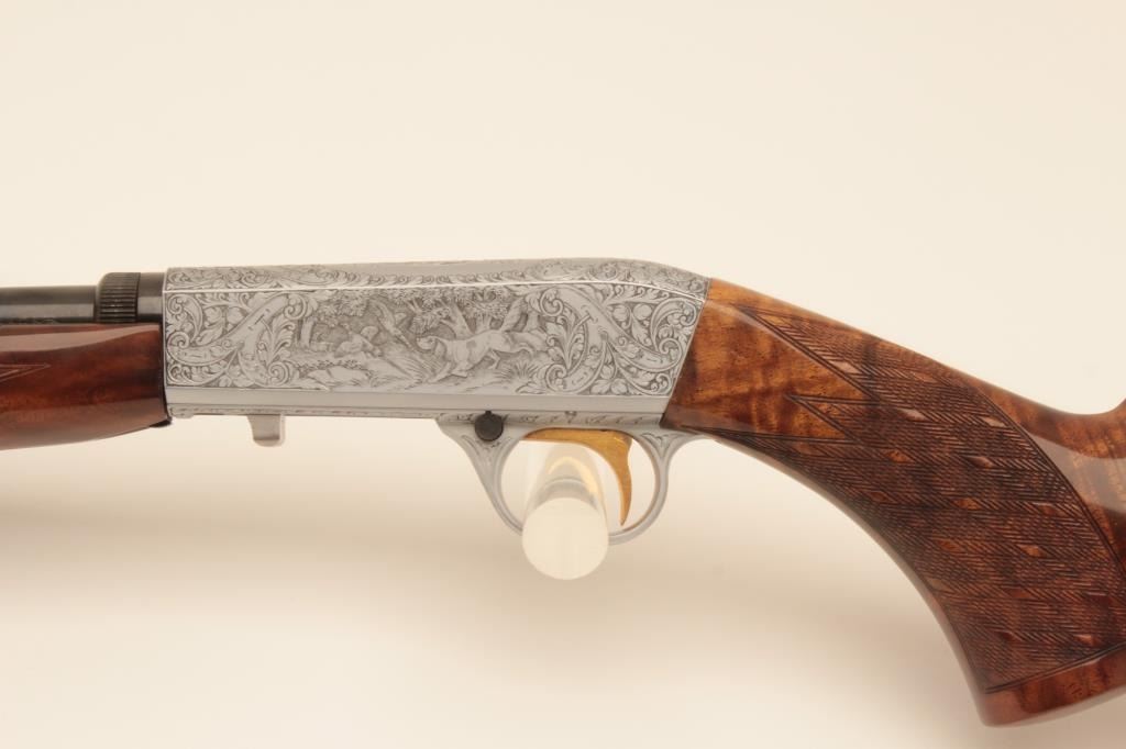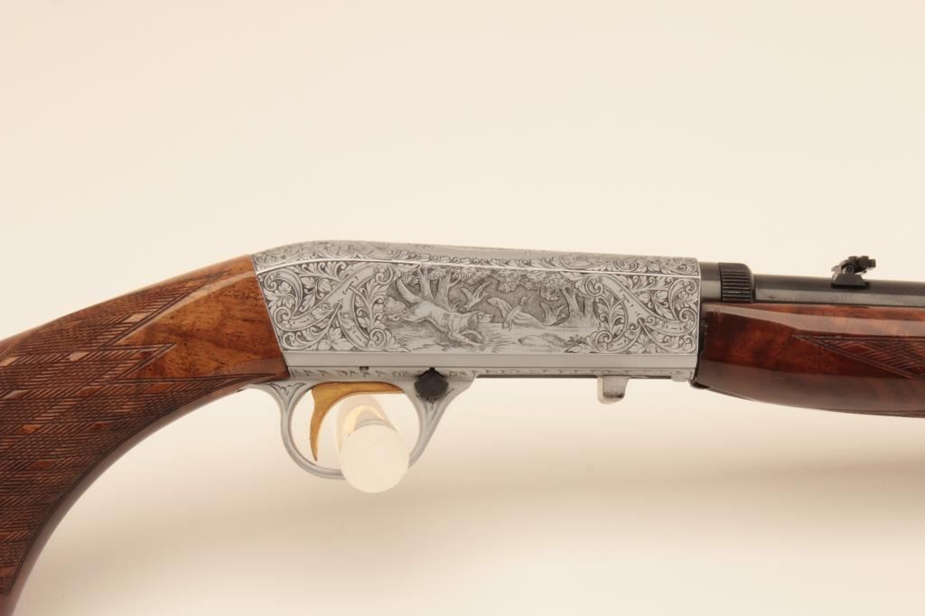 Belgium Browning .22 caliber Semi-Auto Grade III rifle signed “A. Merechal” showing beautiful scenes of dogs flushing game, satin finish frame and deluxe diamond pattern checkered burl wood stock, S/N 7T70534.Excellent condition. 99% overall. Luggage case and instructions included. (Modern) Est.: $2000-$4000