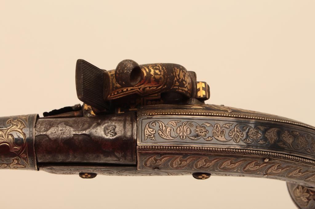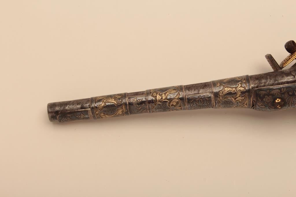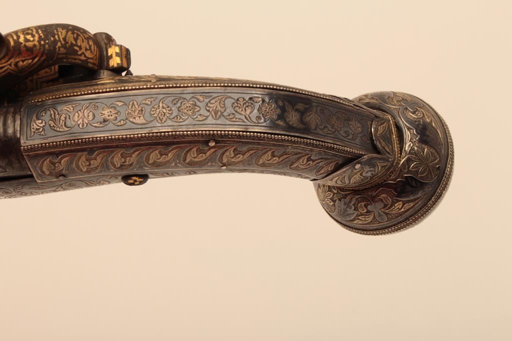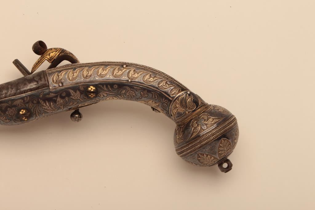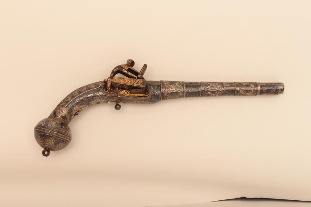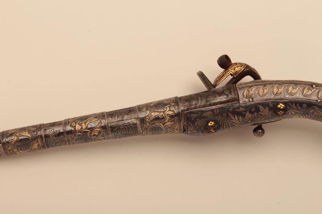 Ornate Causcasian Miquelet Flintlock pistol with niello silver decorated stock and gold damascened lock. Very fine quality silver work with gold in chased areas between niello decorations. The pistol measures 15” overall with a 8 ½” barrel of .58 caliber smoothbore. The condition is near fine with slight loss of gold on the lock and minor aging. A small retaining screw is missing behind the ball trigger and lanyard loop ismissing in the butt. The barrel shows a watered steel or Damascus pattern. Far better than average quality. (Antique) Est.: $3500-$7000
