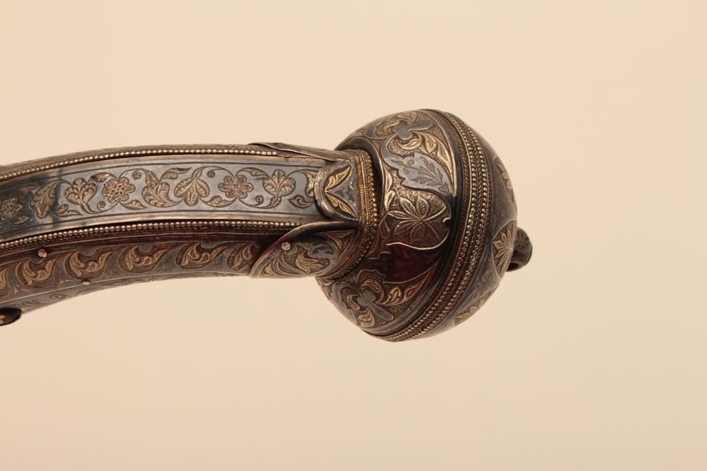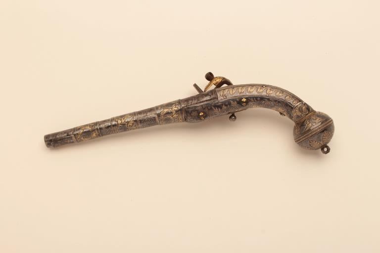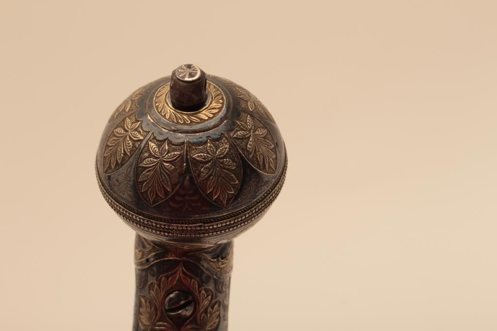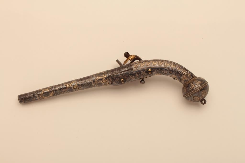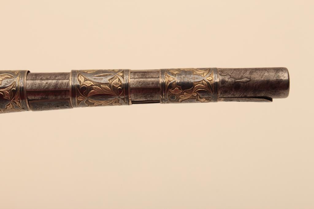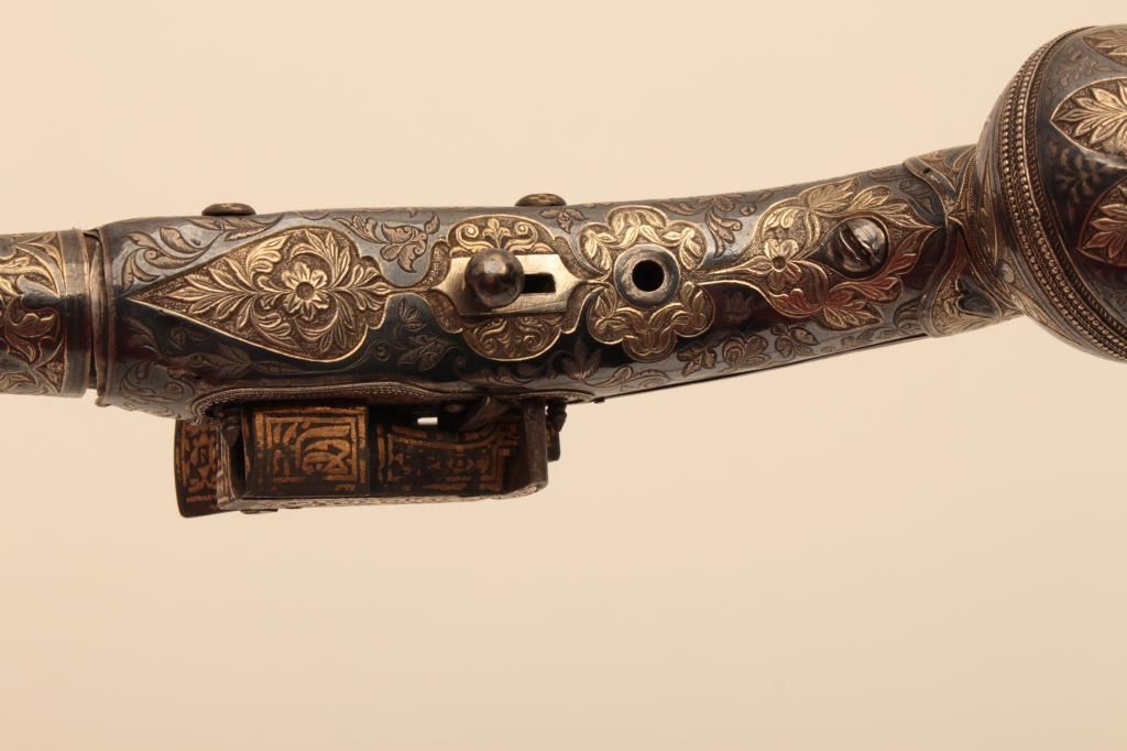 Ornate Causcasian Miquelet Flintlock pistol with niello silver decorated stock and gold damascened lock. Very fine quality silver work with gold in chased areas between niello decorations. The pistol measures 15” overall with a 8 ½” barrel of .58 caliber smoothbore. The condition is near fine with slight loss of gold on the lock and minor aging. A small retaining screw is missing behind the ball trigger and lanyard loop ismissing in the butt. The barrel shows a watered steel or Damascus pattern. Far better than average quality. (Antique) Est.: $3500-$7000