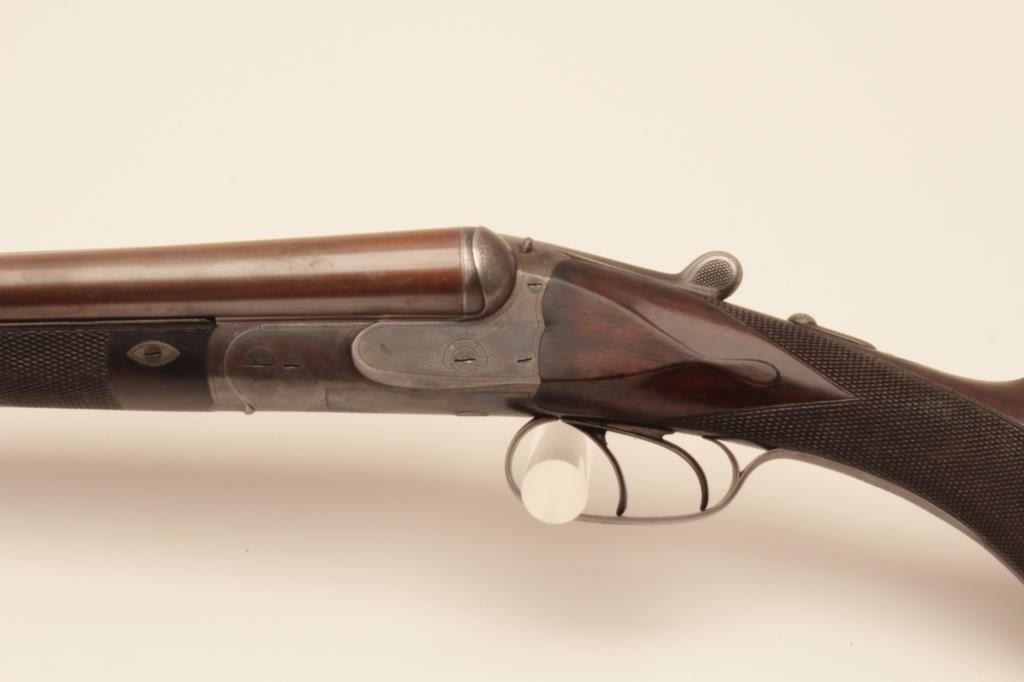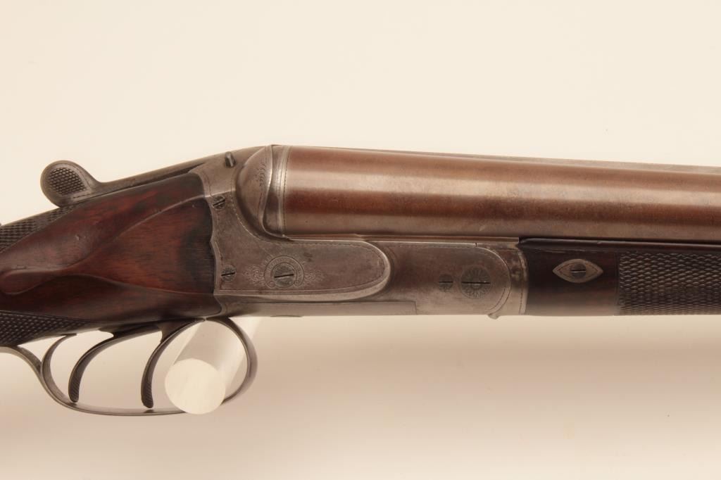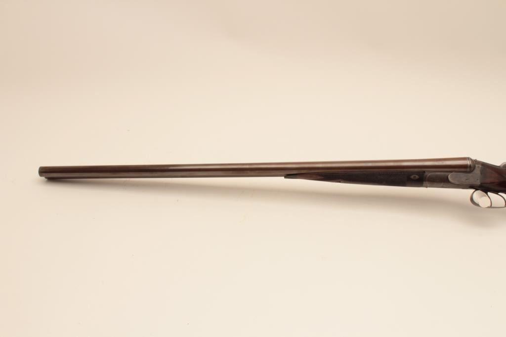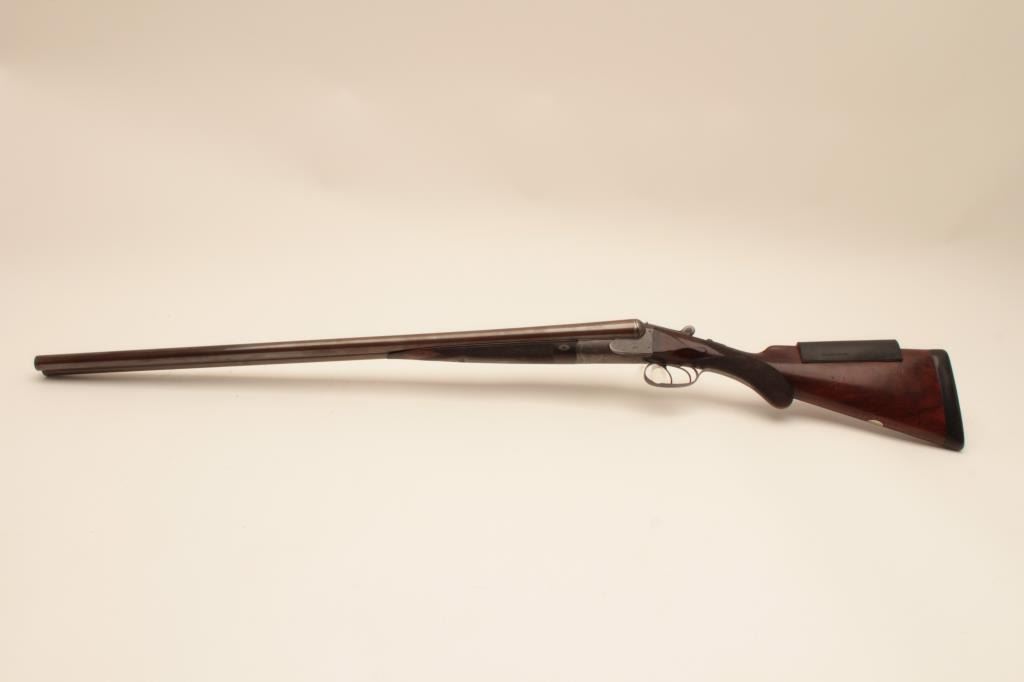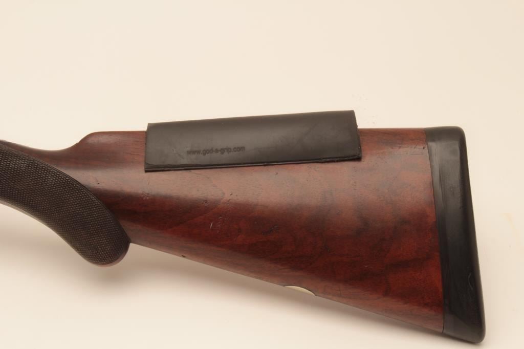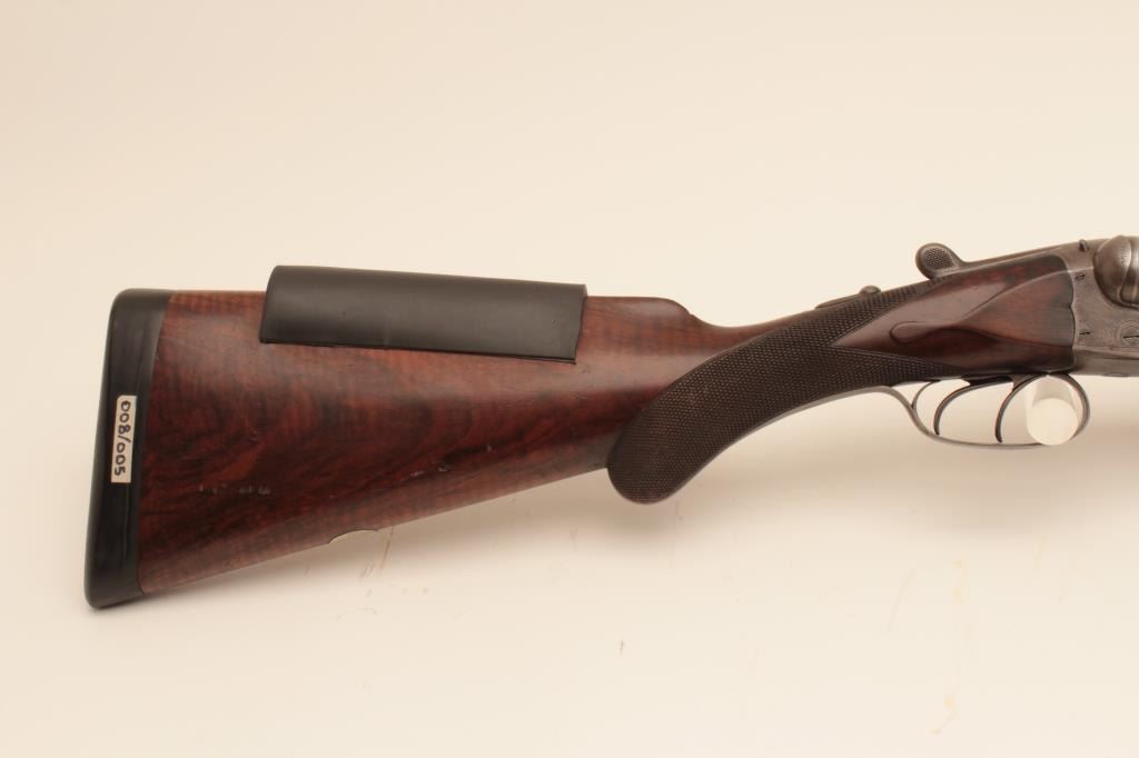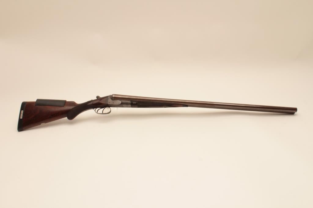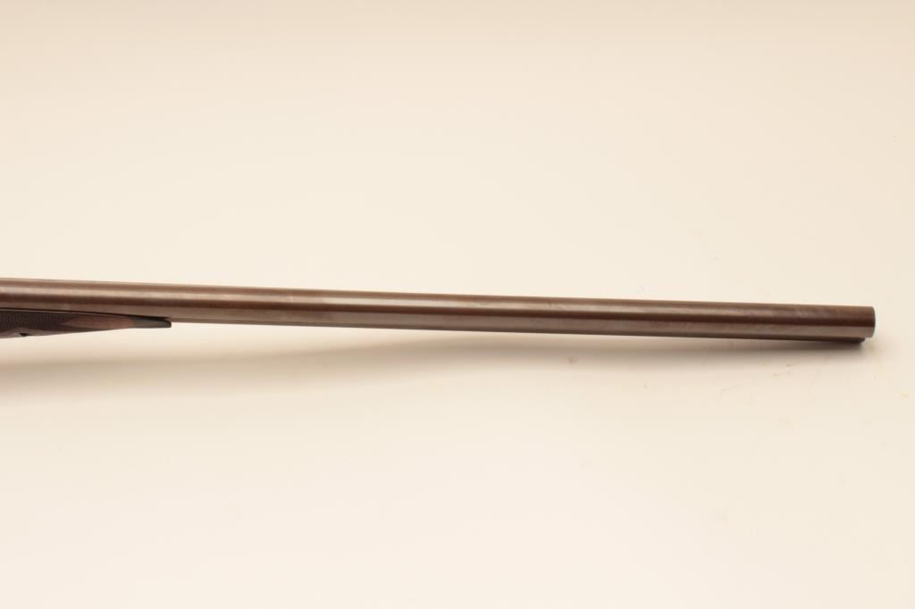 Charles Daly SxS 12GA Damascus barrel shotgun, S/N 565 with 30 1/8” barrels, checkered pistol grip stock, double triggers, and auto ejectors. Shows Suhl Germany proofs with H.A.L. and crossed pistols maker’smarks. Most original brown on the barrels with 50% case colors turning “Smokey” gray. Cocking indicators. Locks like a vault with bright bores. Choked improved cylinder in both barrels. The stocks are fine grainedwith good checkering and very good condition. Measures 14 5/8” to the end of the pad. Stick on comb riser added (easily removed). Very good plus condition overall with minor use and imperfections. Accompanied in a hardshell carry case. (Antique) Est.: $1250-$2500