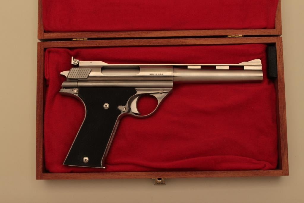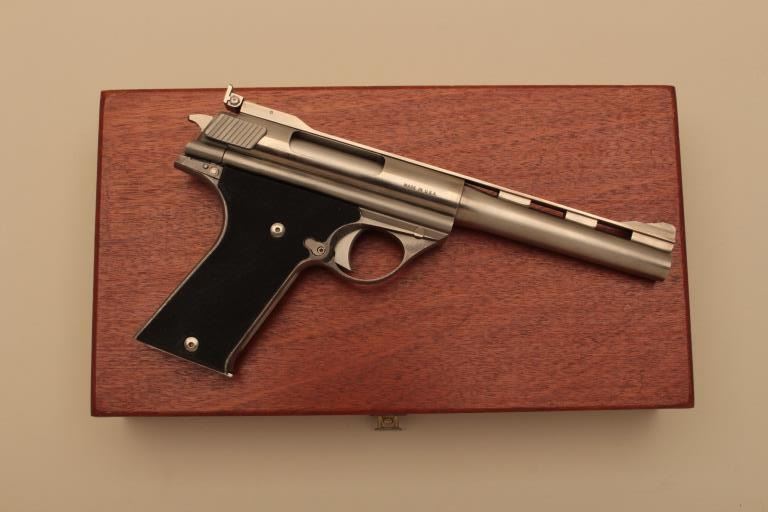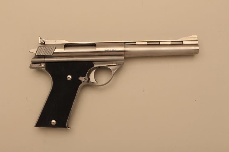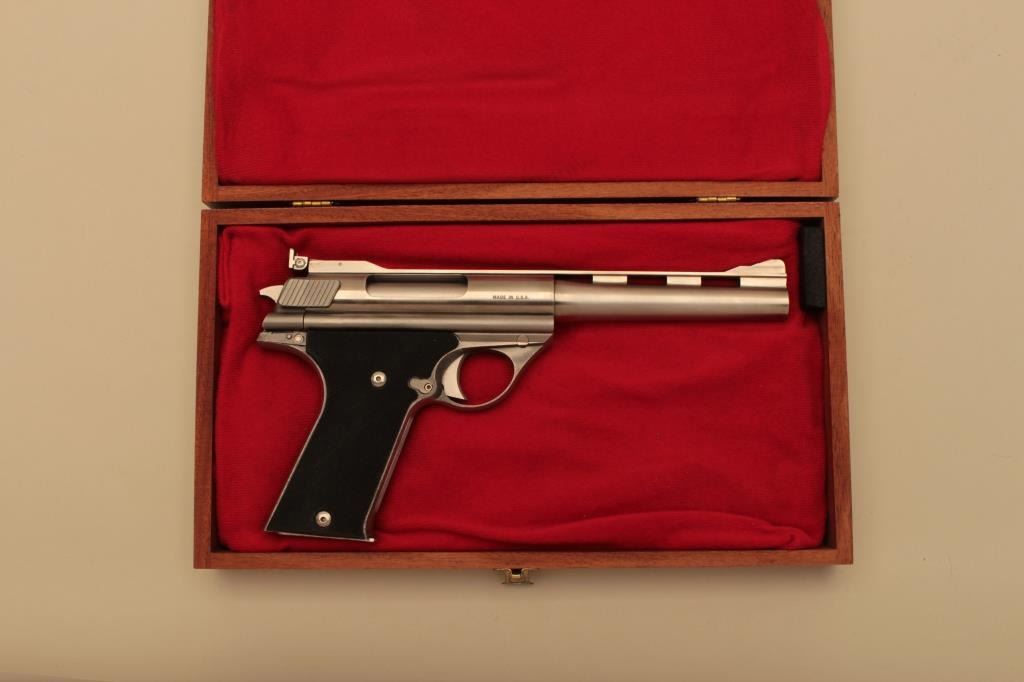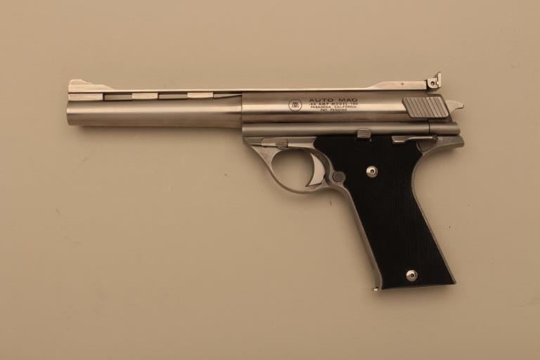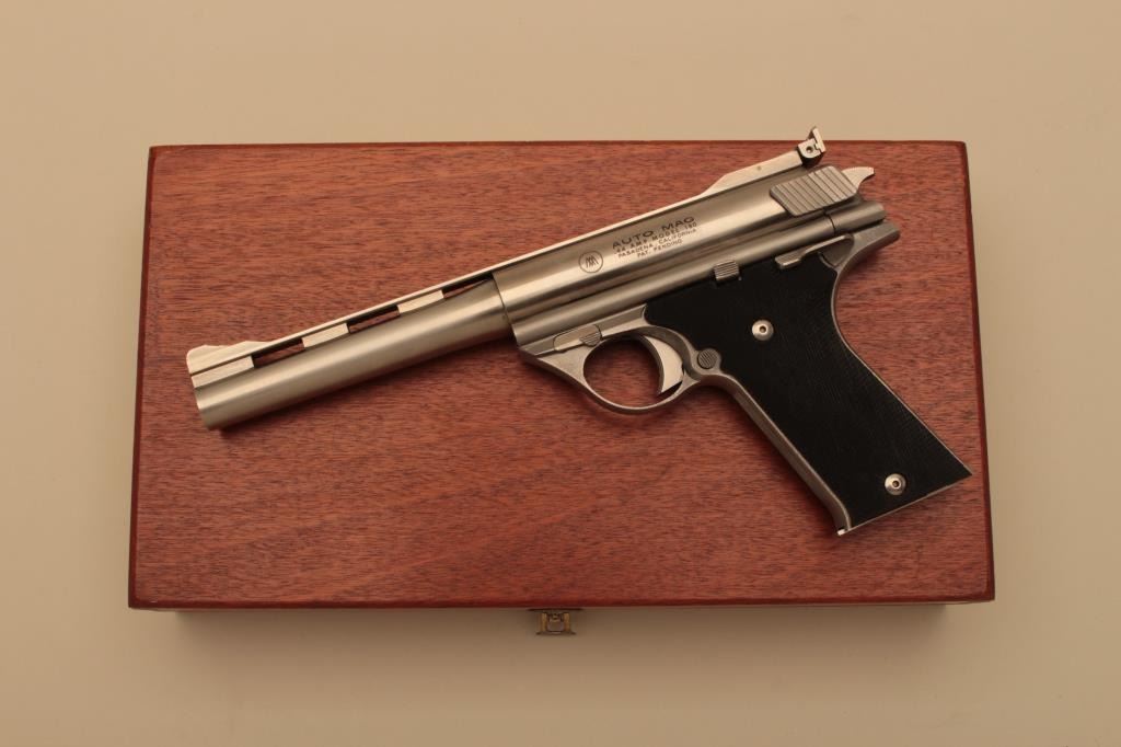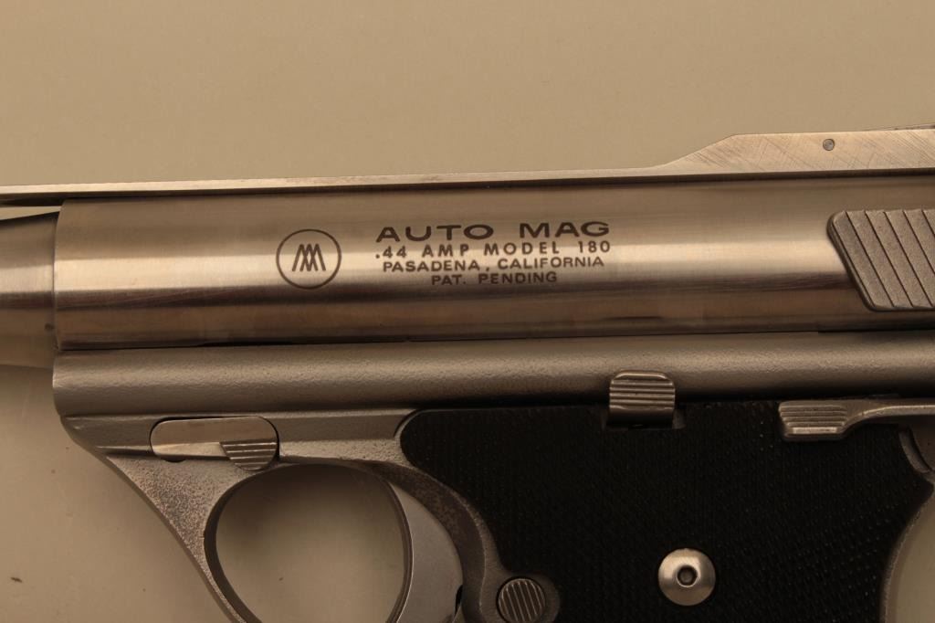 Auto Mag (Pasadena) Model 180 semi-automatic pistol, .44 AMP caliber, 7” barrel, stainless, checkered black plastic grips, S/N A00137; overall like new condition and contained in a wood presentation case.(Modern/NO CAL. SALE). Est.: $1,500-$3,000.