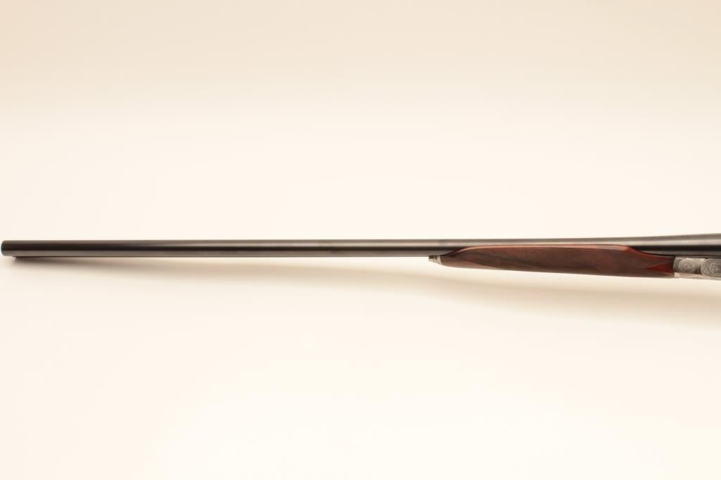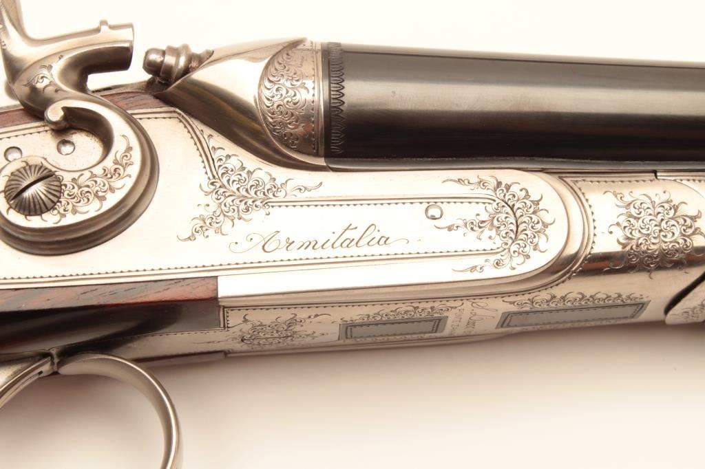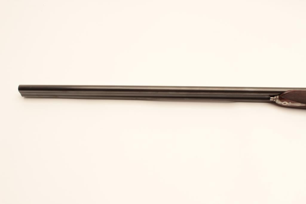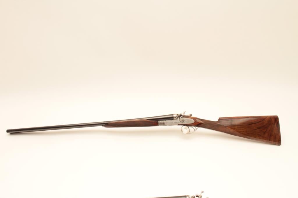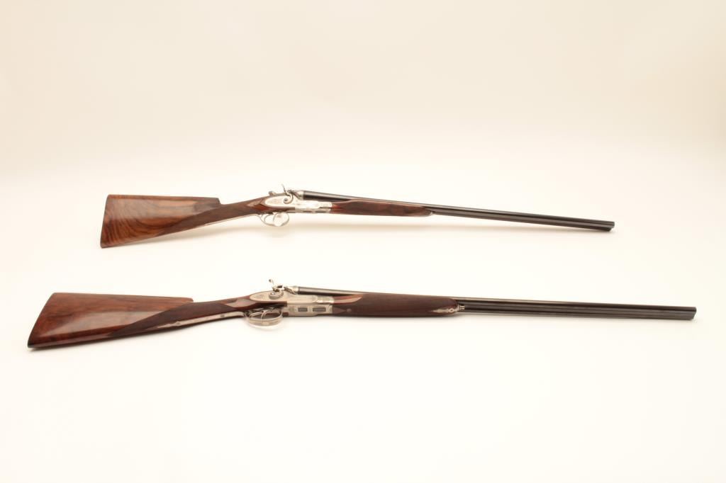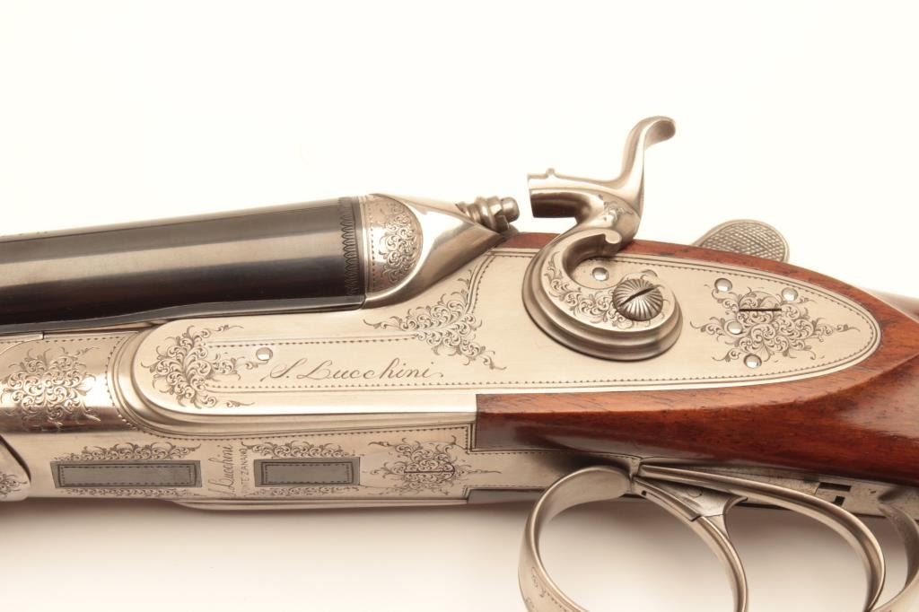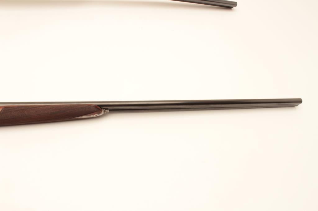 S. Luchini Italian made 28GA/410GA set of double shotgun with exposed hammers, S/N 60891 & 60330 showing double triggers with standard extractors. The barrels measure 27 ¾” with English style straight stocks. Theframes are nicely scroll engraved and finished in European satin bright. The stocks are nicely figured and checkered walnut with finely close checkered wood butts. The pull measures 15 3/8” on 410 GA and 15 1/8” on28GA. Both show hand filled and raised non-vent low rise ribs. The fore ends are finely and extensively checkered. The bottom of the 28GA is marked “S. Luccini Ponte Zanano”. The 410GA is signed by engraver “S.Punte Gheni. The condition is fine to excellent with slight use. The 410GA is choked full and full. The 28GA right barrel is choked Improved Cylinder and the left Modified. A very nice set that would beexpensive to replace on retail market approximately $15,000-$18,000. Accompanied in hard shell carry case and velvet lined. No significate cast on either gun. The 28GA has a 2” drop at the heel and 1 3/8” at the comb.