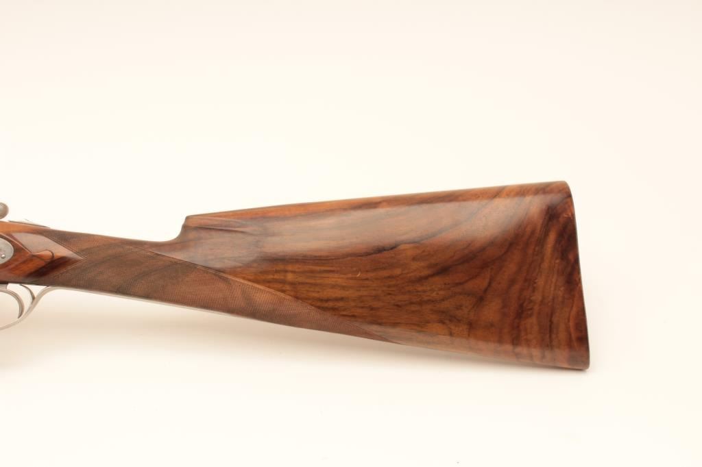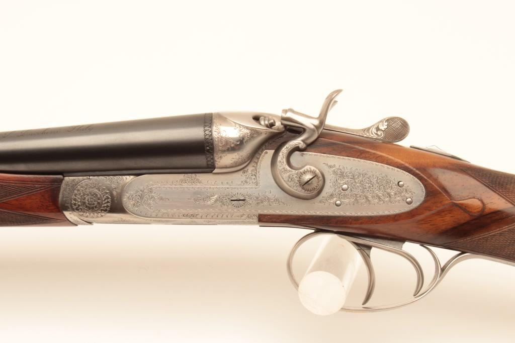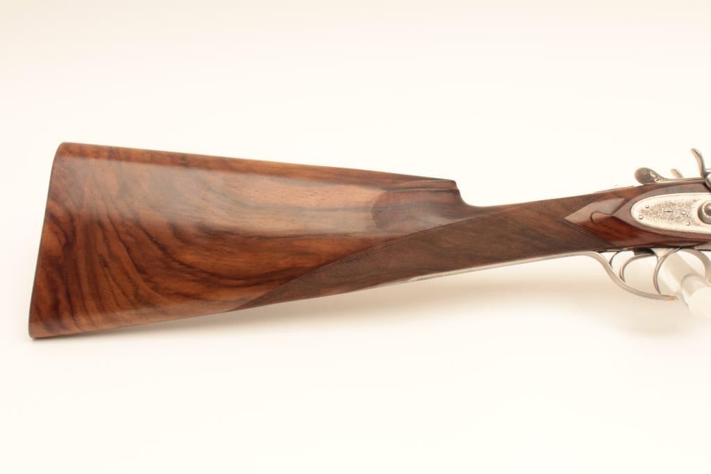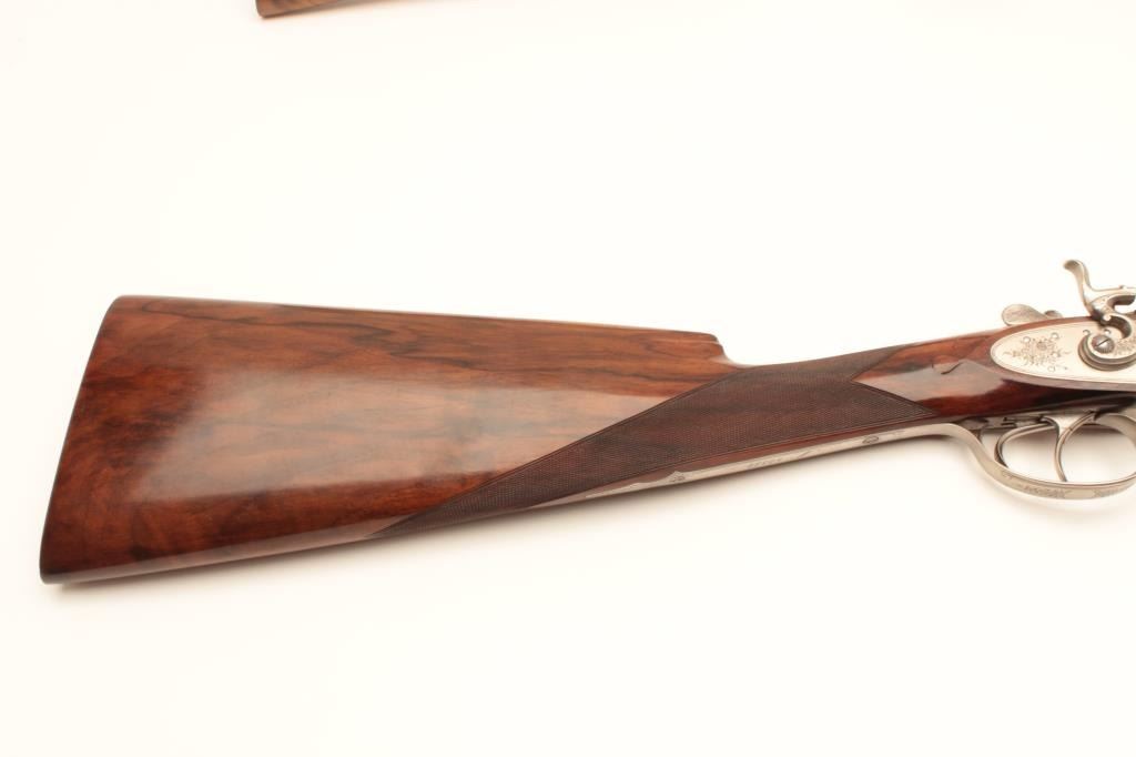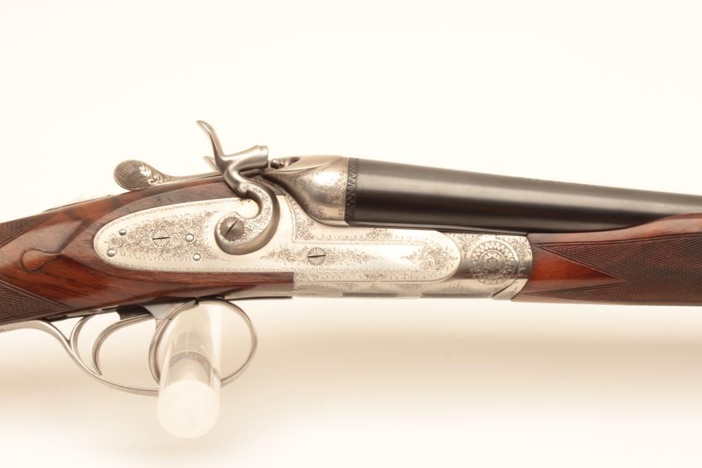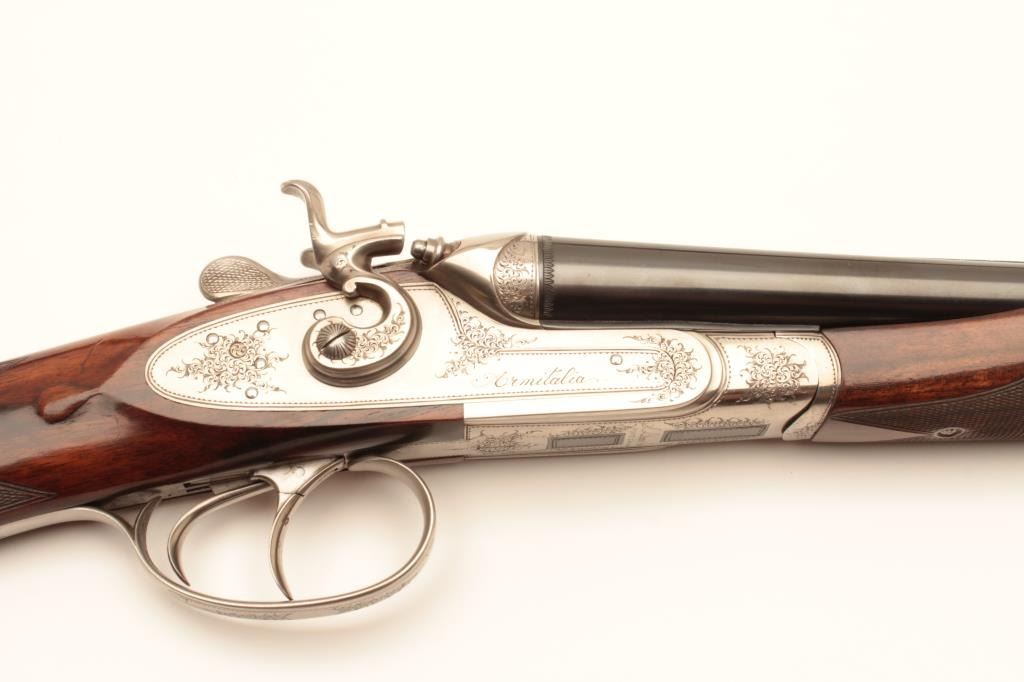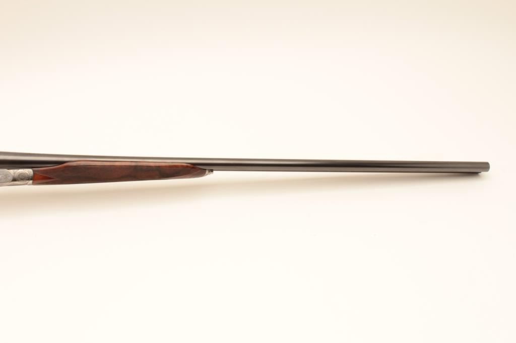 S. Luchini Italian made 28GA/410GA set of double shotgun with exposed hammers, S/N 60891 & 60330 showing double triggers with standard extractors. The barrels measure 27 ¾” with English style straight stocks. Theframes are nicely scroll engraved and finished in European satin bright. The stocks are nicely figured and checkered walnut with finely close checkered wood butts. The pull measures 15 3/8” on 410 GA and 15 1/8” on28GA. Both show hand filled and raised non-vent low rise ribs. The fore ends are finely and extensively checkered. The bottom of the 28GA is marked “S. Luccini Ponte Zanano”. The 410GA is signed by engraver “S.Punte Gheni. The condition is fine to excellent with slight use. The 410GA is choked full and full. The 28GA right barrel is choked Improved Cylinder and the left Modified. A very nice set that would beexpensive to replace on retail market approximately $15,000-$18,000. Accompanied in hard shell carry case and velvet lined. No significate cast on either gun. The 28GA has a 2” drop at the heel and 1 3/8” at the comb.