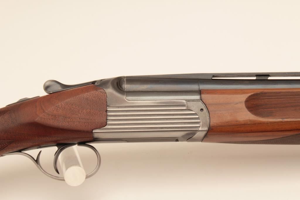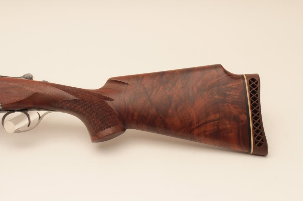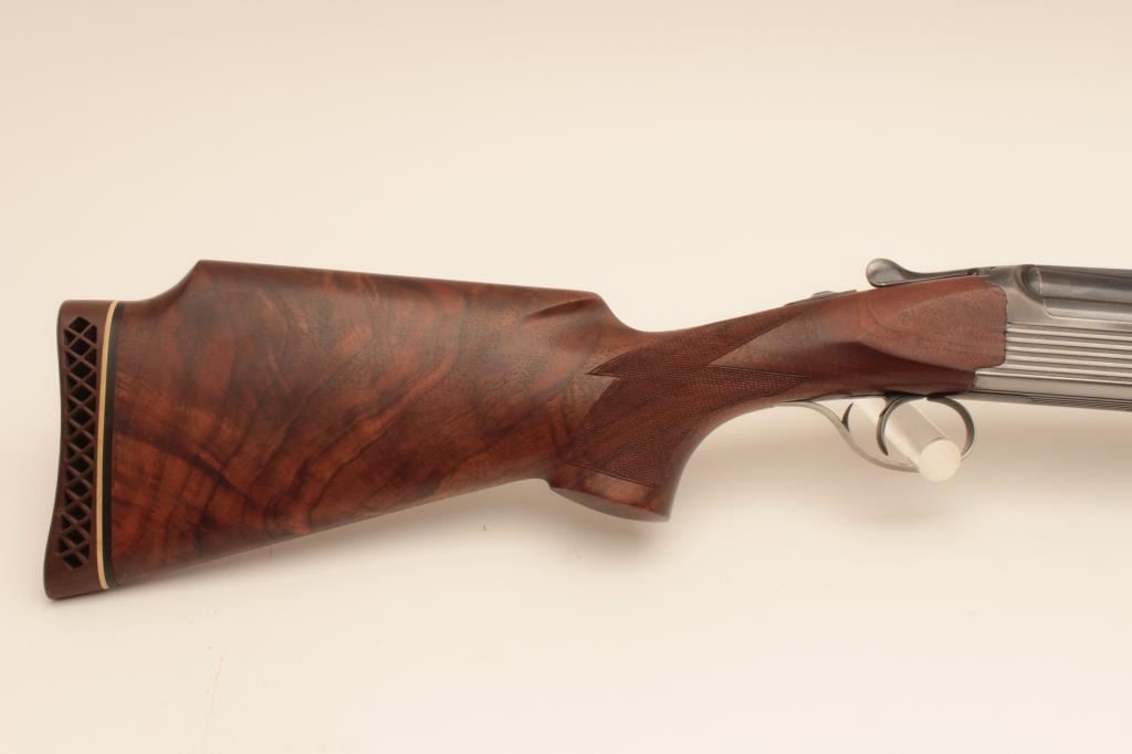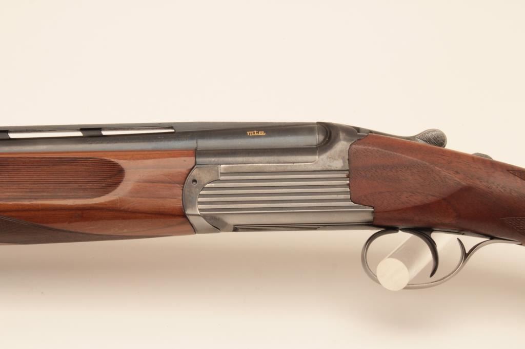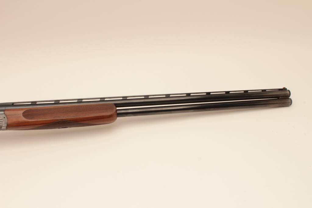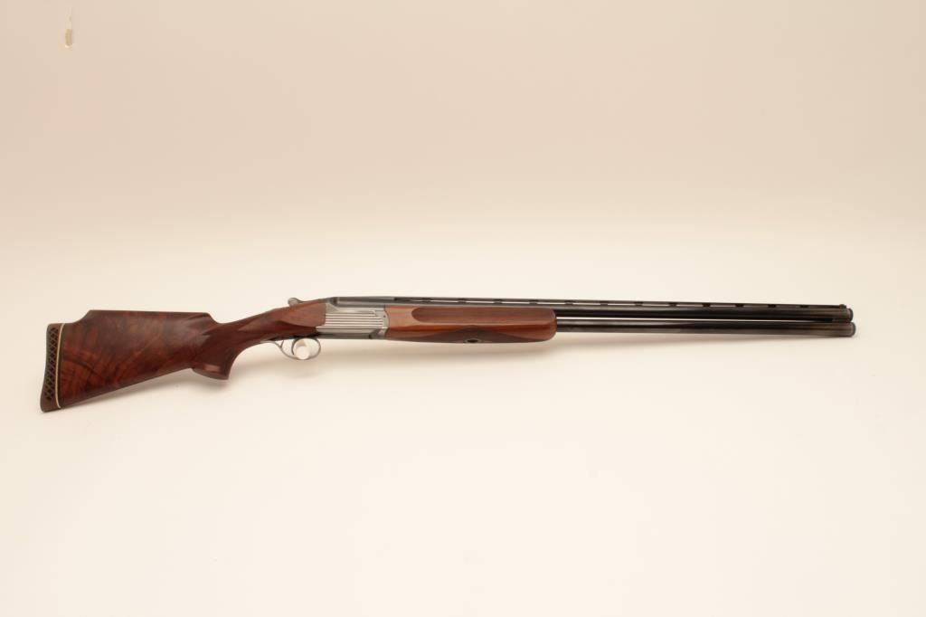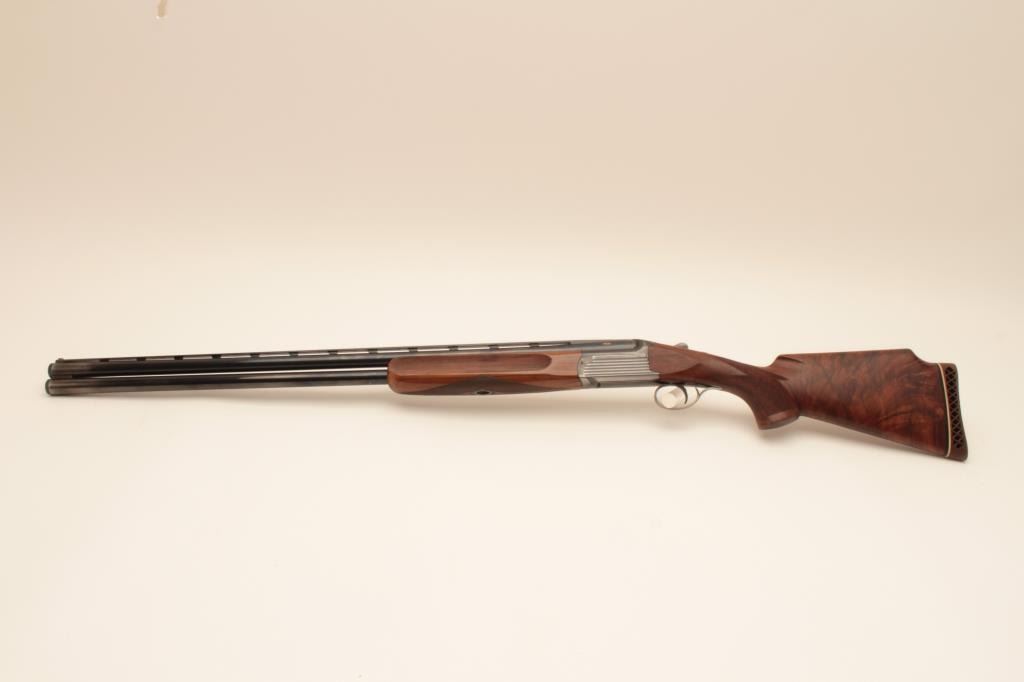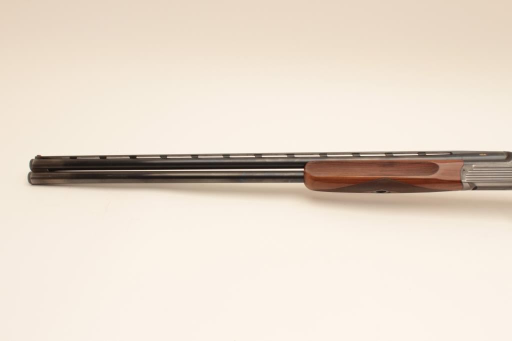 Perazzi MT-6 Trap shotgun in 12GA with extra barrel, S/N 102632 with 31 ½” Over/Under barrel and 9 screw in chokes. Extra 34” single barrel with hard chrome finish and custom rib (Early Ithaca fitted to this gunwith own fore end) choked full. Measures 14 ¼” to the end of the rubber pad. Included is a Perazzi carry case. Very good plus used condition showing normal wear and use. 80%-90% overall. Wally Helmic terrorizedlocal gun clubs with this shootin’ machine as he could hold his own with Olympic and national champions. (Modern) Est.: $3000-$6000