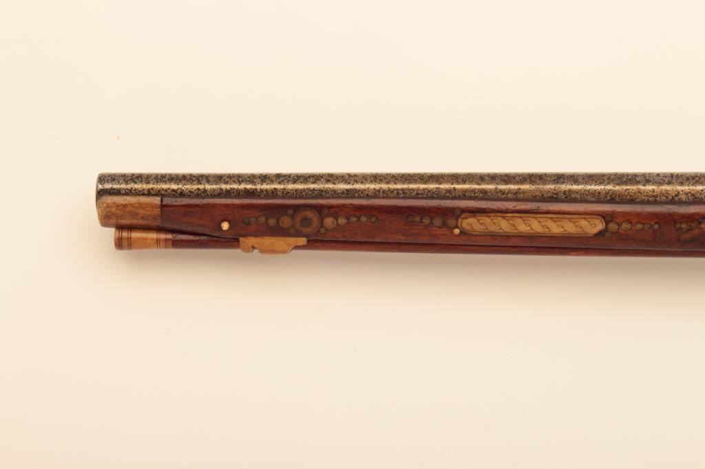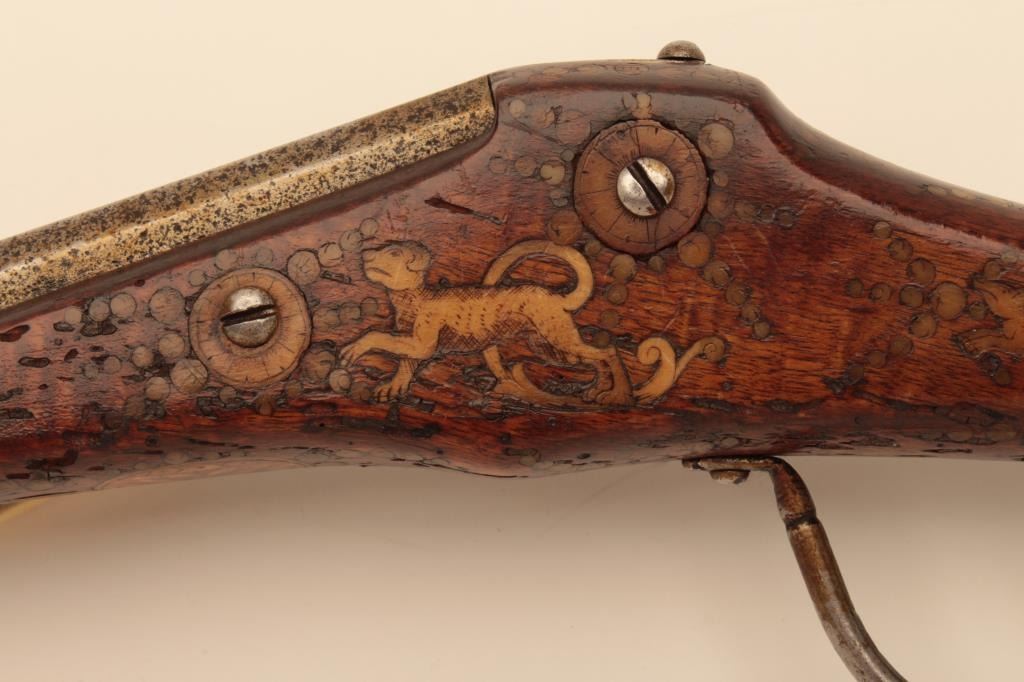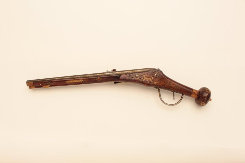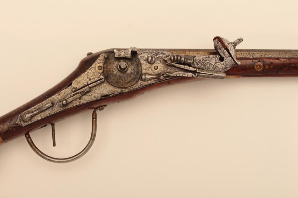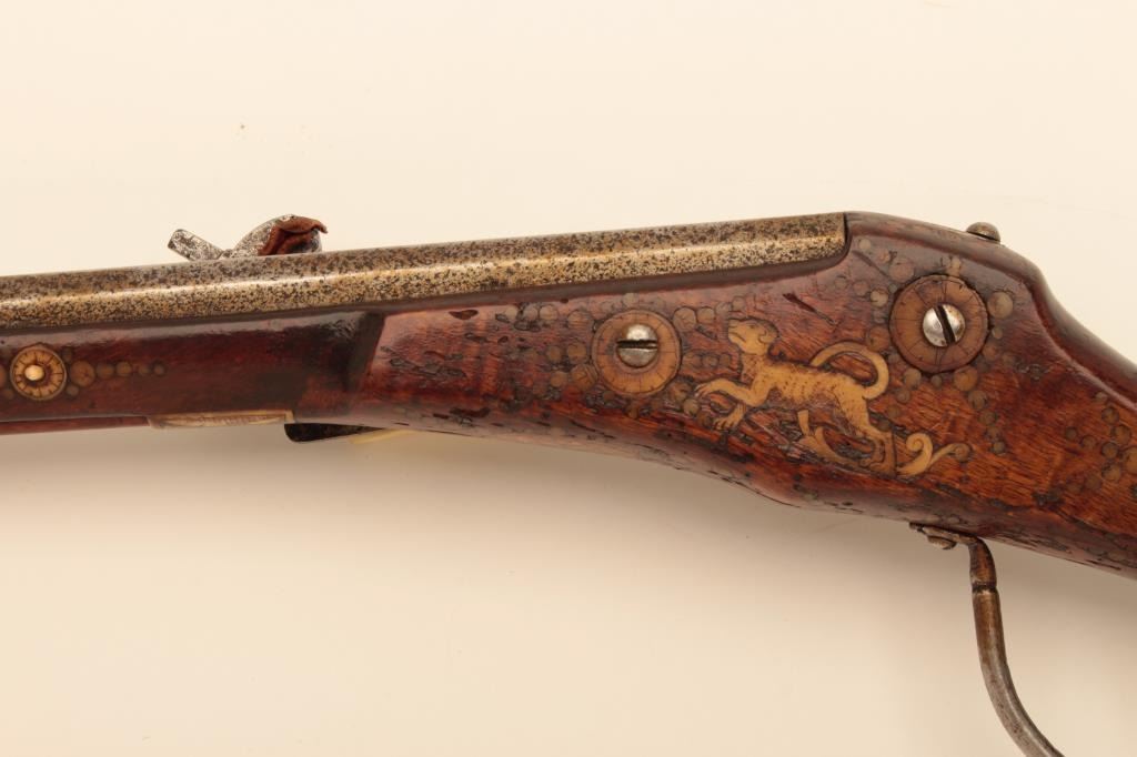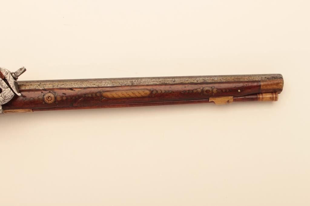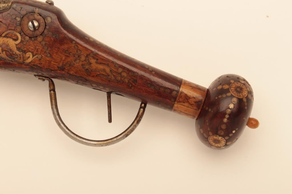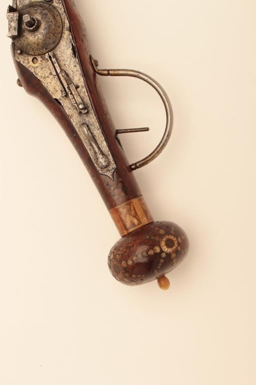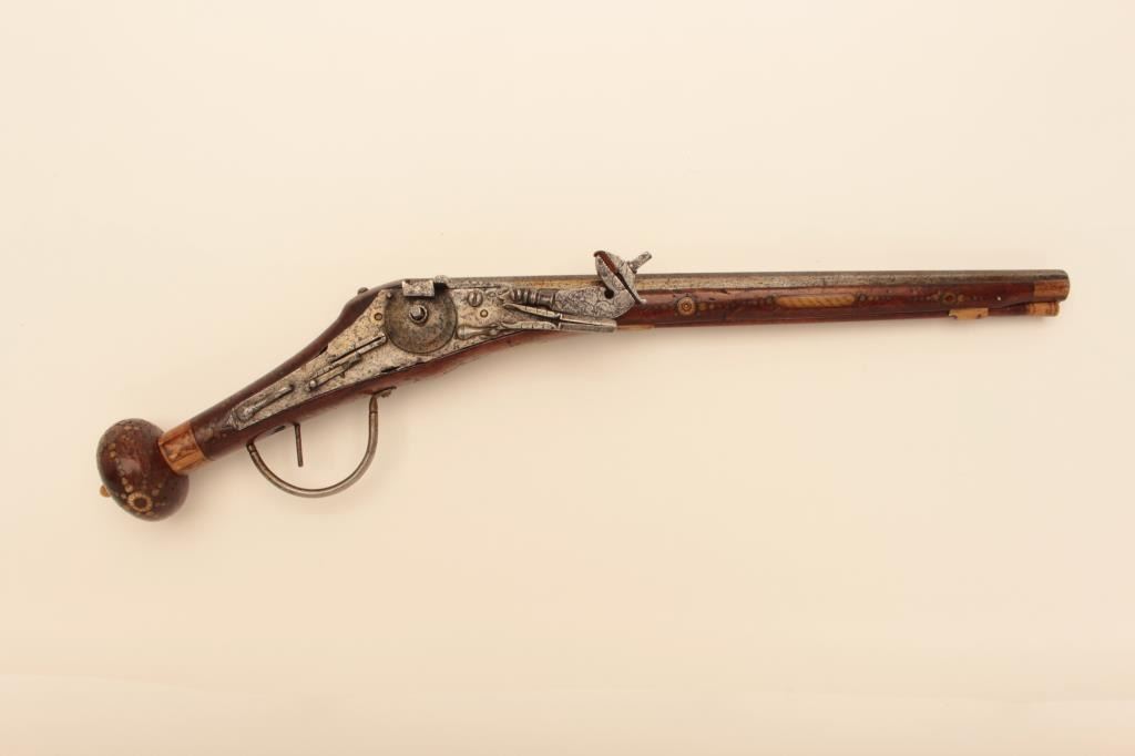 Germanic Wheelock Dag or ball butt pistol with inlaid stock, original belt hook and ramrod circa about 1600. Mechanism intact. Shows good quality engraving and piercing of wheel cover. Measure 18” overall with flared10” barrel of about .58 caliber smoothbore. The stock is near fine with small loss of wood behind the original belt hook. Inlays show a rich patina and are nearly 100% intact. The inlays are imperfect (Notperfectly round) which indicates early period. (Antique) Est.: $4,000-$8,000