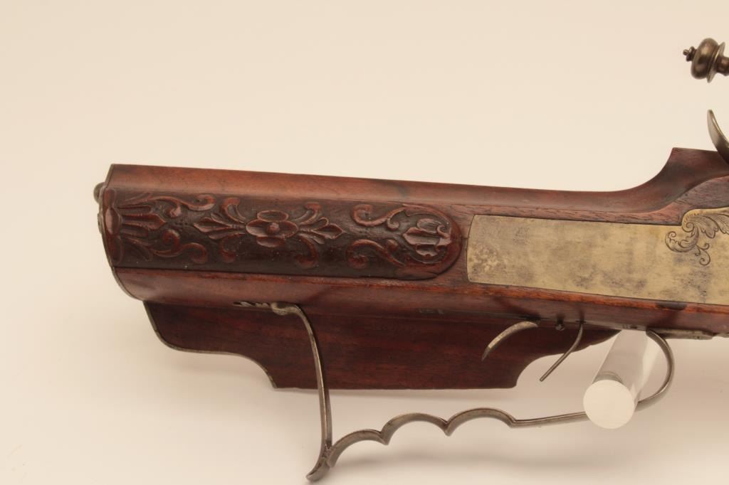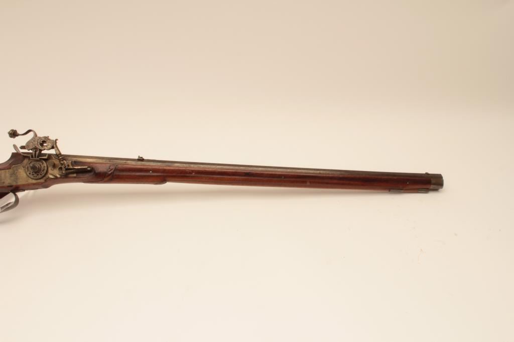 Johan Limner in Kronach (Germany) Wheelock rifle, S/N 685. High quality metal work with fine engraving and nicely carved stock. Measures 43” overall with 31 ½” barrel of .42 caliber rifled. Complete working lock andvery good to almost fine overall. (Antique) Est.: $5,000-$10,000