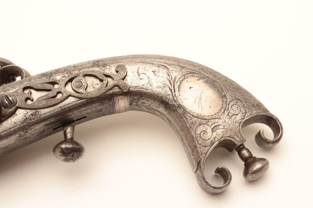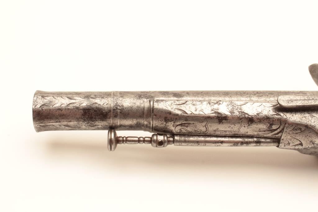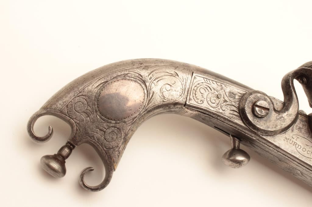 Original Scottish Flintlock pistol by Murdoch with rams horn butt and silver inlay. Measures 12” overall with a 8” barrel of .60 caliber smoothbore. Original belt hook and ramrod. Correct flintlock small parts. Goodperiod engraving and stock and barrel. Thomas Murdoch of Doune, Scotland circa 1770-1780’s. Like famous Pitcairn pistol that fired 1st shot in Revolution. Minor pitting and normal aging. (Antique) Est.:$5,000-$10,000