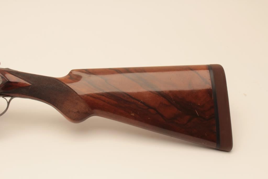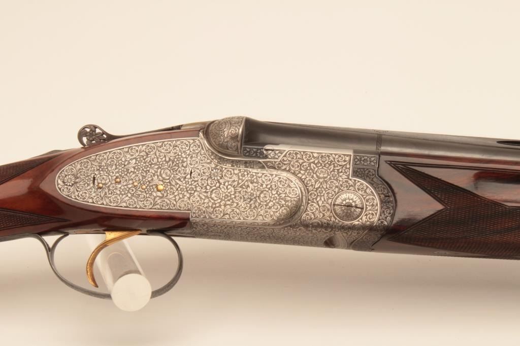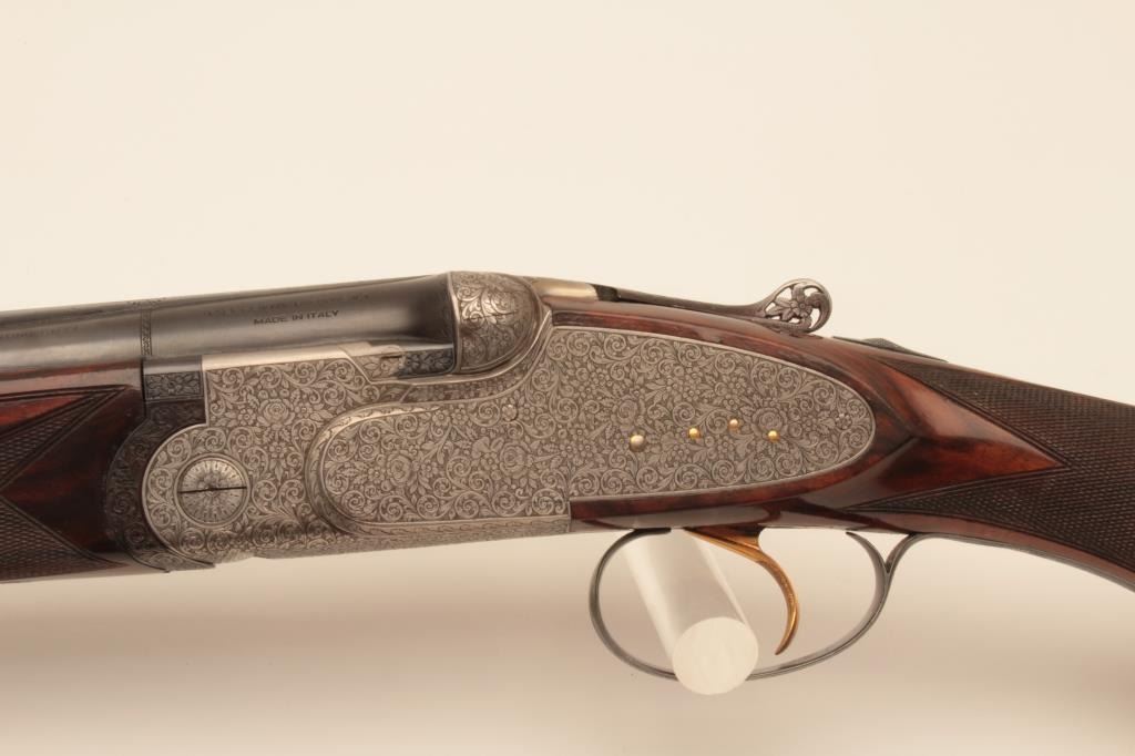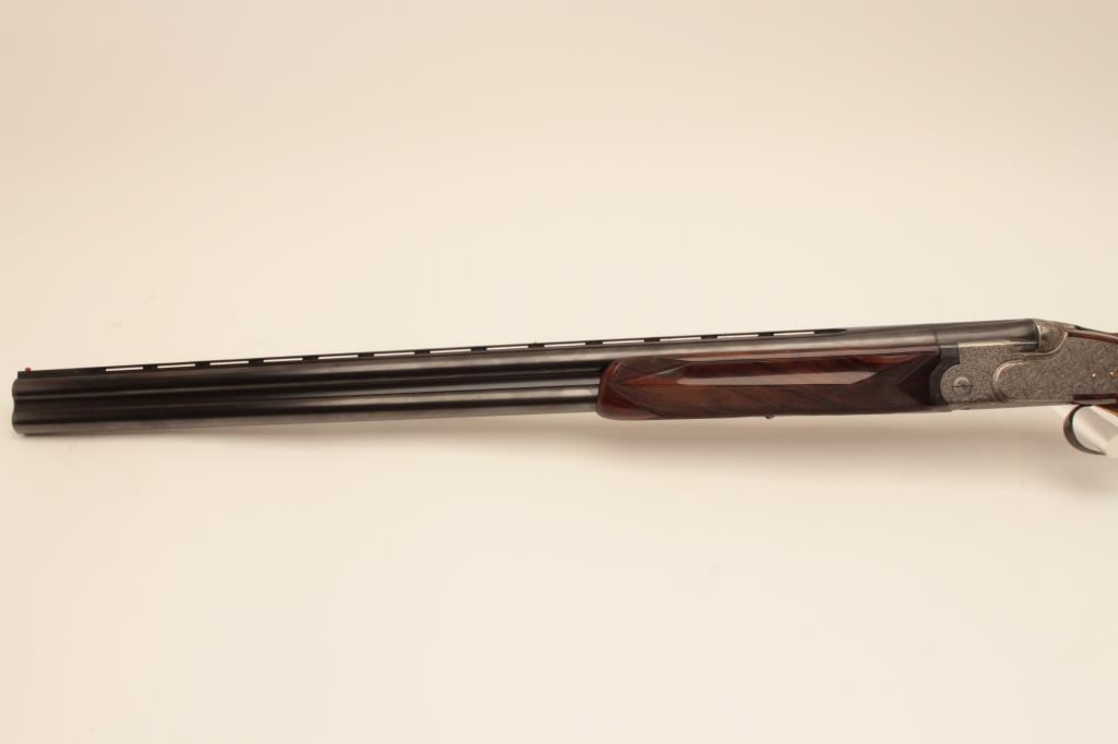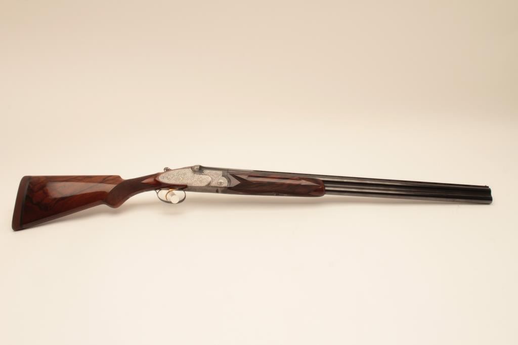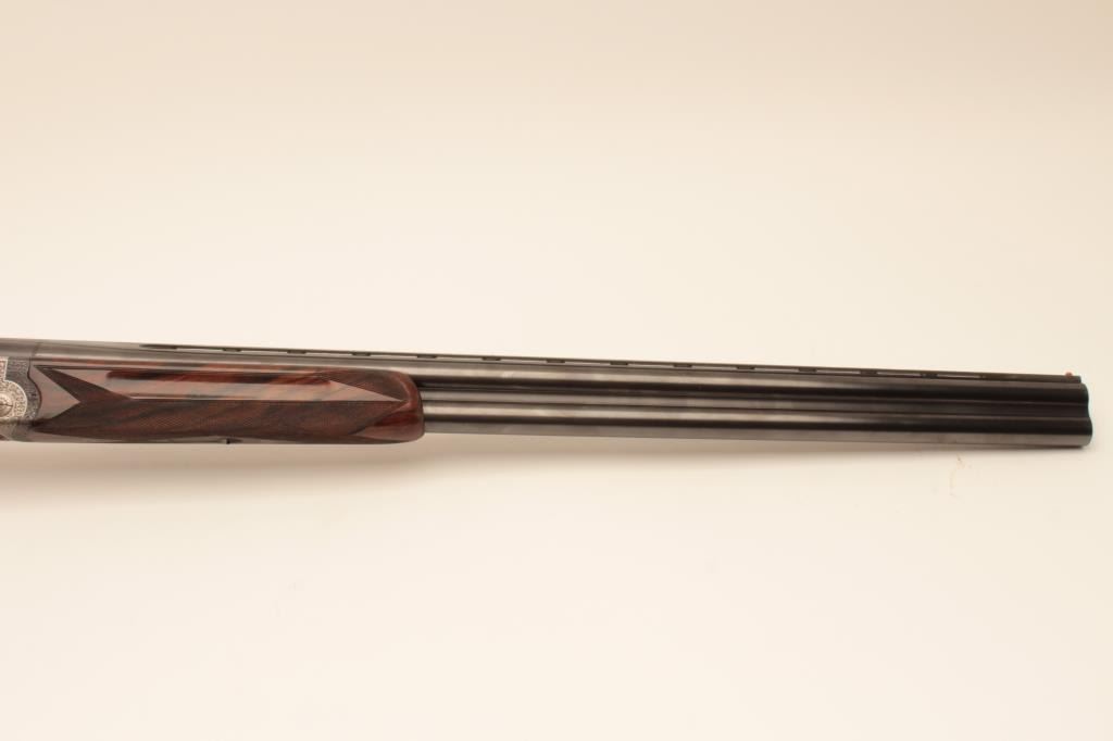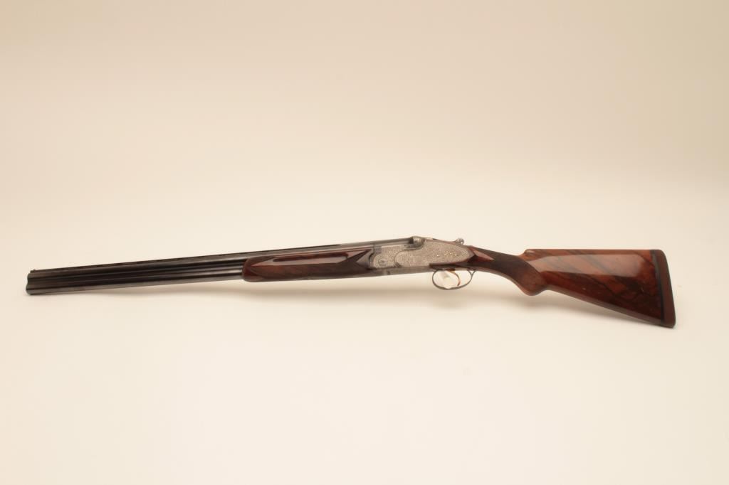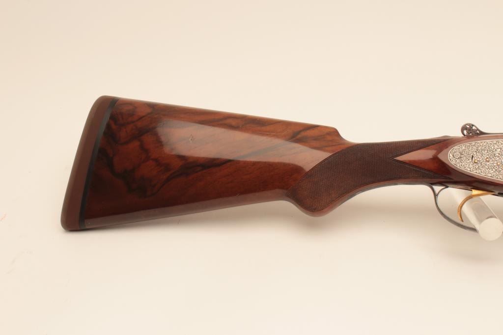 Beretta S3EELL high grade 12GA Over/Under shotgun with hand detachable side plates, S/N 29272. The barrels measures 28” with low rise vent rib, single trigger, auto ejectors, pierced lever, gold plated appointments, and fine tight scroll deluxe engraving signed “A. Baglioni”. Choked modified over improved modified. Very good plus used condition with 95% plus original finish on the barrels and satin gray on the frame. The stocks are alsovery good plus with minor scratches, mars, and dings. Measure 14” to the end of the rubber pad. Beretta case is included. A very high grade gun showing early quality. The bores are bright and locks like a vault.(Modern) Est.: $5,000-$10,000