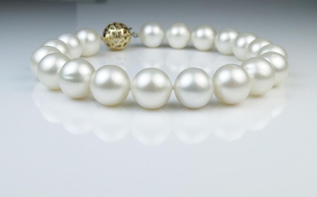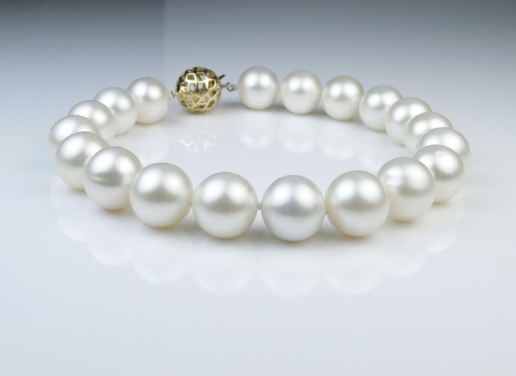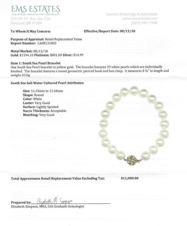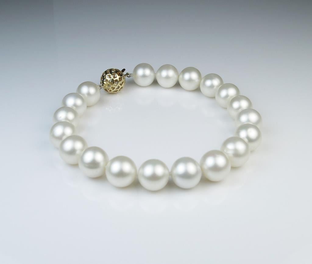 High quality South Sea Pearl bracelet with 12.00 mm dia. Pearls rich white color and luster with fine 14 karat yellow gold clasp. Matches Lot #7 Pearl Necklace. Full Retail Appraisal at $11,000.00 Estimates$3,000-$5,000