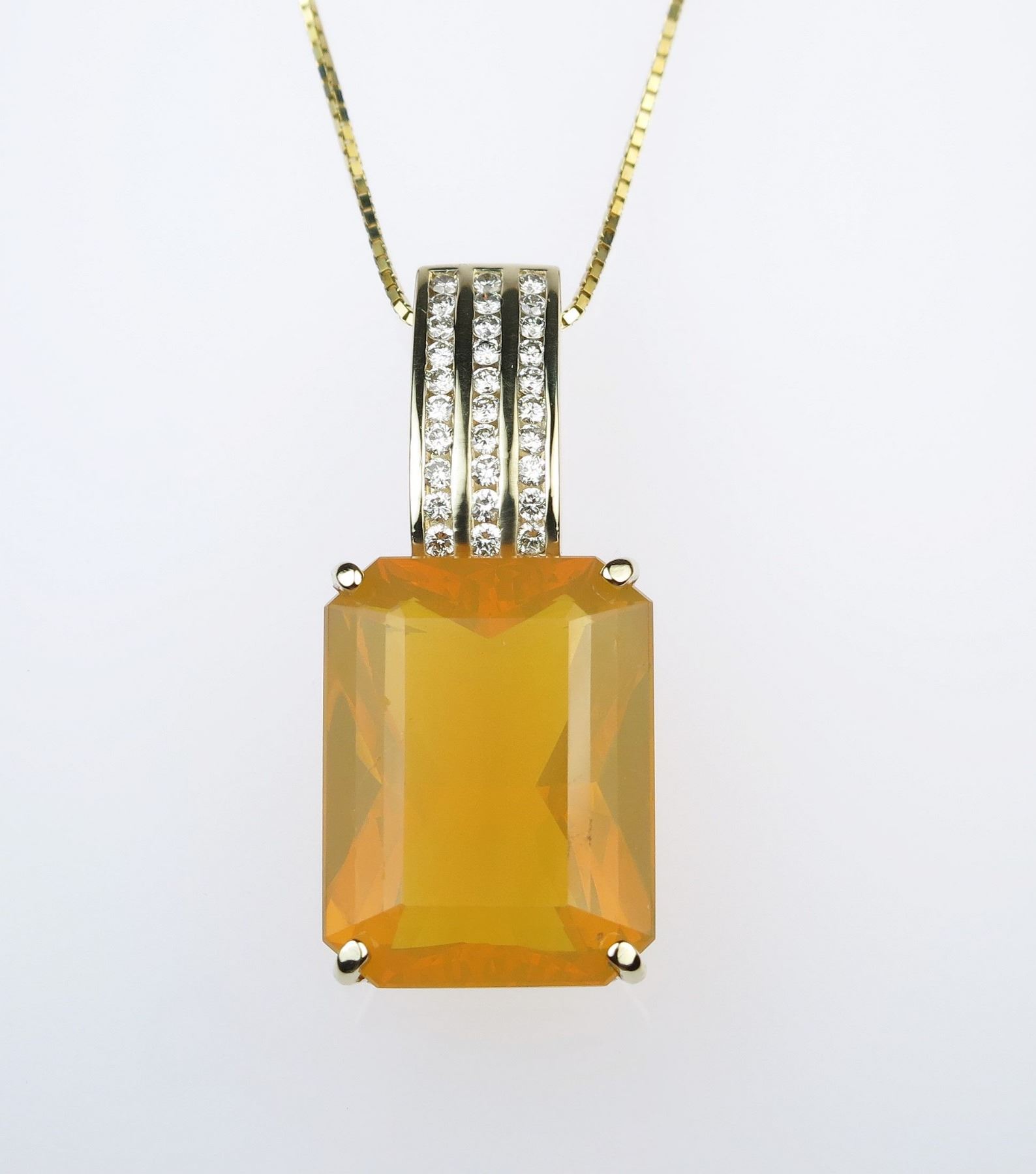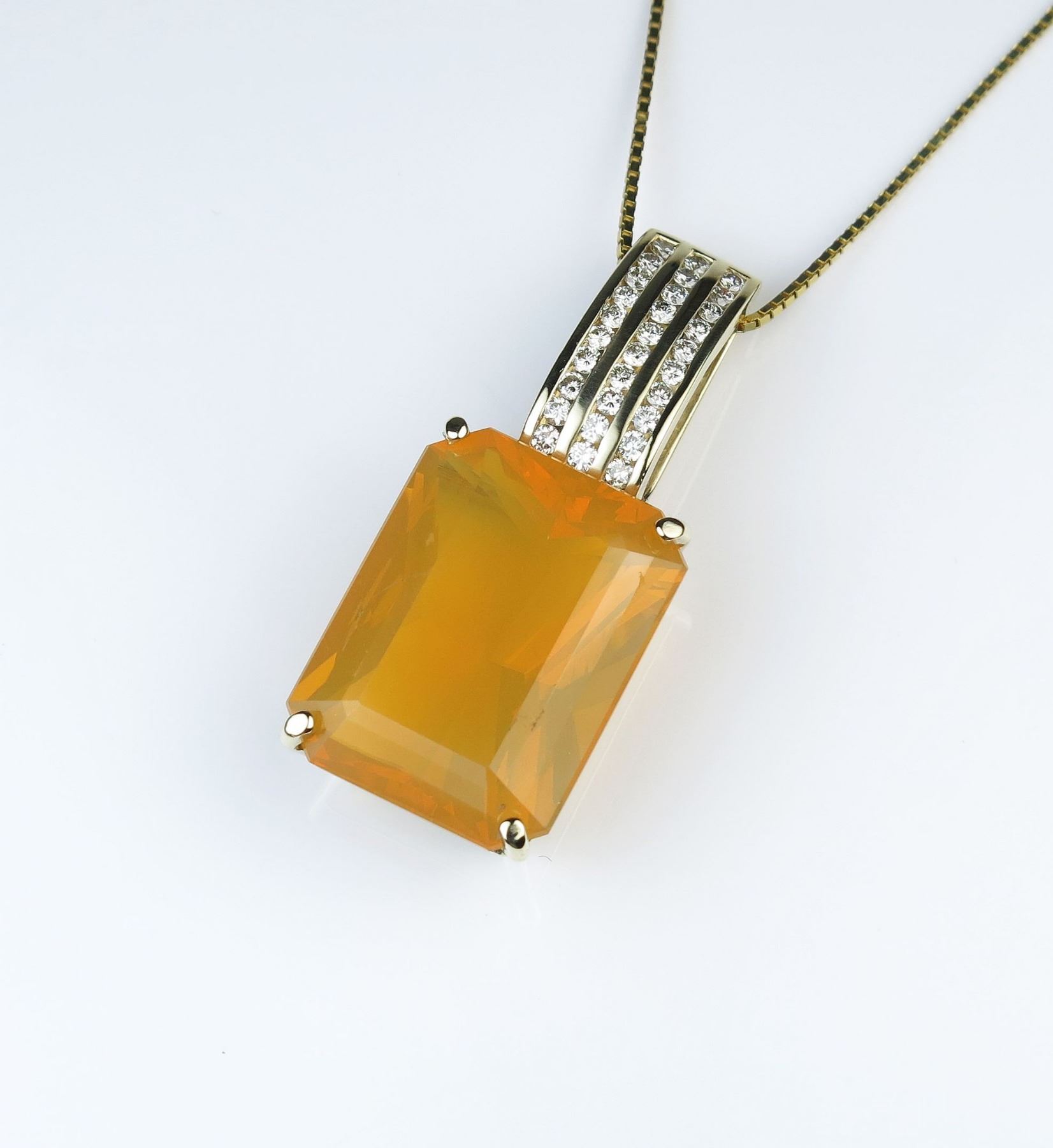 Spectacular 27.52 carat Orange Fire Opal and Diamond Pendant accented with 30 ‘IDEAL’ cut Diamonds weighing approx. 1.20 carats of F-G colors and VS clarity all set in a 14 karat yellow gold custom made setting. Retail$7,000-$9,000 Estimates 3,000-$4,000