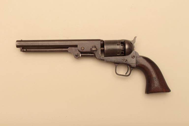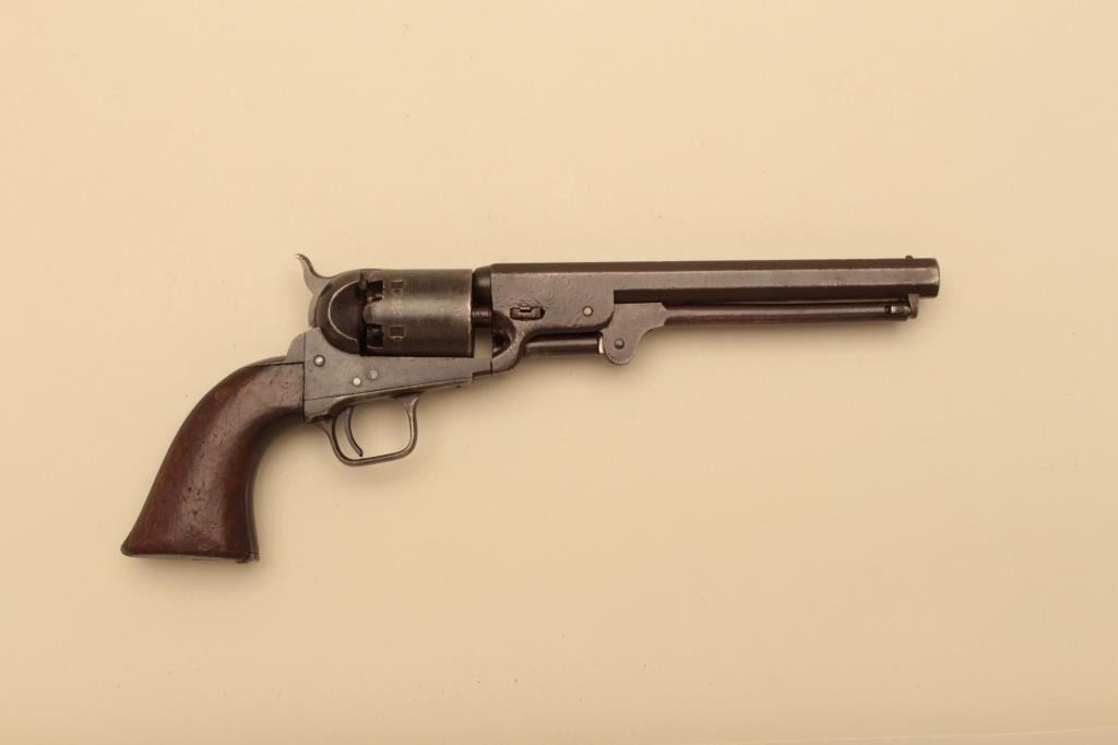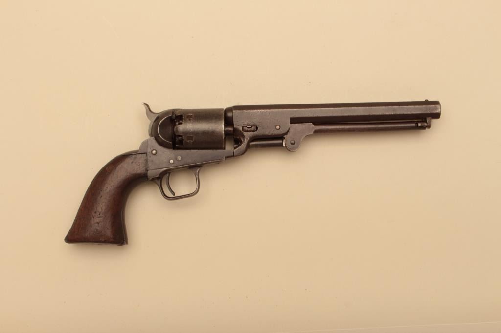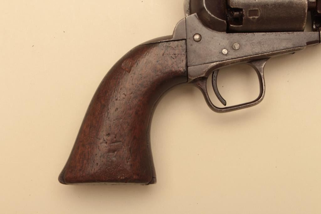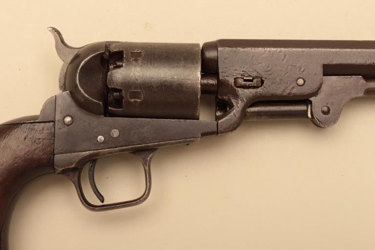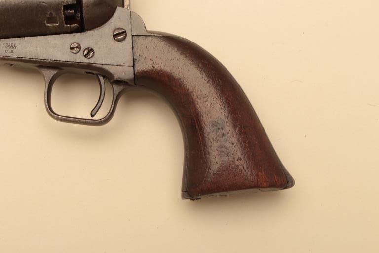 Colt 1851 Navy revolver with desirable Navy markings, S/N 59713. Large U.S.N. marking with J.L.H. inspectors initials. Dark brown patina finish with wear and mars showing. The barrel address and U.S. and Colt markinggood on the frame. The cylinder shows wear on the nipples and a gap between cylinder face and barrel. Matching visible numbers. The grips are fair with chips and loss at the toes and edges. The action cocks but thecylinder does not revolve. A significant variation in the 1851 Navy series. Sought by Colt, Civil War, and Martial collectors. “Damn the torpedoes full speed ahead!”. (Antique) Est.: $2500-$5000
