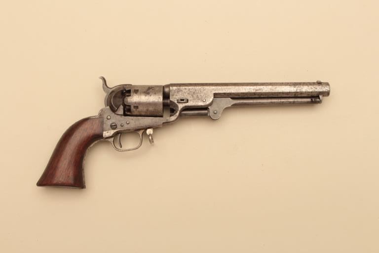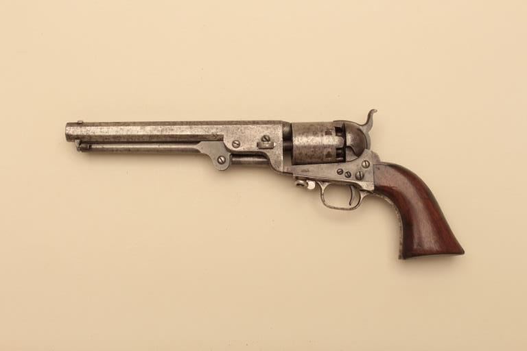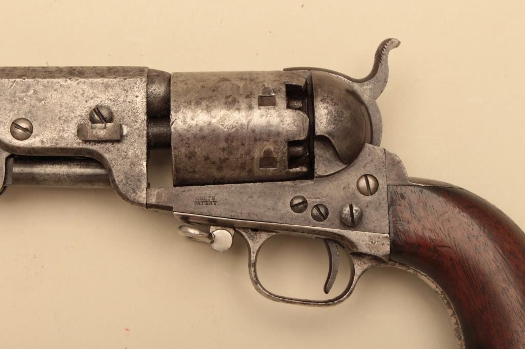 Colt 1851 Navy 4 screw cut for shoulder stock with small iron guard and swivel, S/N 74628. Good to very good overall condition showing patina finish with traces of case colors mixed in. Minor pitting and erosion withfairly sharp edges and good markings. 30%-50% silver on guard and back strap. The grips are good to very good with 30%-50% varnish remaining. Small loss at the left toe and minor aging (Great fit). 10%-20% cylinderscene remains and all matching visible serial numbers. The butt strap is scratch engraved “DBe Im BWR” which we cannot decipher meaning. The action works. A significant variation in 1851 series not oftenencountered. (Antique) Est.: $4000-$8000