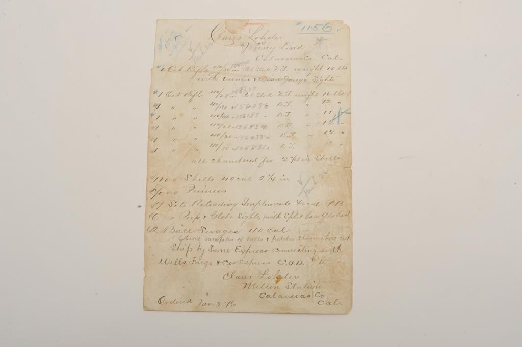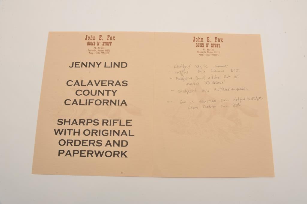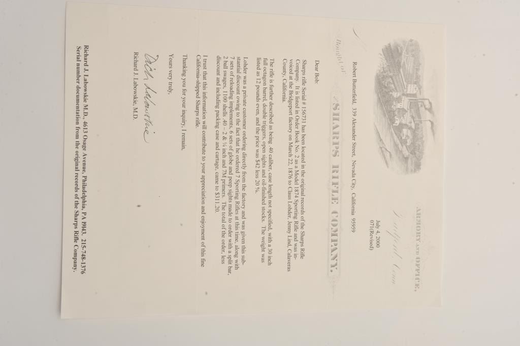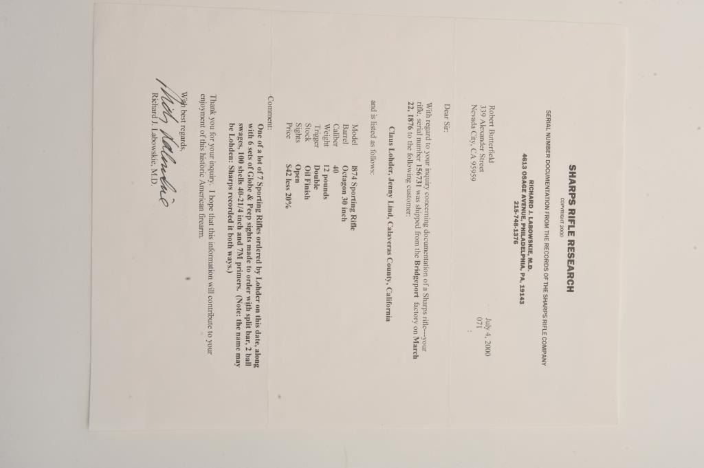 Sharps Model 1874 Sporting rifle, .40 caliber, 30” octagon barrel, double set triggers (working at time of description), wood stocks, S/N 156731 (matching barrel S/N). This gun is in overall good conditionwith a dark patina to metal surfaces, good bore, crisp action, good markings and good wood showing normal wear from carry and storage with scattered old mars and aging. Accompanied by a factory letter confirmingfeatures and indication a listed weight of 12 pounds even. The letter further notes the invoicing from the factory to be on March 22, 1876 to Claus Lohder, Jenny Lind, Calaveras County, California. It is further stated inthe letter that Lohder was a private customer ordering directly from the factory and was given a substantial discount ($42 less 20%) owing to the fact that he ordered 7 Sporting Rifles at that time along with a considerable amount of accessories, shells and primers (total cost of order: $311.20). Importantly, also included are 5 rarely available original handwritten correspondences to the Sharps Co. from Lohder covering his request