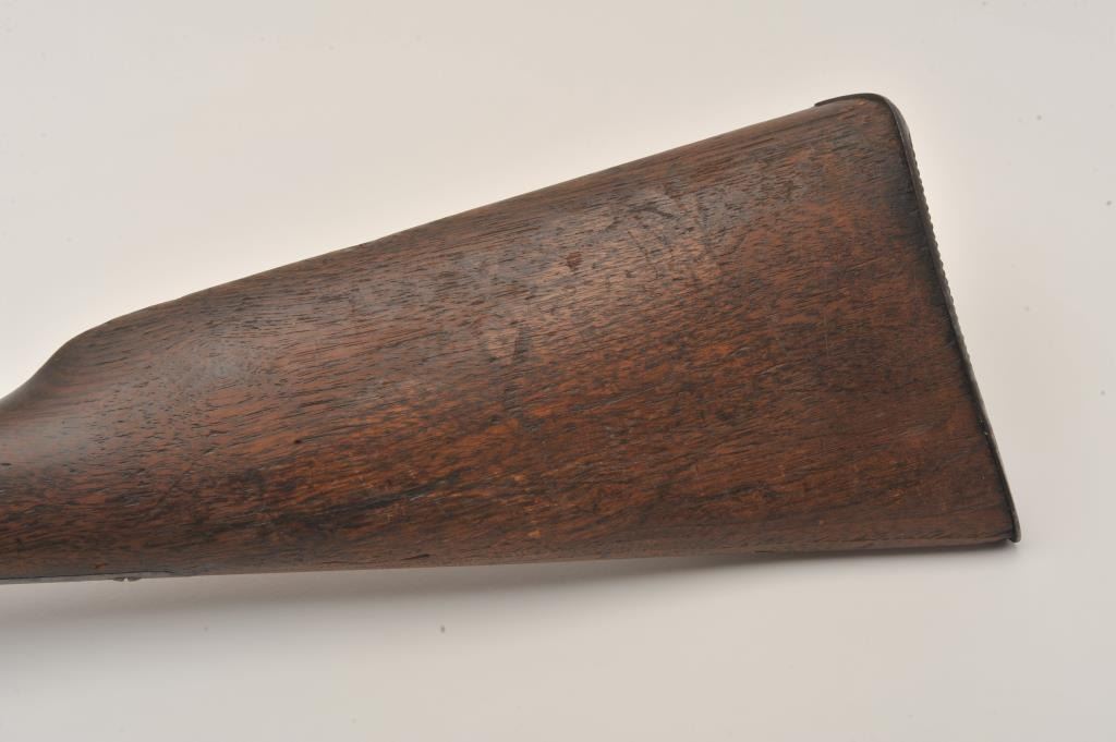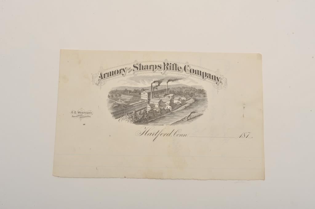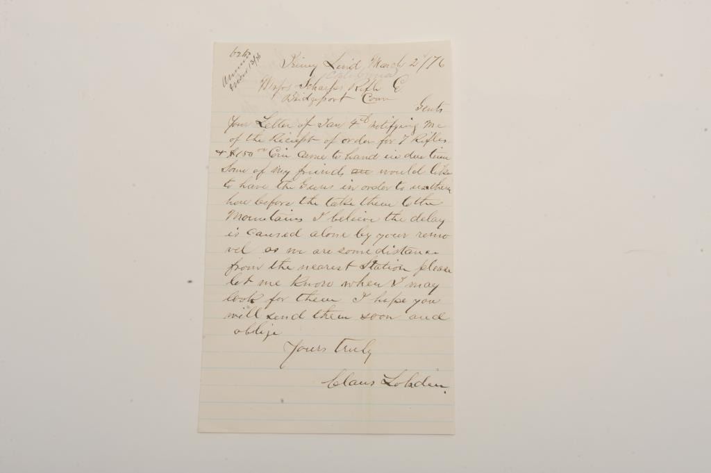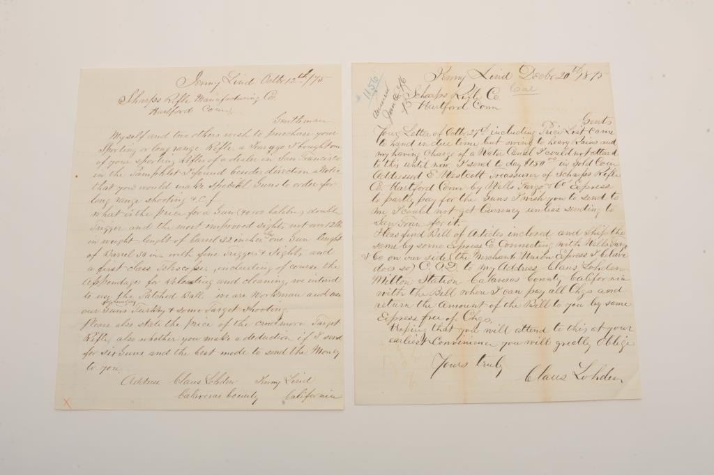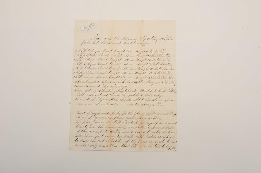 Sharps Model 1874 Sporting rifle, .40 caliber, 30” octagon barrel, double set triggers (working at time of description), wood stocks, S/N 156731 (matching barrel S/N). This gun is in overall good conditionwith a dark patina to metal surfaces, good bore, crisp action, good markings and good wood showing normal wear from carry and storage with scattered old mars and aging. Accompanied by a factory letter confirmingfeatures and indication a listed weight of 12 pounds even. The letter further notes the invoicing from the factory to be on March 22, 1876 to Claus Lohder, Jenny Lind, Calaveras County, California. It is further stated inthe letter that Lohder was a private customer ordering directly from the factory and was given a substantial discount ($42 less 20%) owing to the fact that he ordered 7 Sporting Rifles at that time along with a considerable amount of accessories, shells and primers (total cost of order: $311.20). Importantly, also included are 5 rarely available original handwritten correspondences to the Sharps Co. from Lohder covering his request