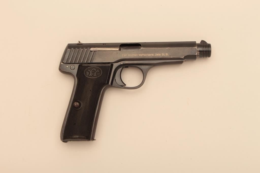 Rare Walther Model 6 semi automatic pistol, #821, 9mm, 4 3/4" barrel, blued finish with checkered logo grips. Pistol remains in near excellent condition, with 92-95% original finish, very good grips with no cracks orlosses, crisp action and very good bore. Walther's first full size pistol. Very few manufactured, and almost never seen in this condition. One correct mag. Includes a hand fitted wooden case. (C&R/PPT) Est.$4000-8000