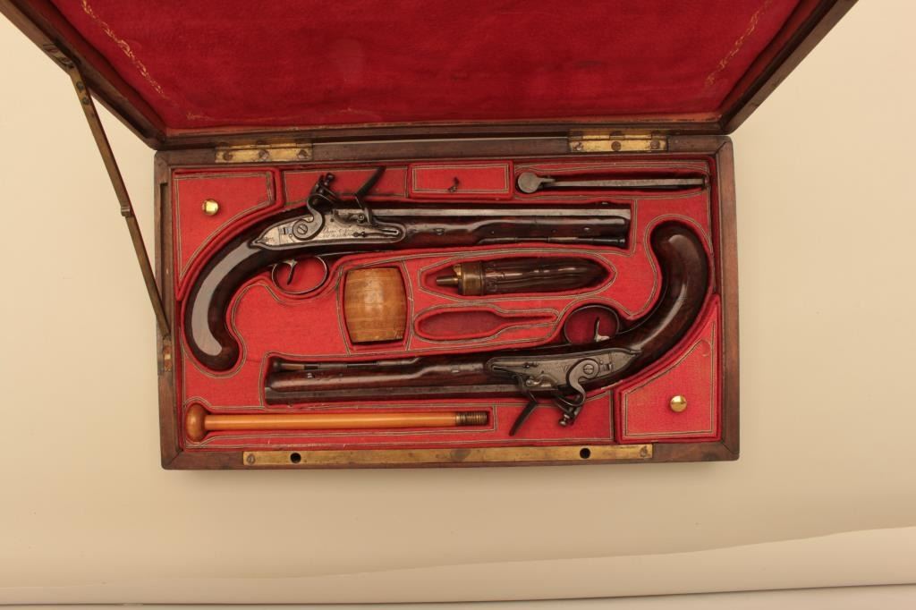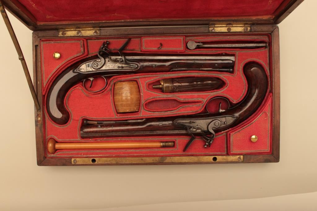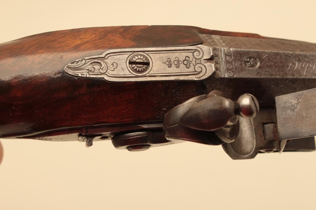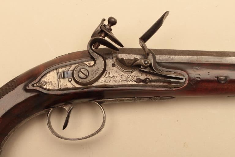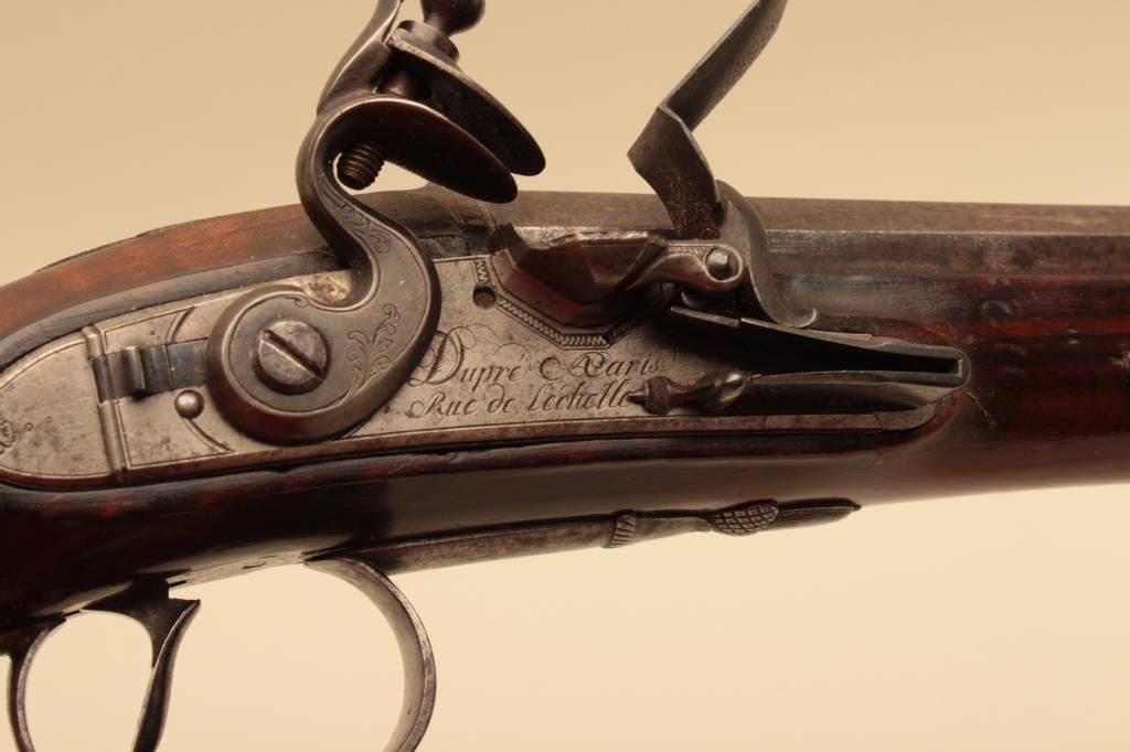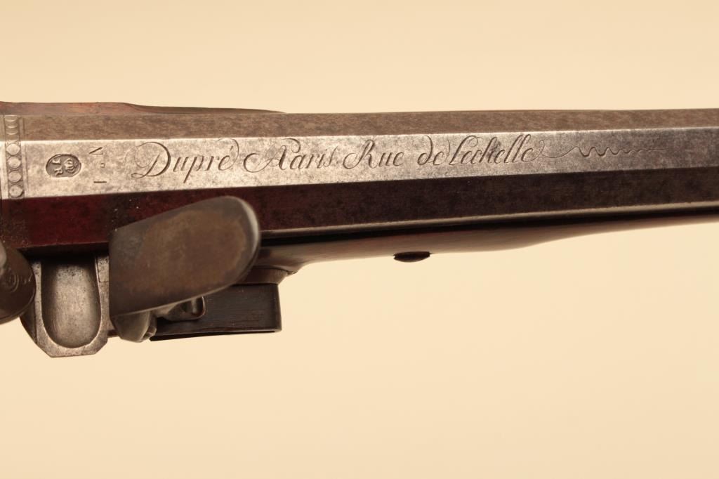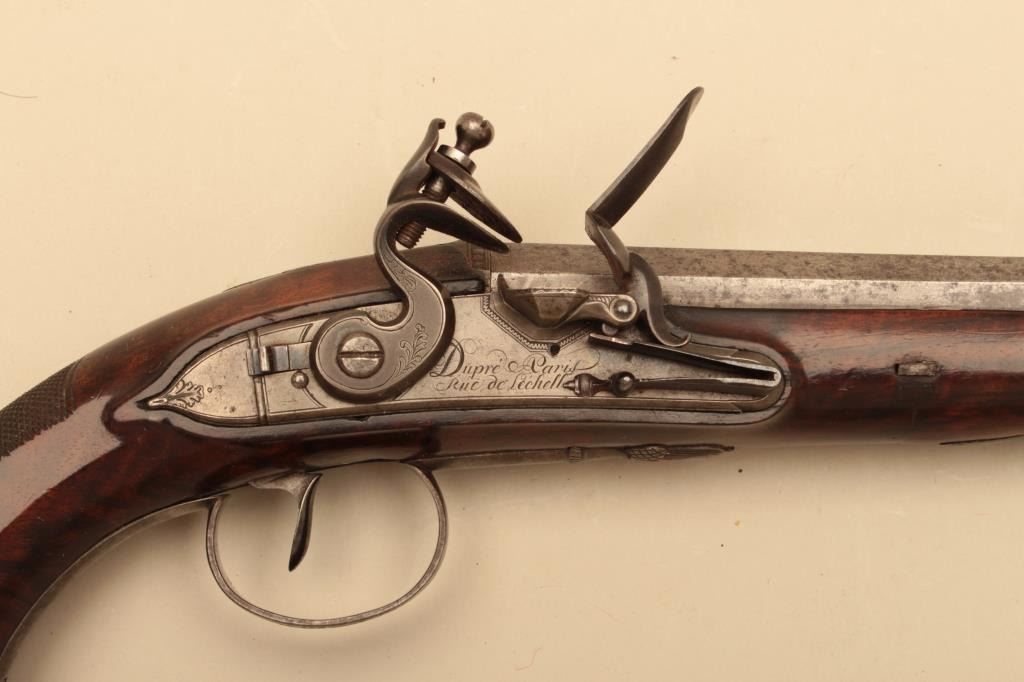 Pair of French flintlock dueling pistols with English form signed “Agustine Dupre Paris”. Dupre was a famous artist, dye maker and gunsmith responsible for striking Ben Franklin medallion after Revolutionary Warand engraved medallions and designed coins. He was the maker to French Kings replaced by Boutet. Measures 14 ½” overall with 8 ¾” barrels of .60 caliber ssmoothbore. Wood checkered select stocks. Original flintlockwith correct small parts. Good to very good overall condition with minor defects and normal aging. Original Moroccan leather and felt lined deluxe case. The case is very good plus condition. The accessories includecorrect rod and mold. Slightly later replacement flask that is near excellent. Original rod and hammer tool. Missing screw driver. The case is very good plus with original pulls and compartment covers.(Antique) Est.: $10,000-$20,000