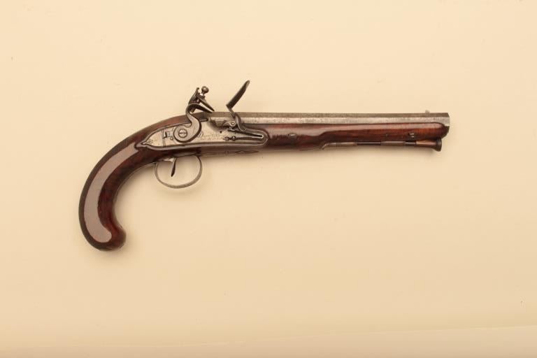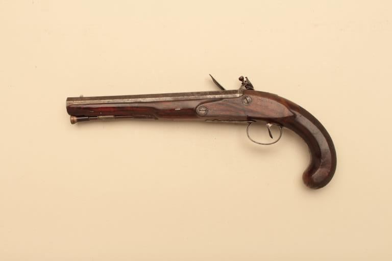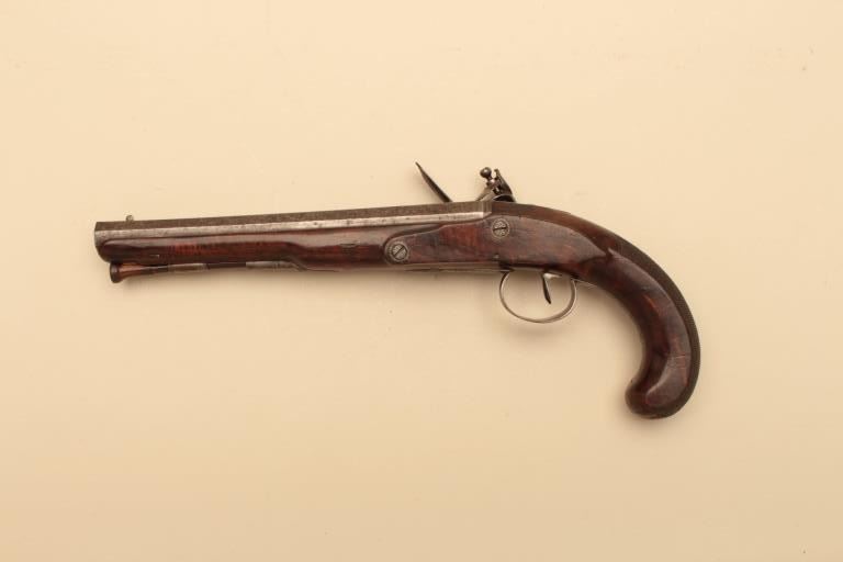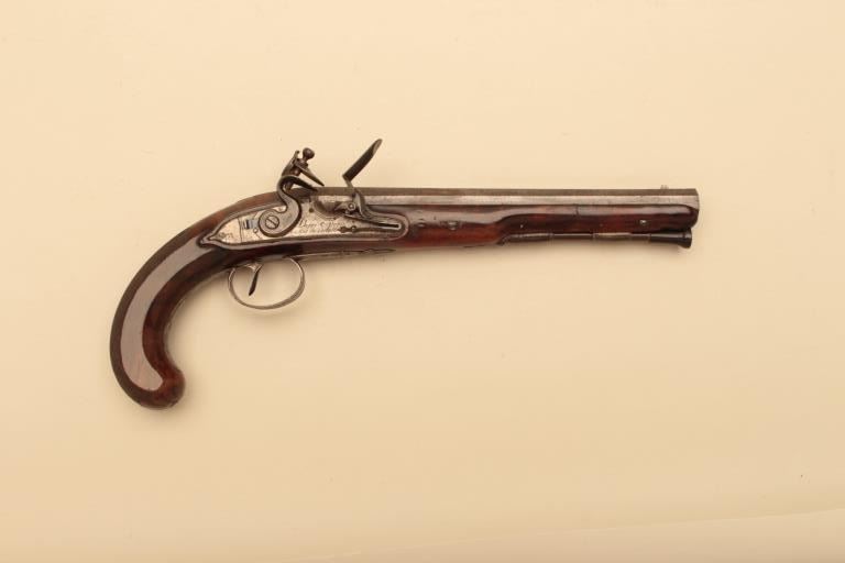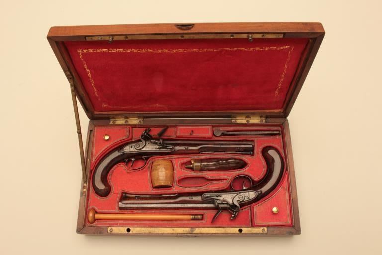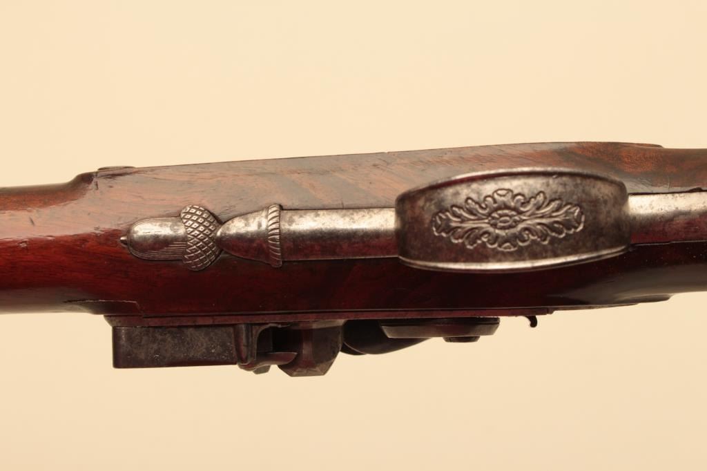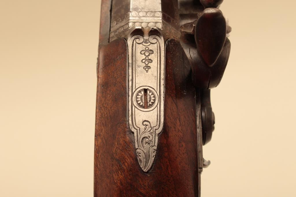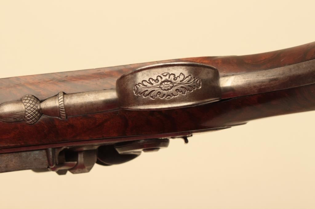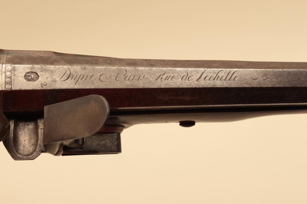 Pair of French flintlock dueling pistols with English form signed “Agustine Dupre Paris”. Dupre was a famous artist, dye maker and gunsmith responsible for striking Ben Franklin medallion after Revolutionary Warand engraved medallions and designed coins. He was the maker to French Kings replaced by Boutet. Measures 14 ½” overall with 8 ¾” barrels of .60 caliber ssmoothbore. Wood checkered select stocks. Original flintlockwith correct small parts. Good to very good overall condition with minor defects and normal aging. Original Moroccan leather and felt lined deluxe case. The case is very good plus condition. The accessories includecorrect rod and mold. Slightly later replacement flask that is near excellent. Original rod and hammer tool. Missing screw driver. The case is very good plus with original pulls and compartment covers.(Antique) Est.: $10,000-$20,000