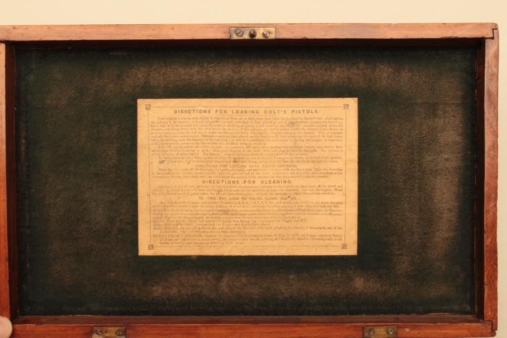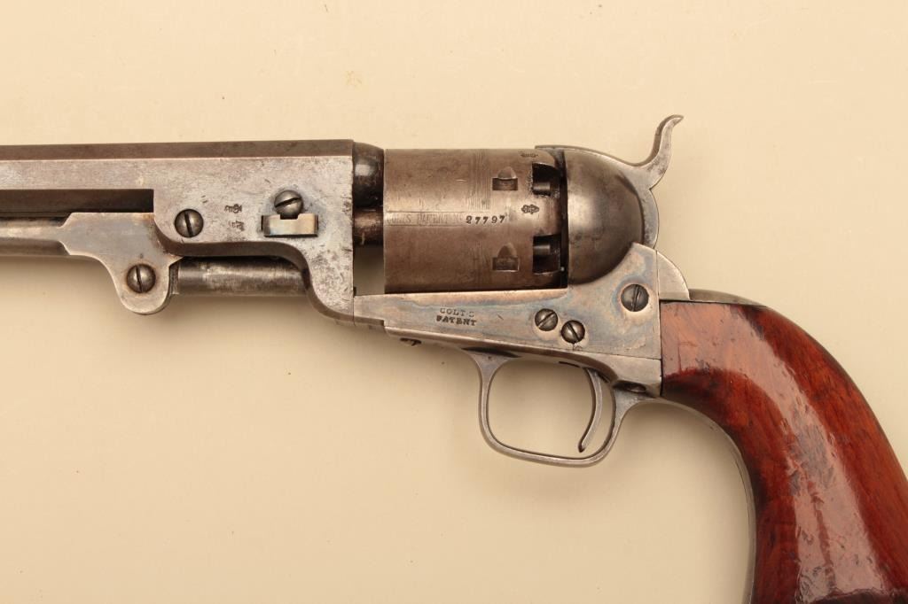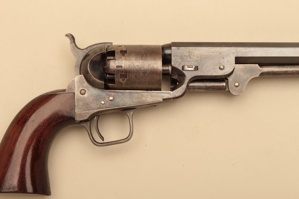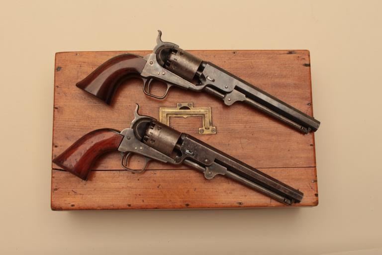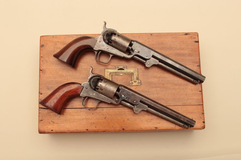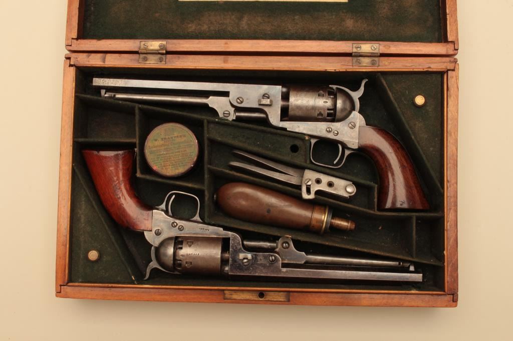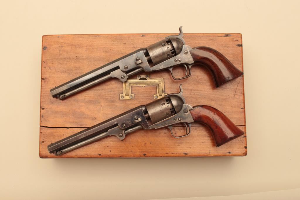 Pair of Cased Colt 1851 London Navies in .36 caliber percussion with iron trigger guard and London address, S/N 27797 & 37924. The pair are contained within an authentic to the period oak case lined in partition stylewith label in lid. Pistol # 37924 shows 75%-85% bright original blue on the barrel with some pitting on the left front of muzzle and minor scratches. The address is sharp and the edges are crisp. The cylinder shows75%-85% well defined scene with engagement dates and Colt Patent clearly visible. The cylinder shows 20%-30% thinning blue. The frame lever and hammer show 70%-80% rainbow color case hardening. Traces of blue turningplum on straps. The grips are very good plus with 80%-90% original varnish, minor marks and bruises with crisp bottom edges. All matching visible numbers. Tight action with safety pins intact. Pistol #27792 shows50%-60% original blue on the barrel with erosion just starting, marks around wedge, slight scratches and normal aging. The cylinder shows 50%-60% scene getting light with Colts Patent and engagement dates