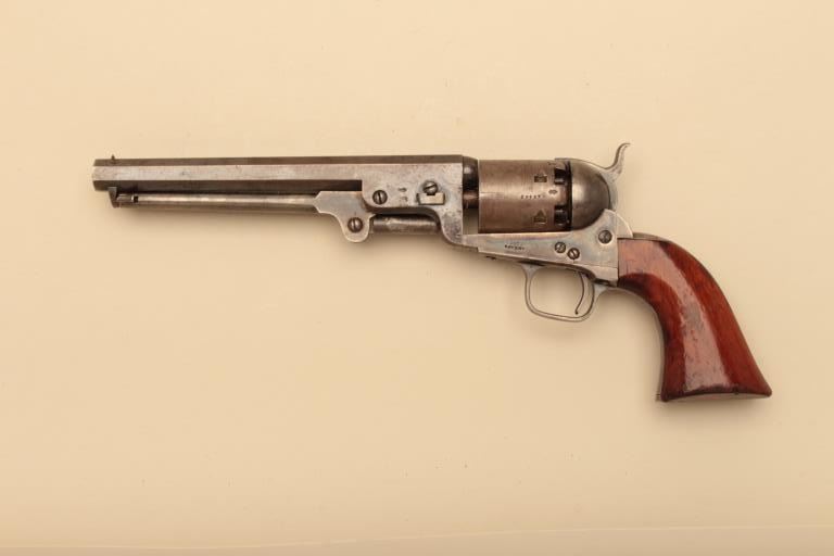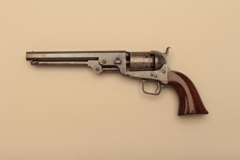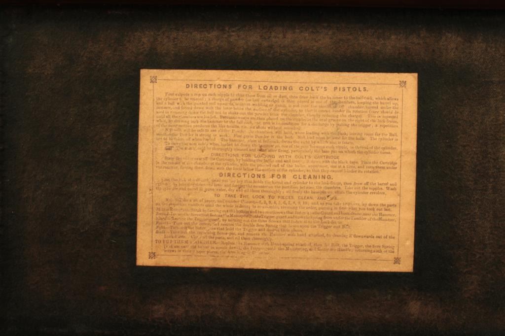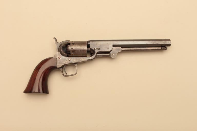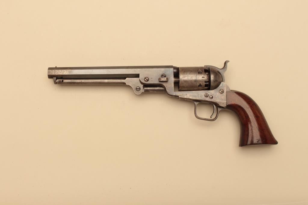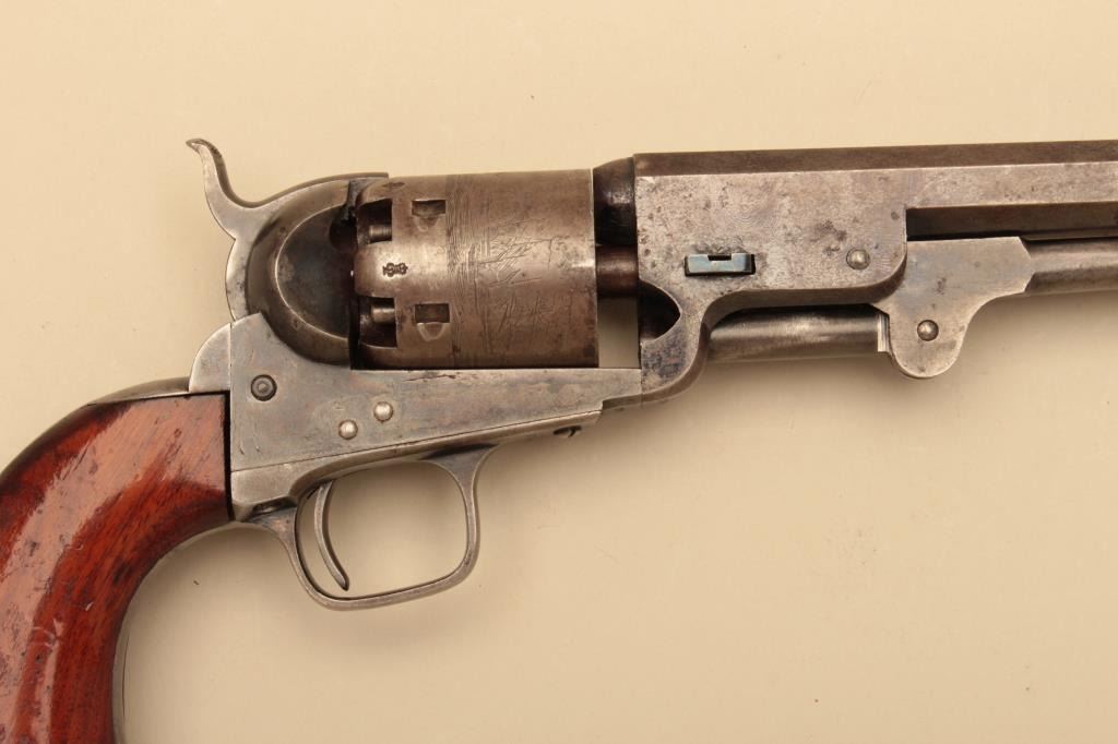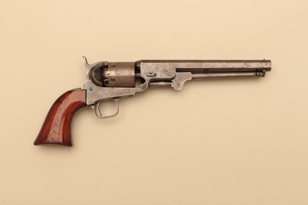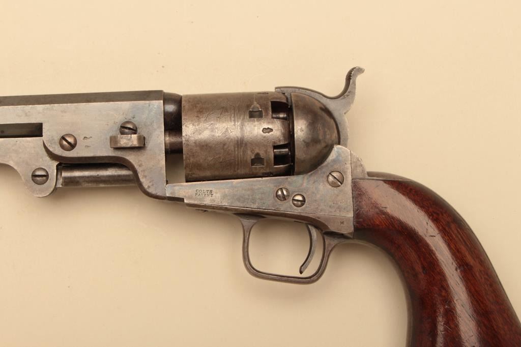 Pair of Cased Colt 1851 London Navies in .36 caliber percussion with iron trigger guard and London address, S/N 27797 & 37924. The pair are contained within an authentic to the period oak case lined in partition stylewith label in lid. Pistol # 37924 shows 75%-85% bright original blue on the barrel with some pitting on the left front of muzzle and minor scratches. The address is sharp and the edges are crisp. The cylinder shows75%-85% well defined scene with engagement dates and Colt Patent clearly visible. The cylinder shows 20%-30% thinning blue. The frame lever and hammer show 70%-80% rainbow color case hardening. Traces of blue turningplum on straps. The grips are very good plus with 80%-90% original varnish, minor marks and bruises with crisp bottom edges. All matching visible numbers. Tight action with safety pins intact. Pistol #27792 shows50%-60% original blue on the barrel with erosion just starting, marks around wedge, slight scratches and normal aging. The cylinder shows 50%-60% scene getting light with Colts Patent and engagement dates